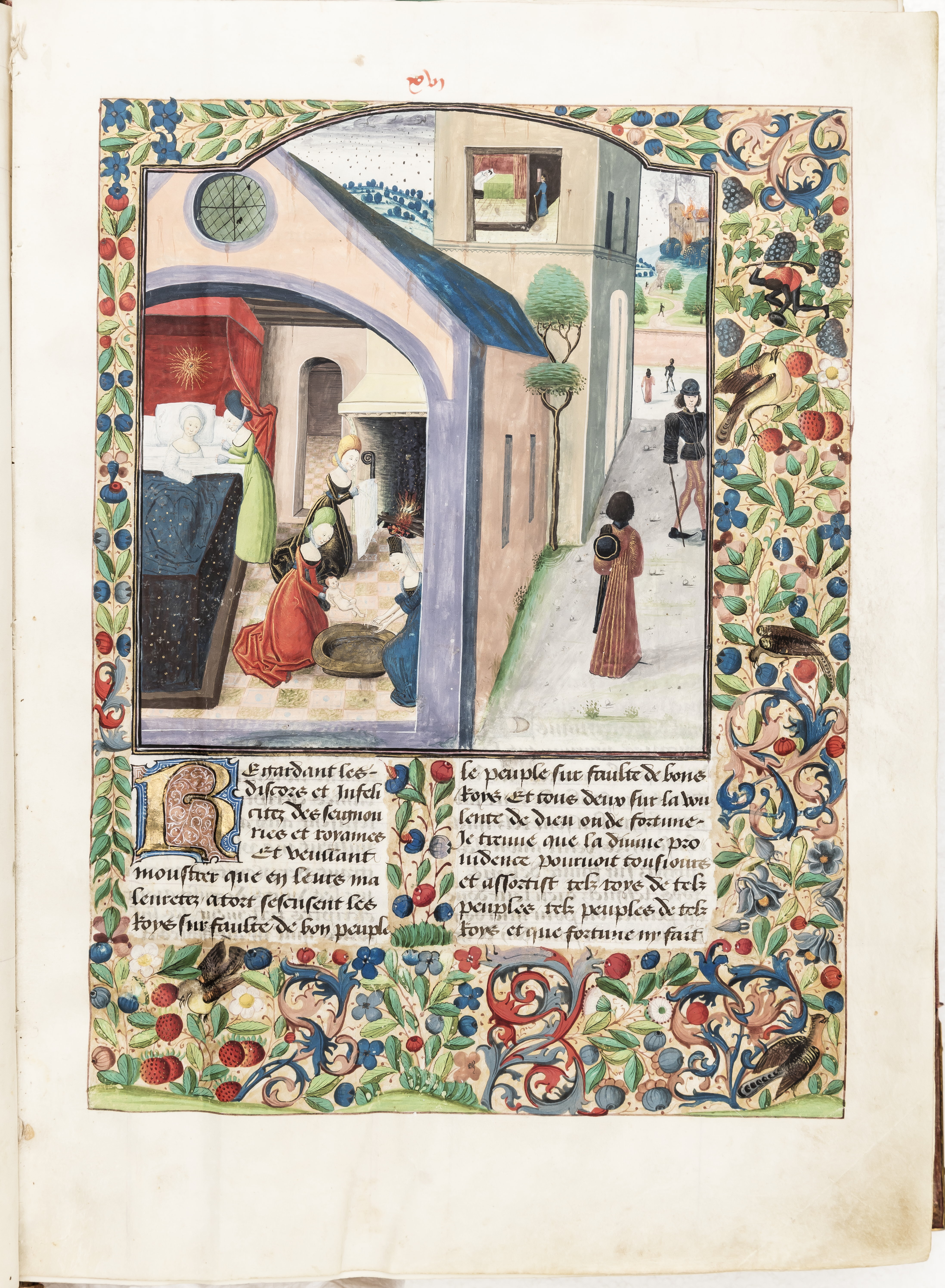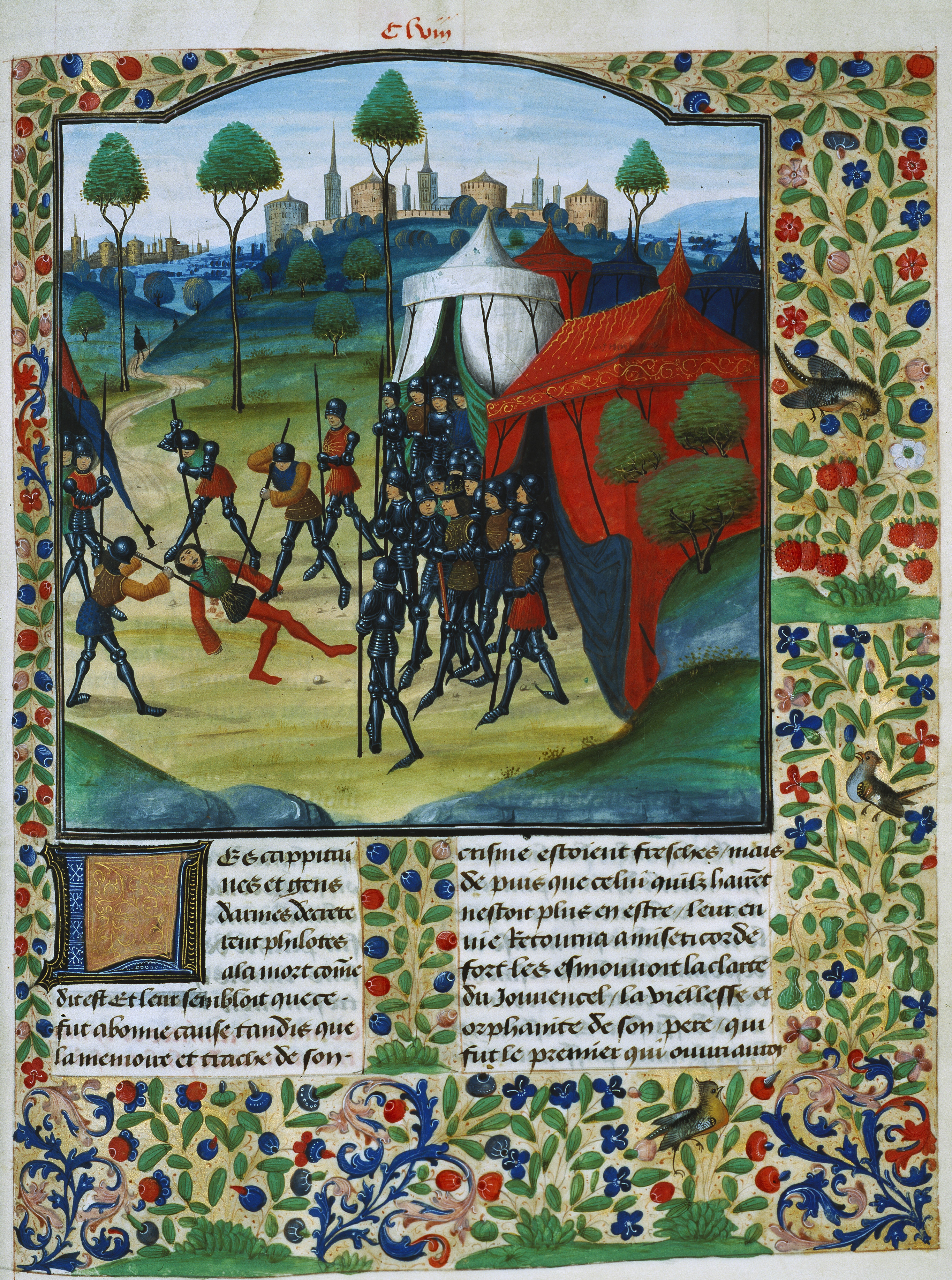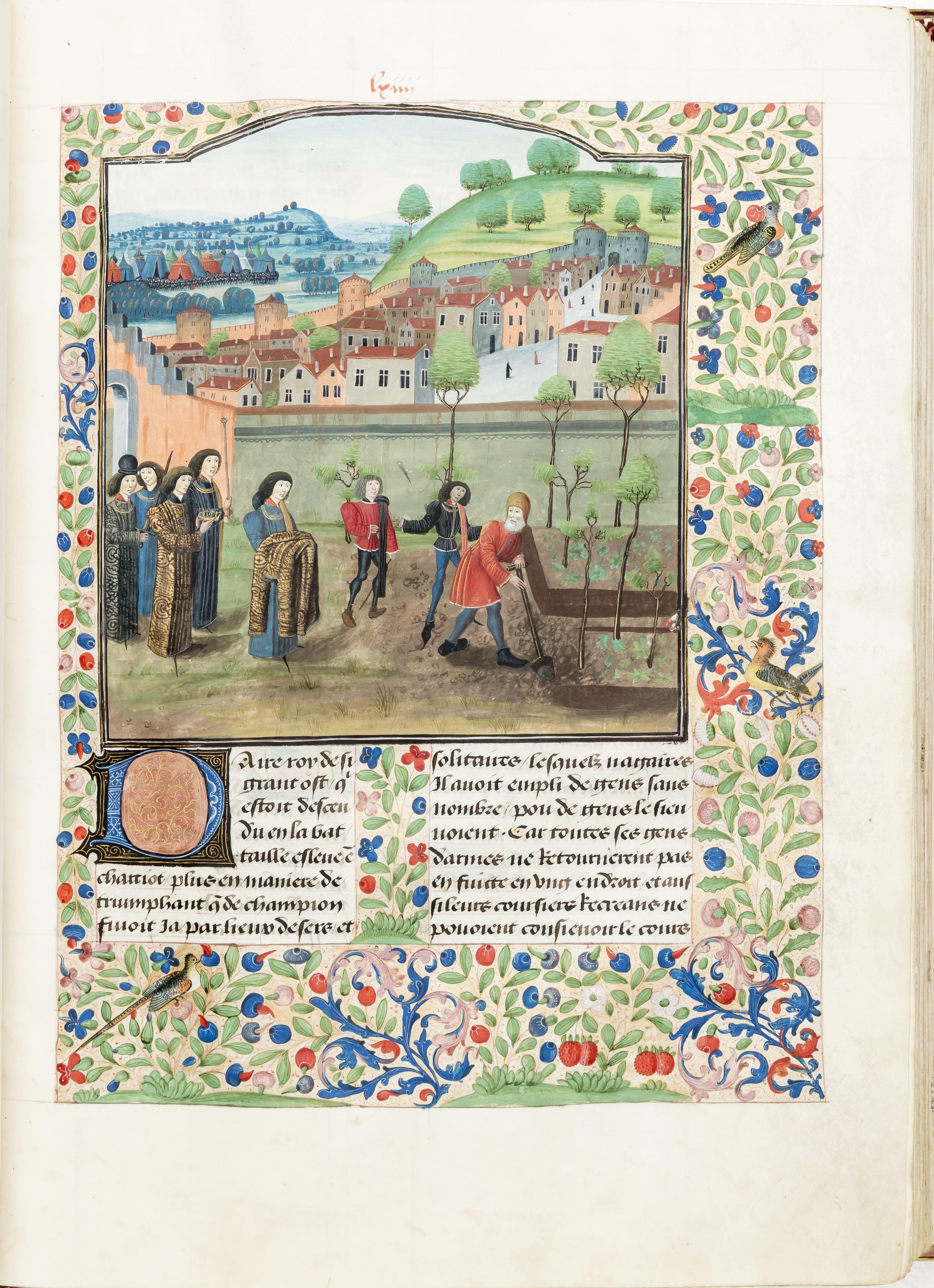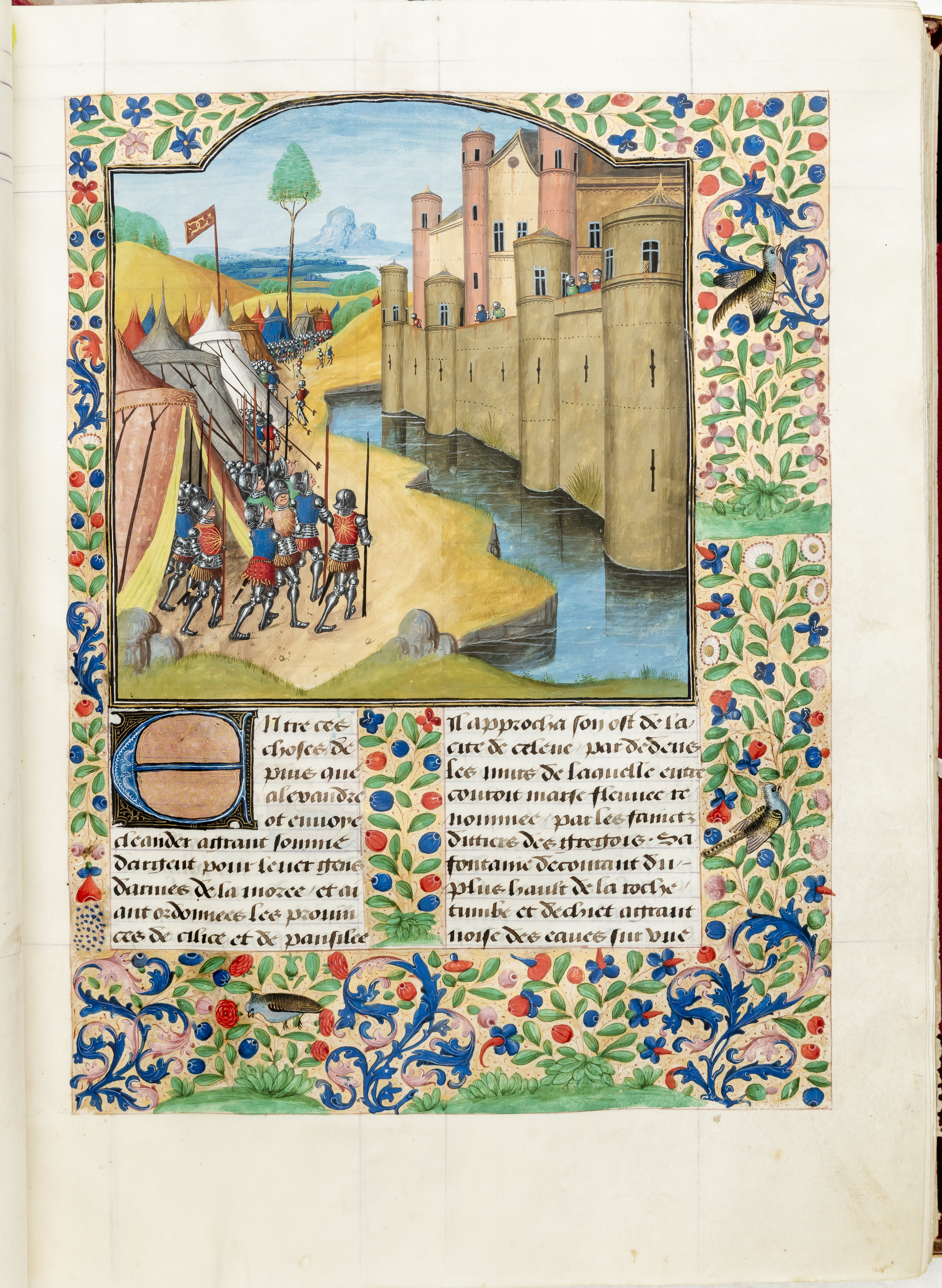 Handskrift på pergament, 232 folios, varav 8 helsidesillustrationer, skildrande Alexander den stores liv och bedrifter. Rött sammetsband m. mässingsbeslag. Titeln på mässingsplatta.