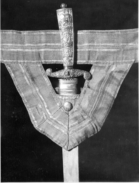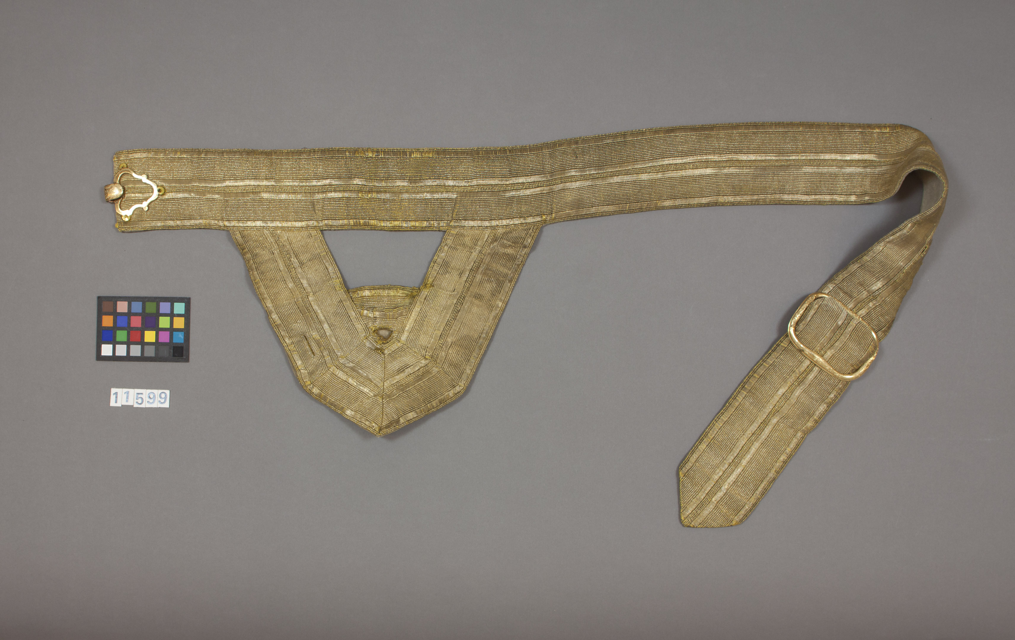 Lifgehäng af gult sämsk, öfverklädt med guldgalon, samt försedt med söljor och hake af förgyld messing. Till gehänget hörer en
