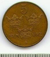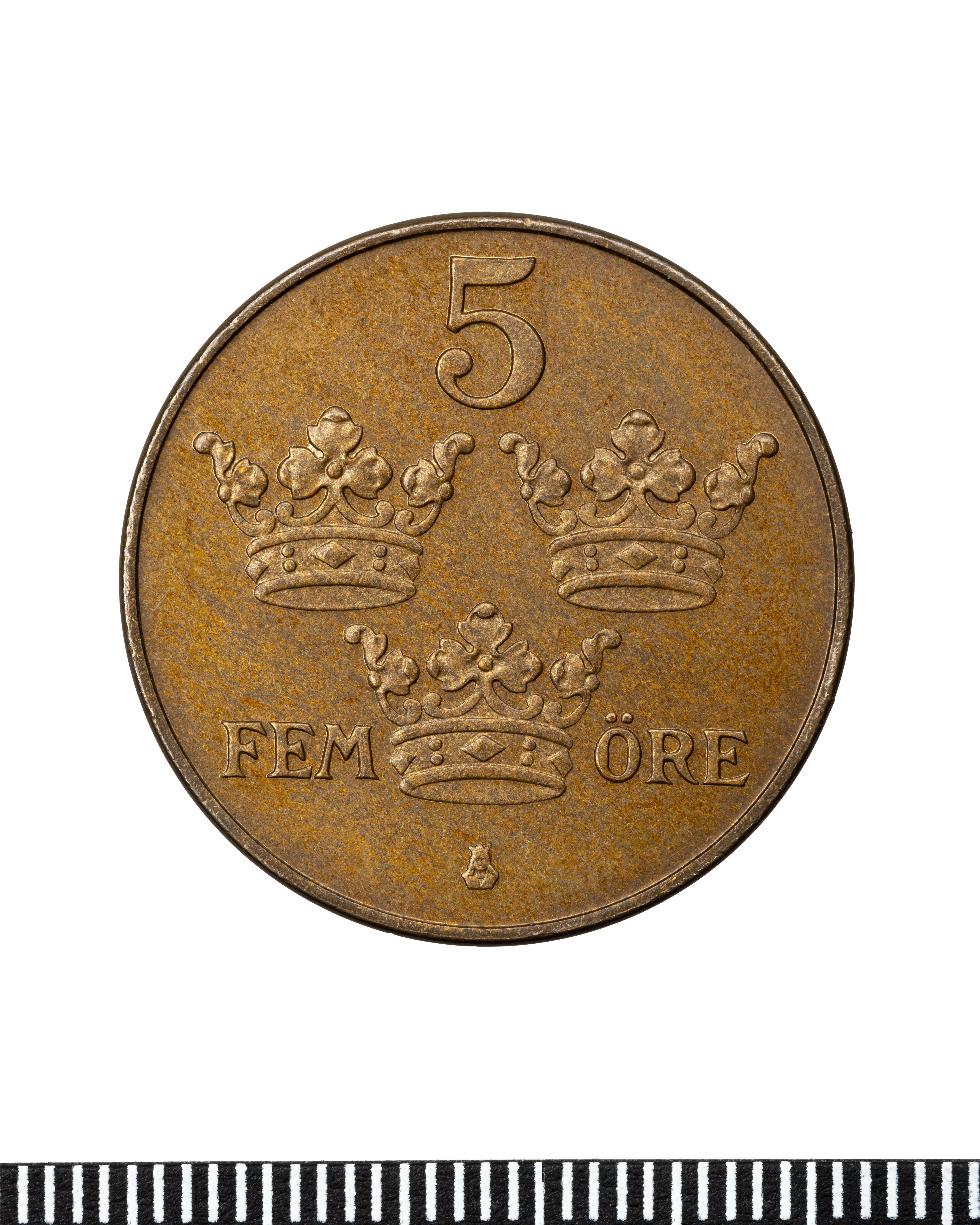 Upphov: Gustaf V av Sverige. Media: Mohr, Jens. Ekonomiska museet - Kungliga myntkabinettet/SHM, (CC BY 4.0) Du får bearbeta och dela verket för alla ändamål, även kommersiella, så länge du anger upphovsperson och licensgivare.