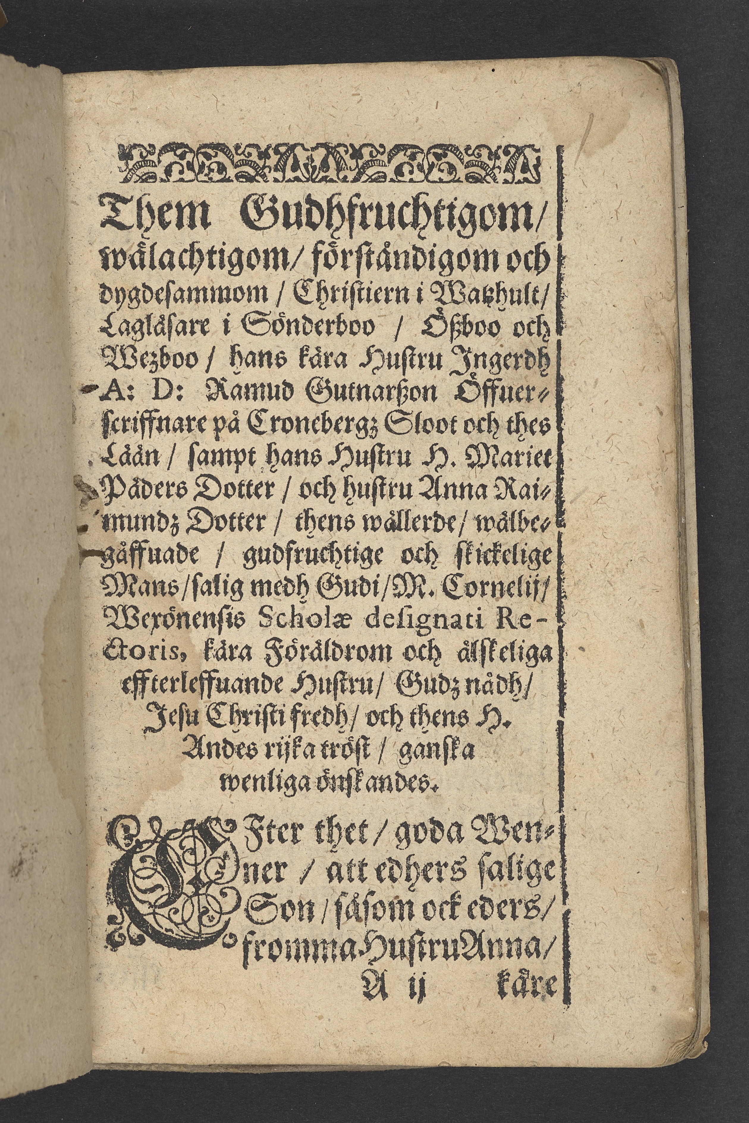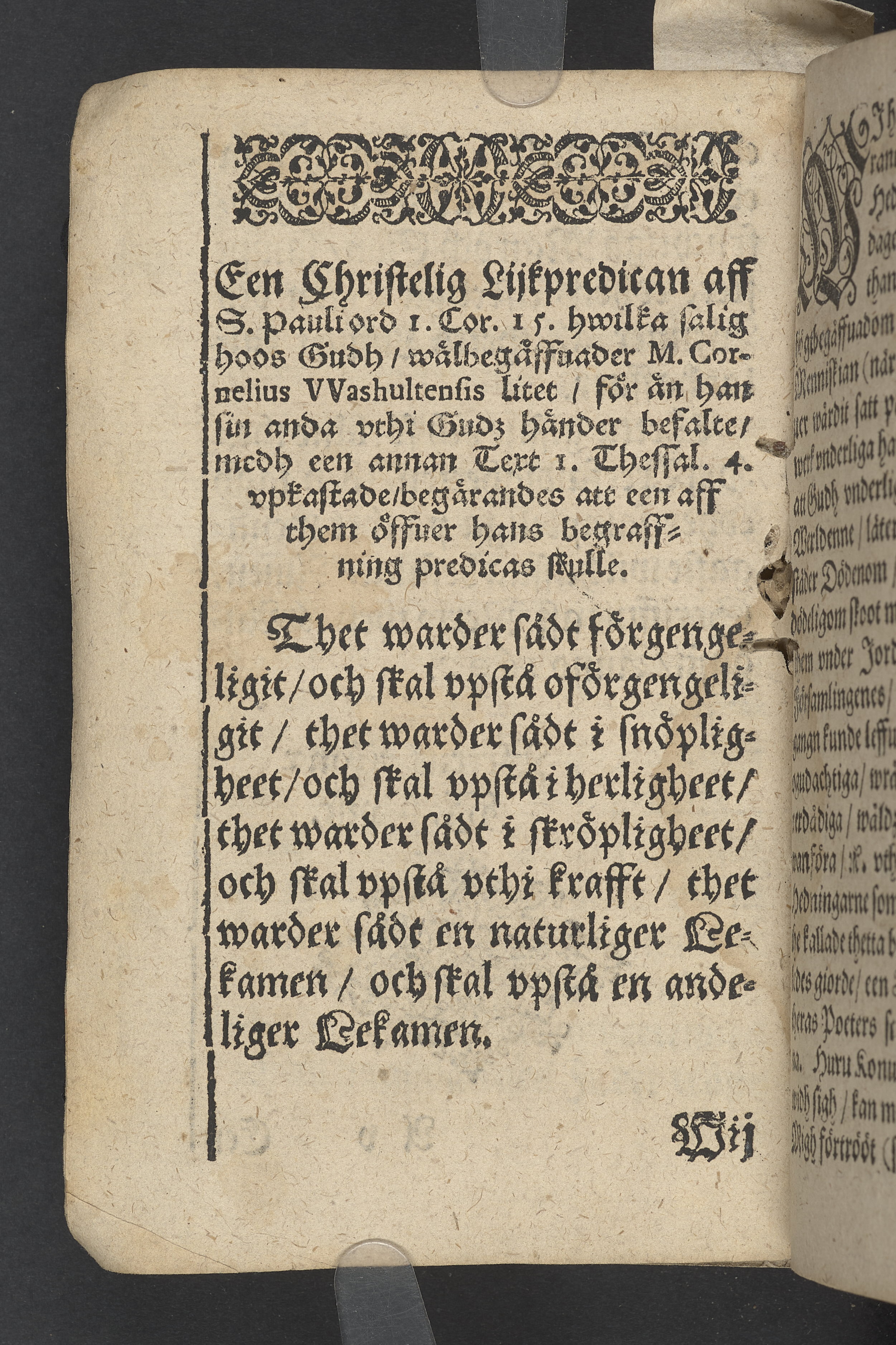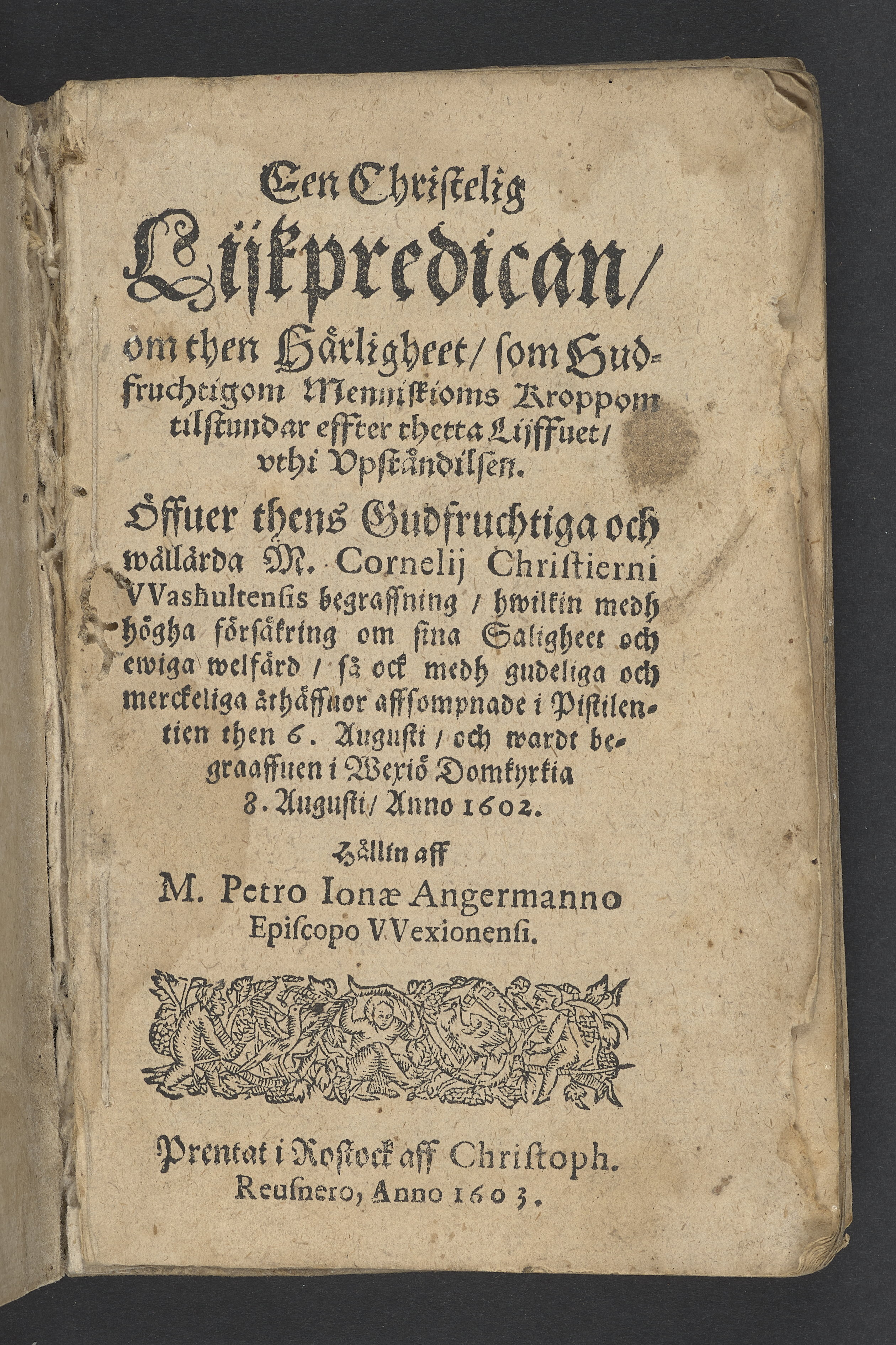 Een christelig lijkpredican, om then härligheet, som Gudfruchtigom menniskioms kroppom tilstundar effter thetta lijffuet, vthi vpståndilsen. Öffuer thens gudfruchtiga och wällärda M. Cornelij Christierni Vvashultensis begraffning ... affsompnade i pistilentien then 6. Augusti, och wardt begraaffuen i Wexiö domkyrkia 8. Augusti, anno 1602. Hållin aff M. Petro Ionæ Angermanno Episcopo Vvexionensi. Prentat i Rostock aff Christoph. Reusnero, anno 1603.