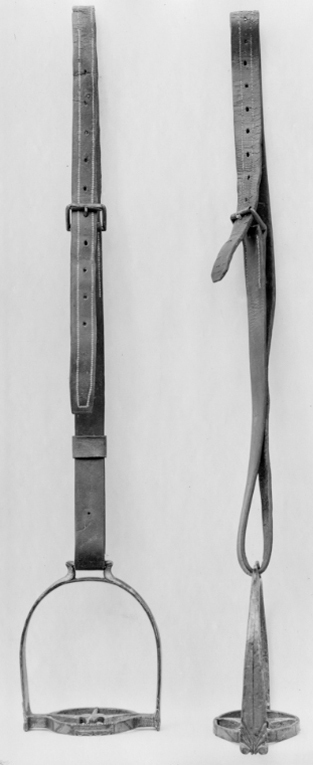 Stigbygel av förtent stål, U-formad bygel med plana skänklar med smal skåra utmed mitten samt v-formade infilningar nedtill och konturerad kant. Fast rektangulär remögla med konkava sidor, i ett med skänklarna. Ögleformat trampstöd med två korslagda ståltenar, vid korsmitten blomornament. På fram- och bakkantens mitt längsgående kort hålkäl samt tandad övre kant. Tillbehör: Stigläder av svärtat läder 33 mm brett med rektangulär sölja av stål med löphylsa och slät lekare av läder. Under 1800-talet utställd i Riddarholmskyrkan i den sk kungalängden med rustningar som påstods ha tillhört regenter från Birger Jarl till Gustav II Adolf.