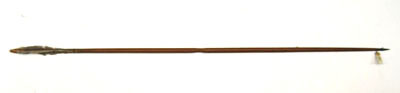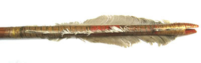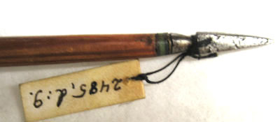 Spets i stål, L 13 mm. Triangulär med konisk bas och tången inslagen i skaftet. Mellan tånge och skaft bandformad dekor svart-grönt-svart av okänt material. Skaft av ljust furuliknande trä med tydlig ådring. Baktill skadade vita styrfjädrar. Yttre delen lindad med svart tråd och målad i fyra fält, guld-brun-röd-brun. Ytterst tillskuret strängläge med två armar, målat i guld.