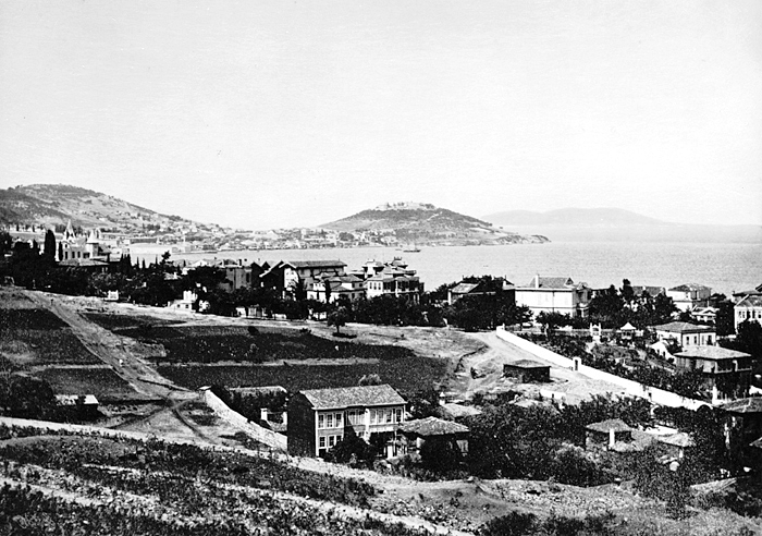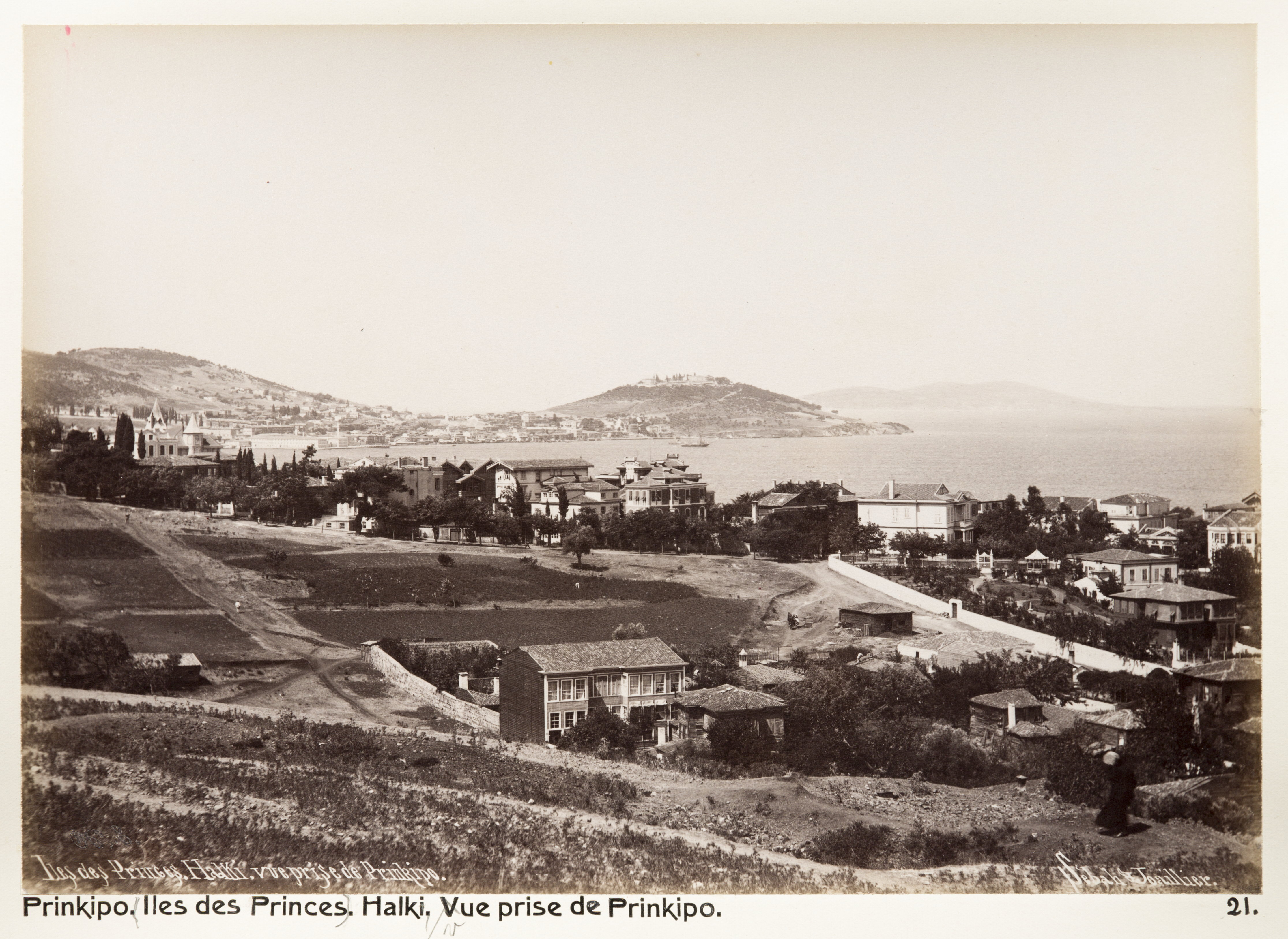 Vy över ön Heybeliada (Halki), från ön Büyükada (Prinkipo). Prinsöarna i Marmarasjön. Text på originalet: "Prinkipo (Iles des Princes). Halki, vue prise de Prinkipo." Fotografierna LXVI:O.01.-54. kommer från resan till Turkiet och Mindre Asien som Wilhelmina och Walther von Hallwyl gjorde den 27 april - 20 juni 1901. De lämnade Sverige den 5 november 1900 för Egypten, där de stannade till den 28 mars 1901, då de fortsatte till Palestina. Den 27 april fortsatte de till Turkiet och Mindre Asien. Med på resan var Wilhelminas sällskapsdam, fröken Ida Uhse. I Konstantinopel (Istanbul) anslöt sig Wilhelminas mor Johanna Kempe och kusindottern Elma Hök. Fotografierna är inköpta av Wilhelmina i Konstantinopel (Istanbul) och Brussa. Alla uppgifter kommer från Ida Uhses reseanteckningar.