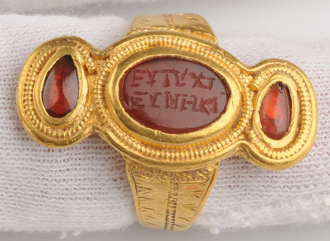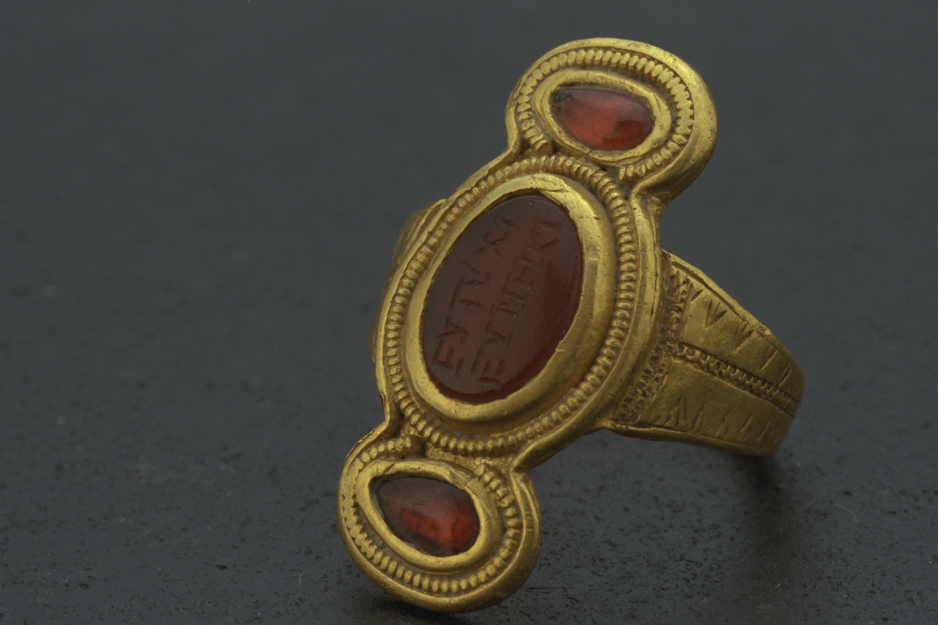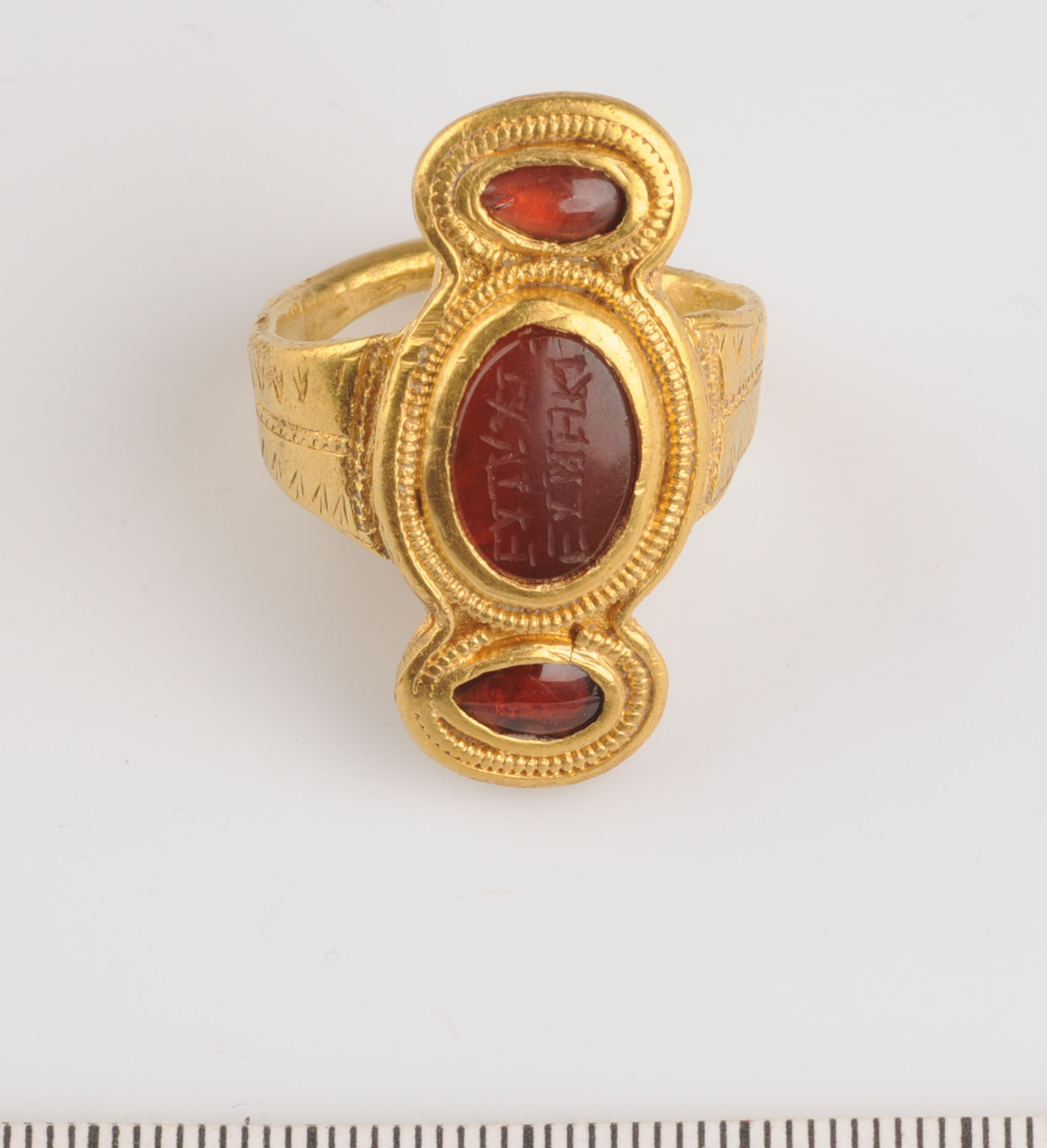 Två infattade almandiner och en granat. Grekisk inskrift EVTYXI EVNESI, ungefär ”Var glad Eunesios”.
