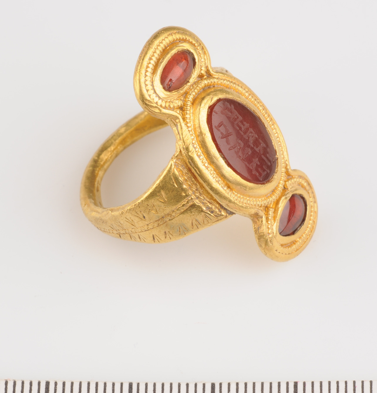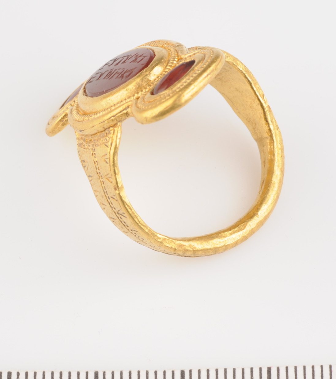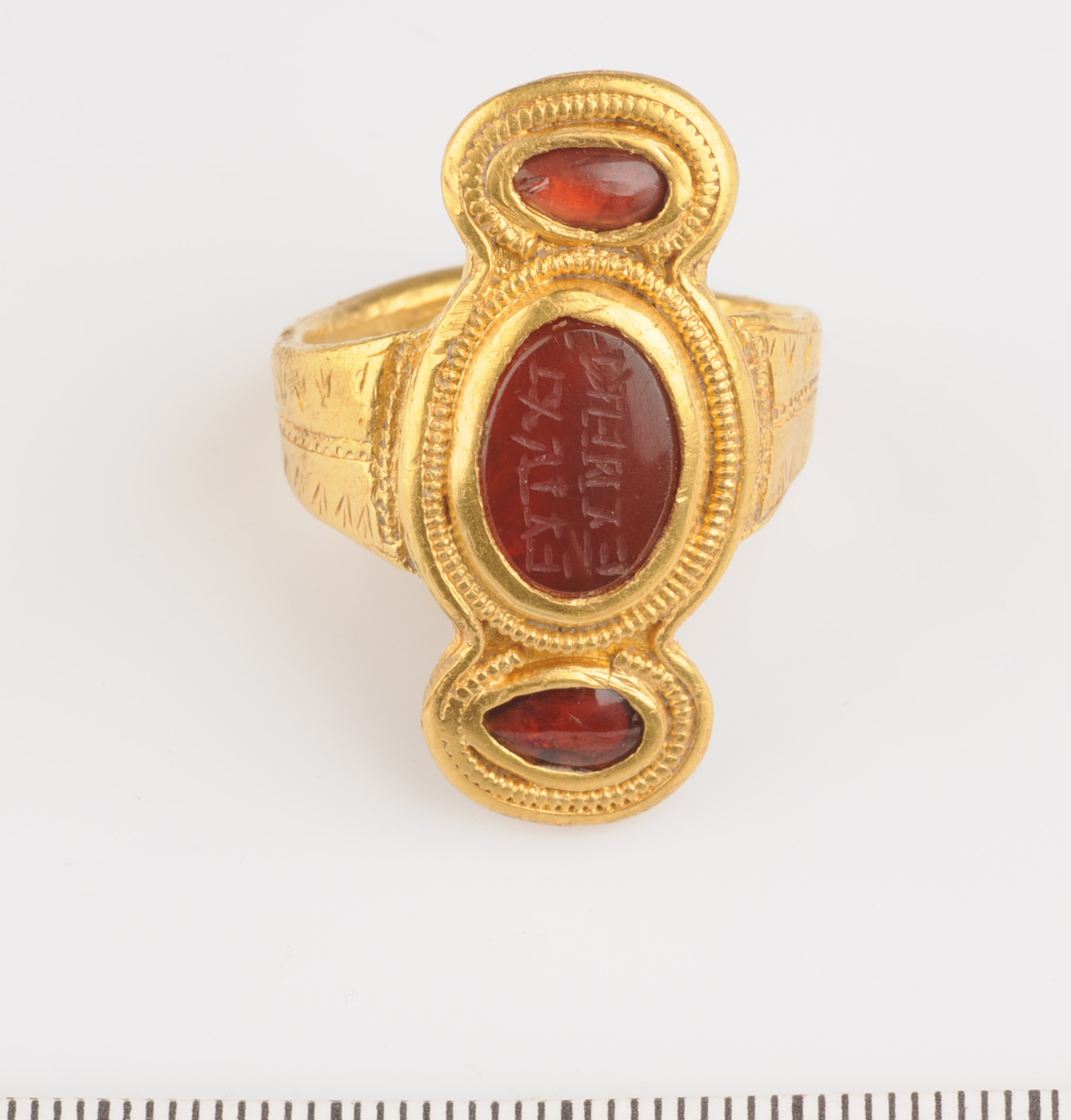 Två infattade almandiner och en granat. Grekisk inskrift EVTYXI EVNESI, ungefär ”Var glad Eunesios”.