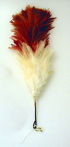 Ståndarplym bestående av en vit och röd strutsfjäder med ett skaft av stål med vit tråd lindad runtom högst upp på skaftet och med en krok nedtill.