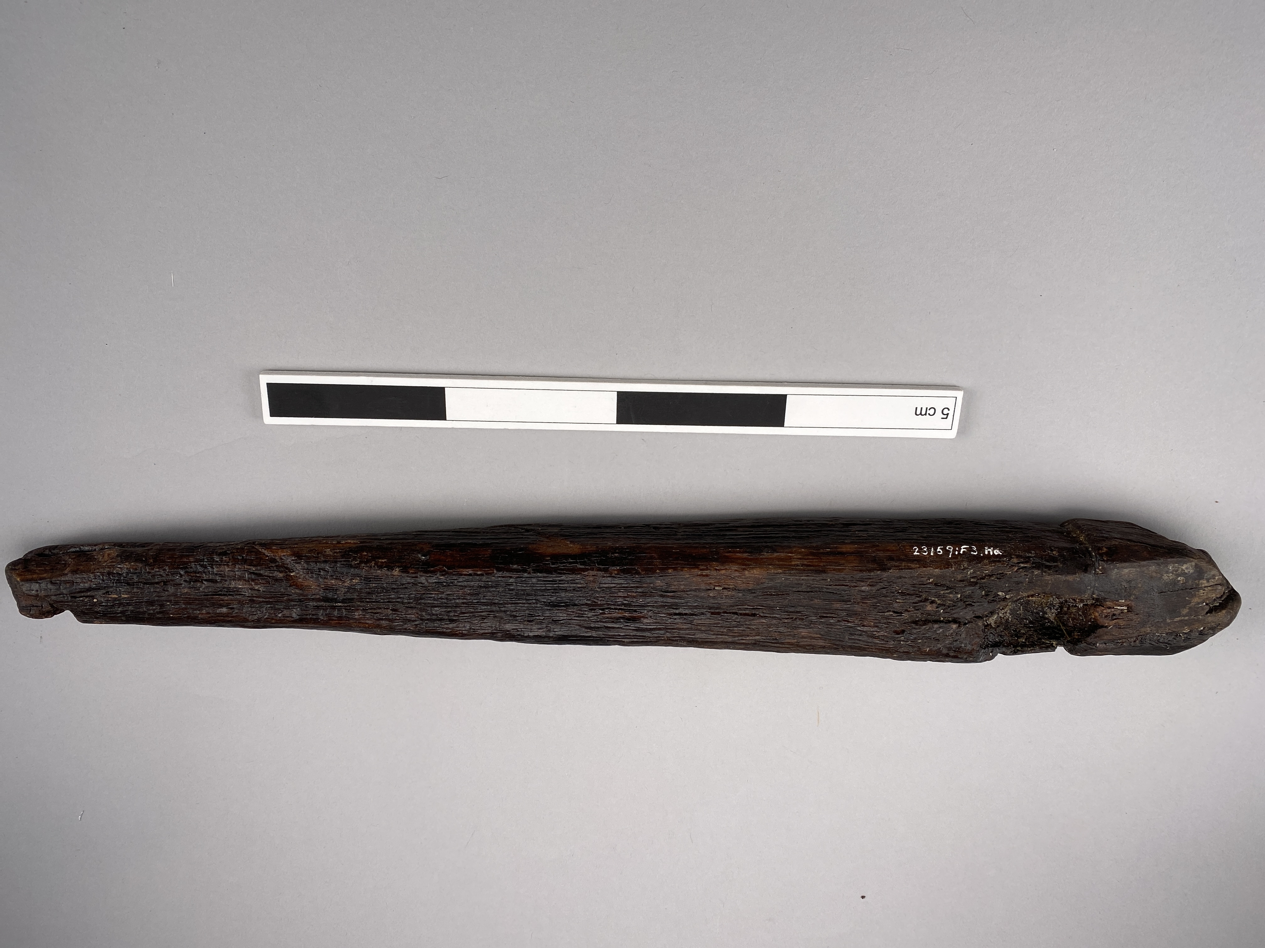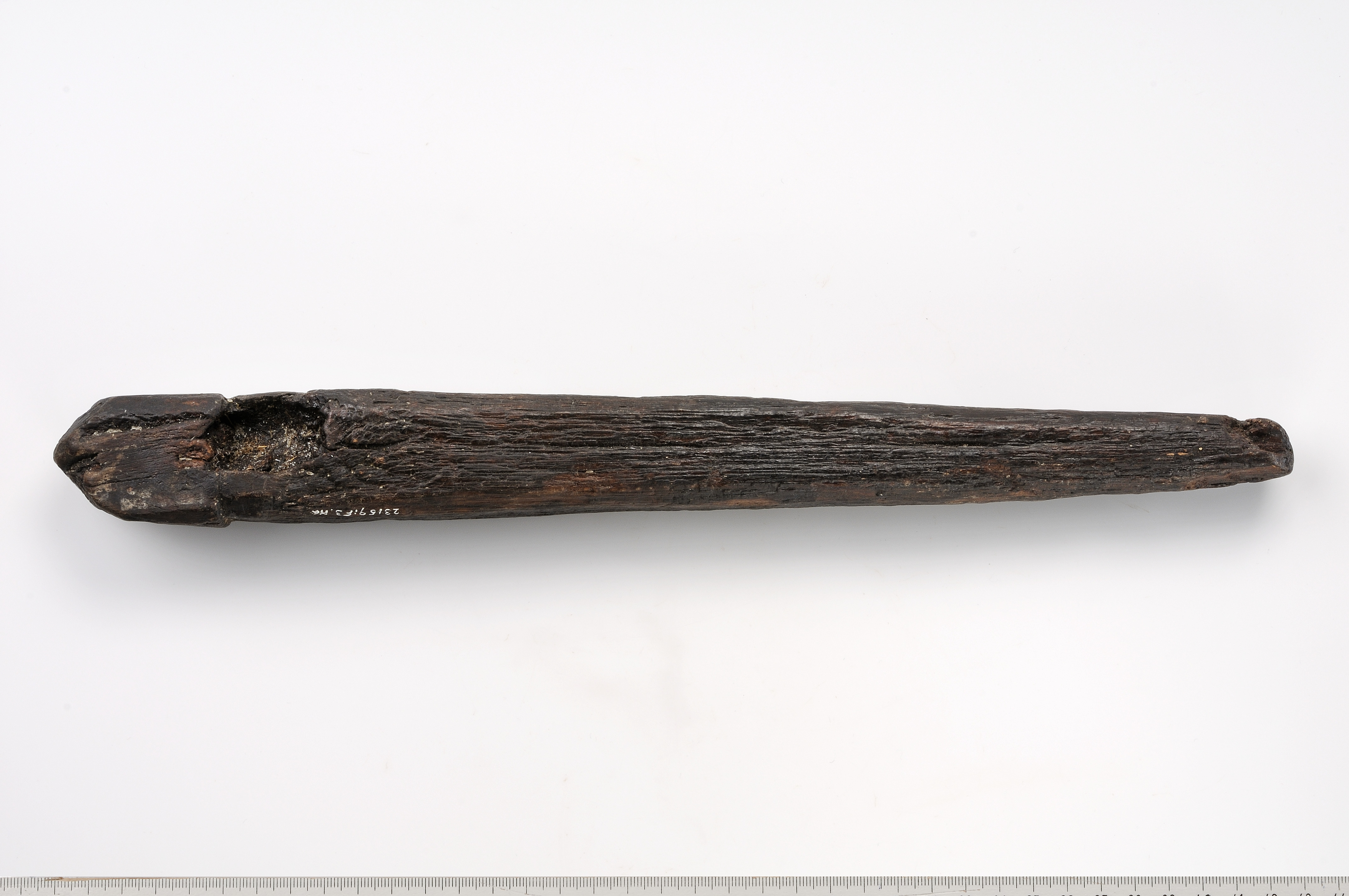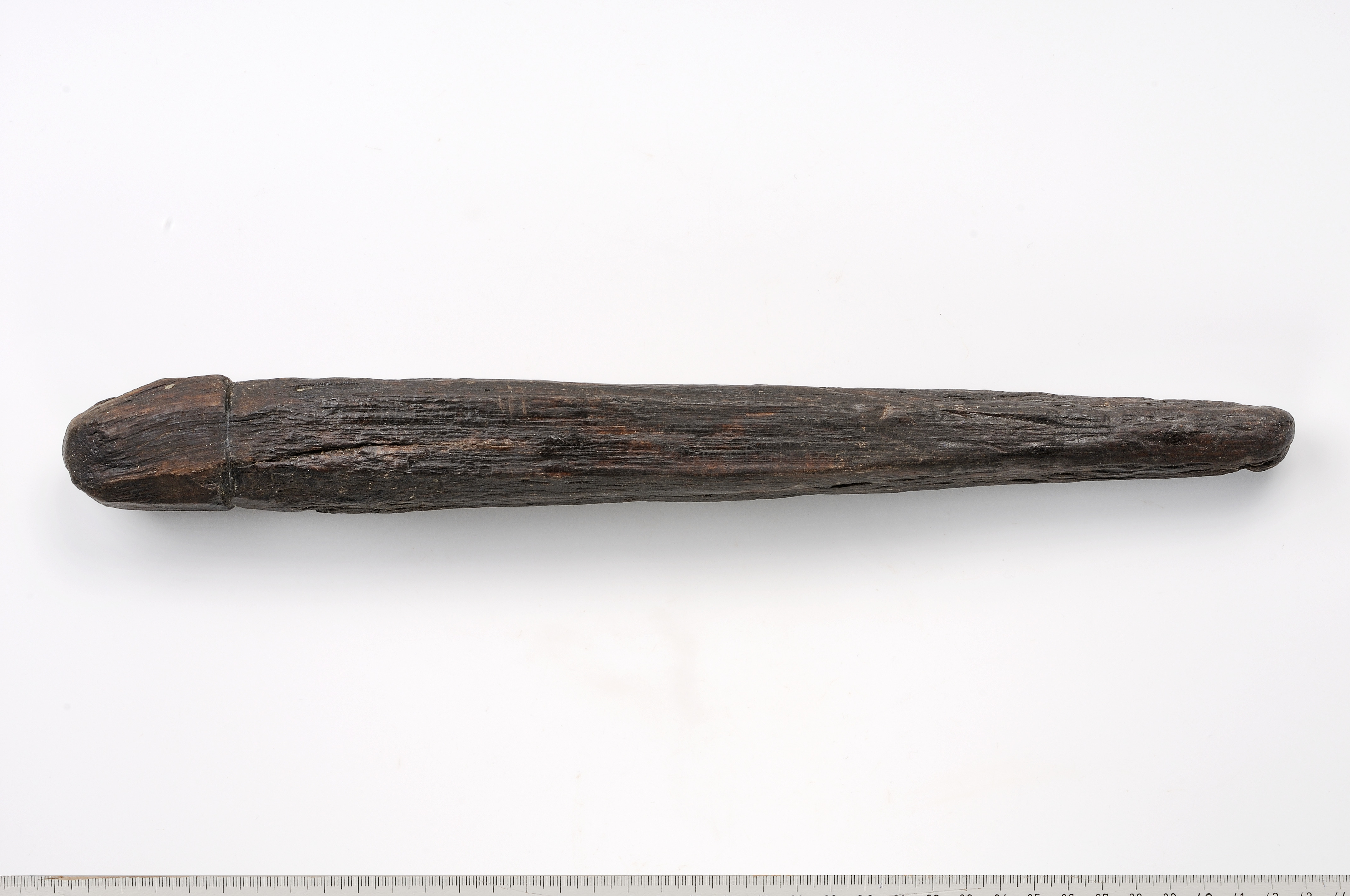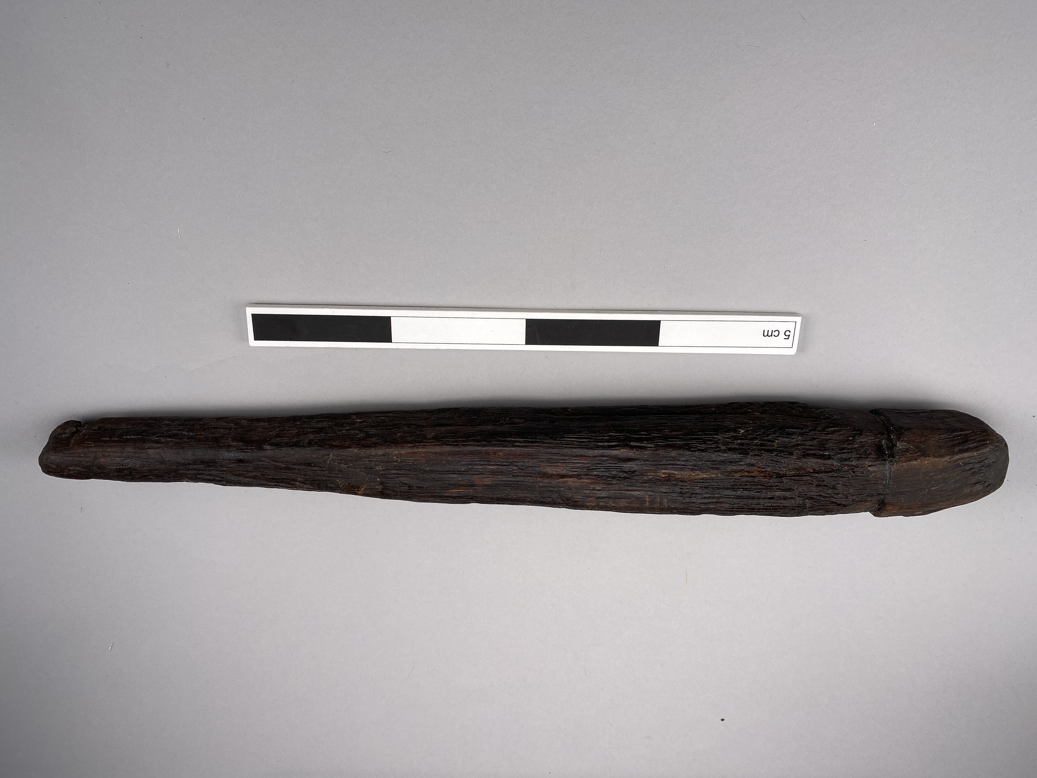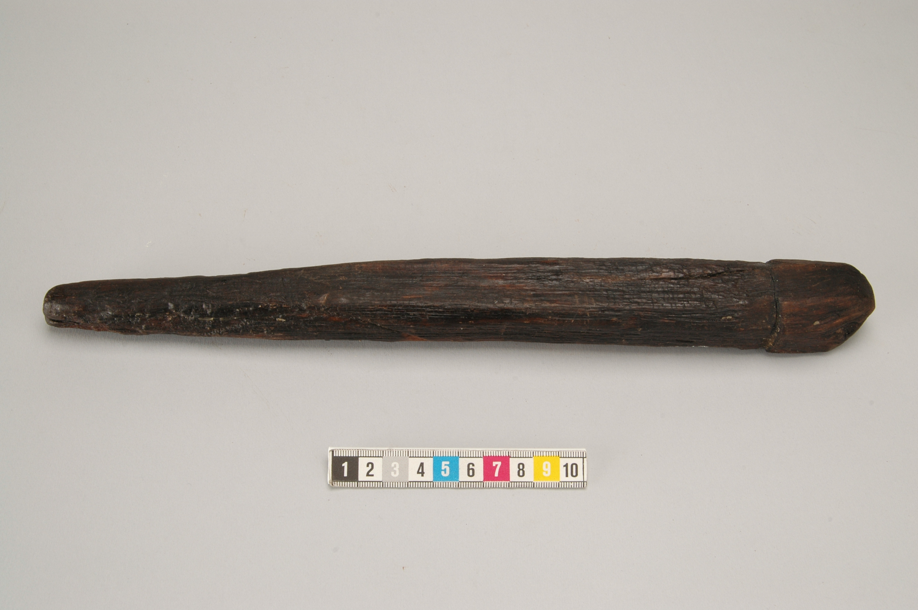 Pinne/tjuderpåle av ek. Fyrsidigt md avfasade kanter. Huvudet är skarpt avsatt, uppåt avfasat. Huvudet skjuter ut ca 2 mm utanför själva pinnen. För att tjudra får eller getter som skulle beta, när inte gärdesgård fanns. Ett rep har förbundit pinnen med djuret.
