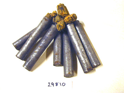Kruthorn av bleckplåt, bestående av 7 st cylinderformade behållare med 5 st korkproppar samt fragment till en sjätte. Behållare och korkar sitter ihop i ett snöre, som löper genom ett hål i behållarnas övre del.