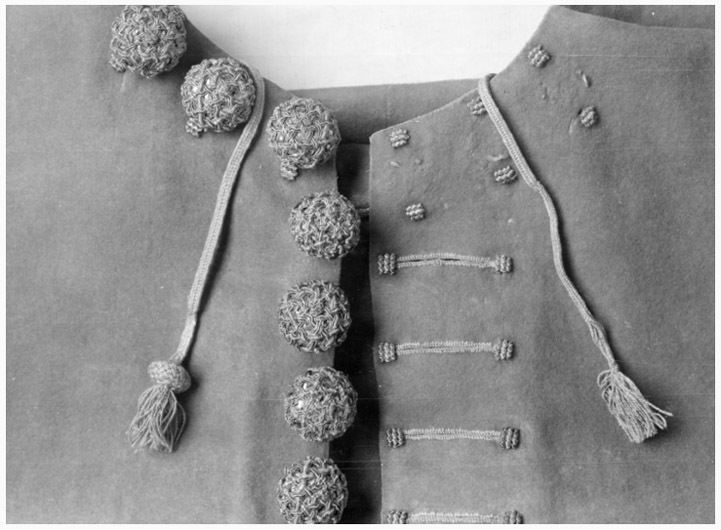 Rundskuren kappa av tjockt rött skarlakanskläde där ytterkanterna är skurna och ofållade. På framkanten sitter en tät rad av rundade knappar där fem saknas av 30 stycken. Under knappslås- raden har man sytt en dold knappslå av tyget. Knapparna har en kärna av trä och beklädd med guld- och silvertråd. De är 30 mm breda och 20 mm tjocka. Baktill längst ned har kappan ett sprund som är 41 mm lång. På sprundet är 12 stycken knappar och 12 stycken knapphål samma mått som på framstycket. Kragen är rektangulär är 470 mm bred och 115 mm djup och på varje sida av kragen sitter tre knappar. Foder av rött taft är sytt invändigt längs med framkanten, 310 mm brett, samt runt sprundet, 100 m brett.