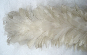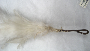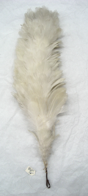 Rak ståndarplym av vita, klippta tuppfjädrar. Fjädrarna är sammanfästade på ett rakt skaft av stål. Vid skarven mellan fjädrar och skaft är virat med gråvit tråd.
