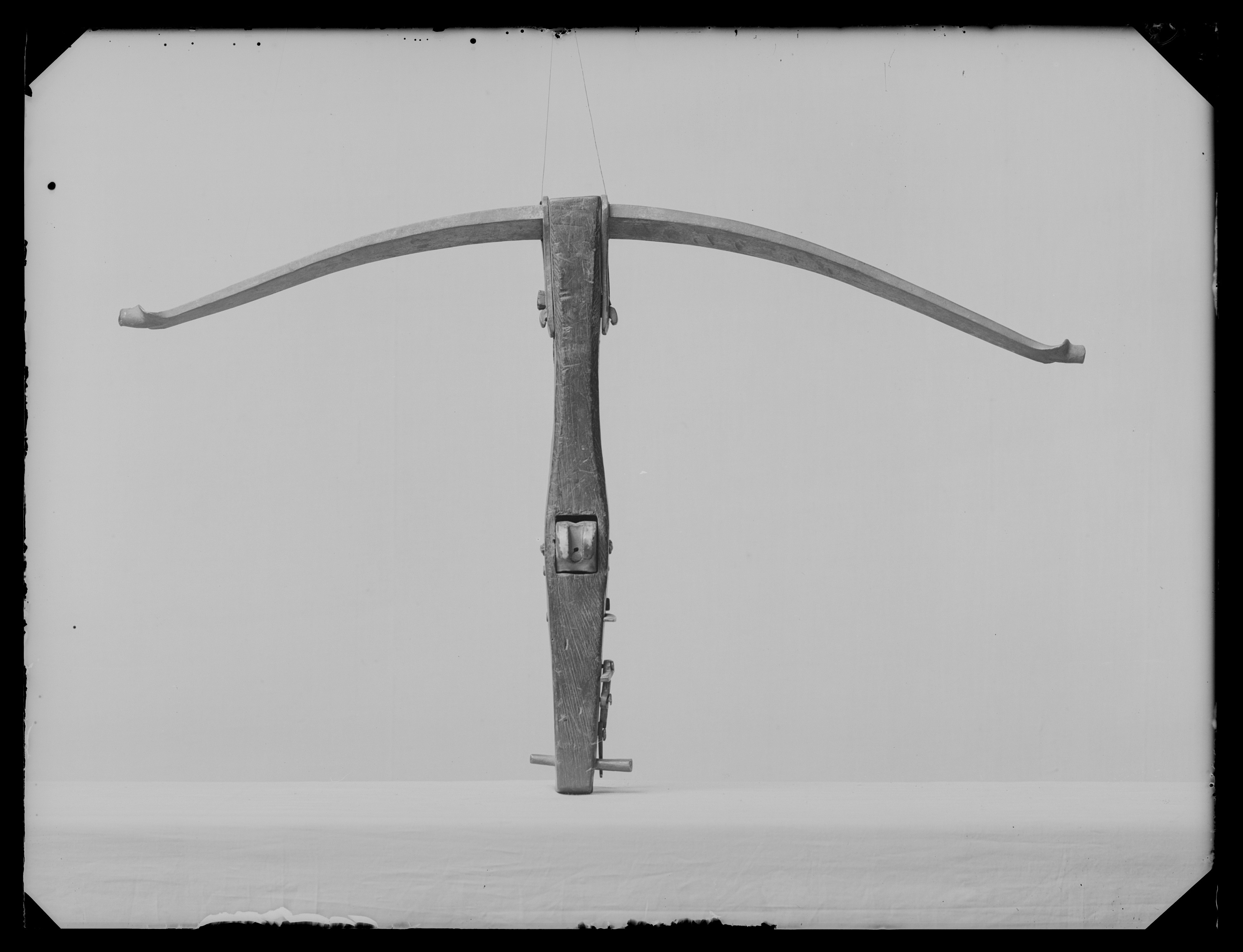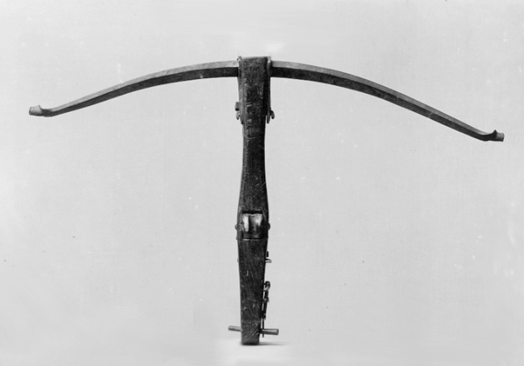 Båge av stål, fästad vid stockens sidor med två triangulära skenor av stål. Utvändigt lås av stål med nöt av ben med kort nedtill böjd avtryckare av stål. Stock av trä (björk?), kort och tjock med baktill två utstående tappar (för spännanordning).