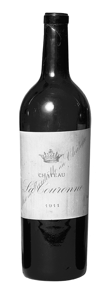 CHATEAU LA COURONNE 1911, tjugoen helbuteljer Av mörkgrönt glas. Cylindriska, med kupigt indragen skuldra och smal cylindrisk hals med stärkring; bottnen konisk, högt uppskjutande. Etikett vit, på denna text och en krona (varumärke) i guld, dessutom snett över text i rött: "Mise en Bouteille au Château". Höjd: 30,5 cm.; diameter: 8,4 cm.