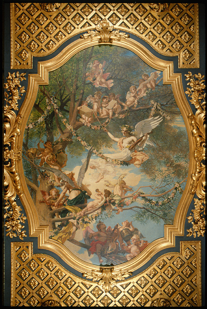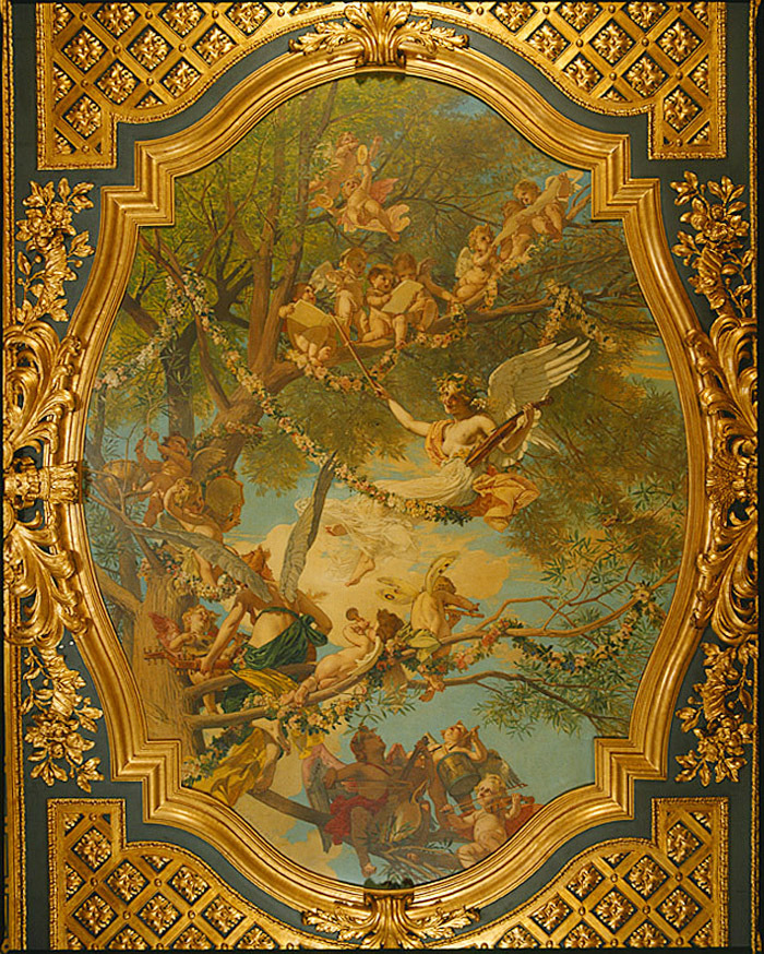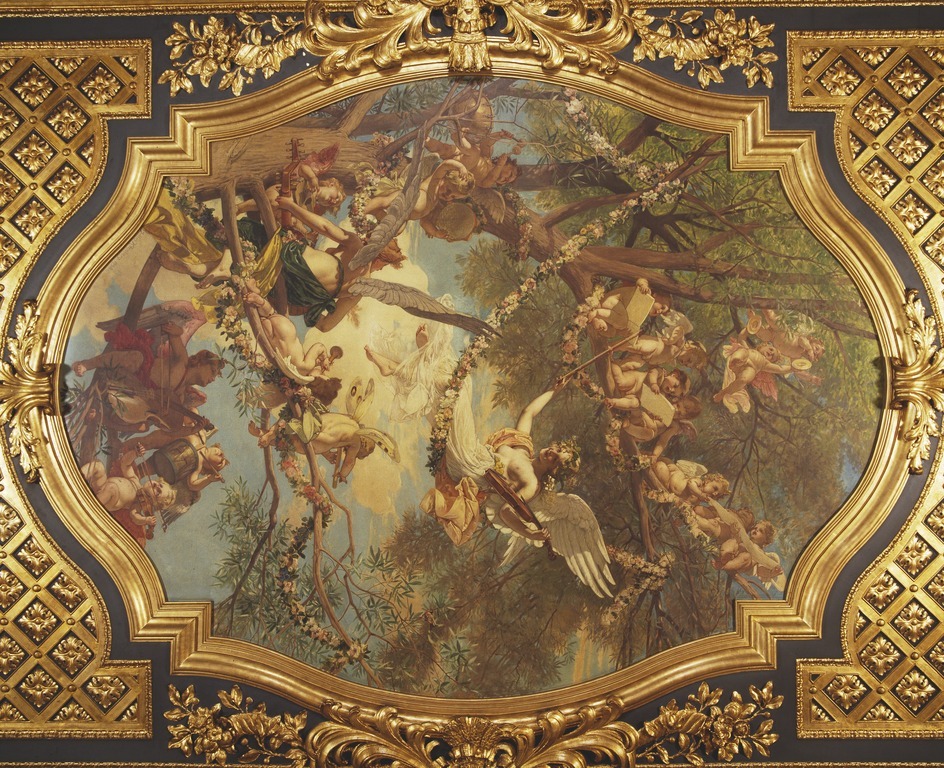 - Friluftskonsert. Olja på duk. (Stora salongen.) Till vänster ett stort pilträd med gråbrun stam och grenar i samma farg, de senare med rikt löfverk i ljusare och mörkare grönt samt gulgrönt; de åt höger utgående grenarna längre och nästan rakt utstående; å dessa stå, ligga eller sitta sjungande eller spelande putti. I midten å en i båge hängande blomstergirland anförarinnan, en ung kvinna, sittande vänd halft åt vänster, med fladdrande lockigt ljusgult hår, hvari blommor och en grön bladranka, stora hvita vingar, i tunn fotsid kjortel, fast kring midjan med ett smalt grått band, å detta vid vänstra sidan ett gult blomknippe, öfver högra axeln en bakom ryggen utfladdrande mantel, skiftande i ljusgult och ljusrödt, i vänstra handen en brun violin, stödd mot sidan, i högra handen stråken snedt uppåt; girlanden med blommor af olika slag och färger, såsom rosor i ljusrödt, rödt och ljusgult, prästkragar, blåklint m. fl., ändarna fasta medels en knut vid två grenar, den vänstra kortare, den högra längre. Å den sistnämnda grenen sju putti, sjungande. Den längst till vänster sittande, i händerna ett uppslaget nothäfte, med ljust hår och röda vingar; de sex öfriga grupperade tre och tre; i vänstra gruppen den vänstra puttofiguren stående vänd hälft åt höger, med högra handen i sidan, den mellersta och högra sittande vända framåt, alla med blicken riktad på ett af den mellersta hållet notblad; i högra gruppen den vänstra puttofiguren halfliggande, vänd halft åt höger, den mellersta och högra sittande vända framåt, hållande gemensamt ett långt notblad framför sig, alla med lockigt ljust hår och hvita vingar. Grenen omslingrad i flere hvarf af en girland som den nyssnämnda, hvilken till synes fortsätter nedåt kring stammen. Ofvanför den först nämnda gruppen bland löfverket två sväfvande putti, den till vänster slående triangel, hängande i ett ljusrödt band, i hvilket han håller, med lockigt ljust hår och hvita vingar; den till höger med cymbaler i händerna, med hår som föregående och ljusröda vingar samt i gulskiftande ljusröd mantel. Längre ned på stammen två grenar nästan intill hvarandra. Å den öfre ett kort stycke från stammen en bortvänd sittande ung kvinna, spelande luta, med lockigt gul-rödt hår, uppfäst på hjässan, stora gråa vingar, kring kroppens nedre del en mörkgrön mantel,* fast vid hennes högra sida i ett kring midjan gående band i samma färg, å manteln vid vänstra sidan tre blommor i gult, rödt och blekgult; bredvid henne en öfver grenen hängande gul mantel^ Till höger därom två putti, båda vända från åskådaren; den vänstra liggande på den nedre grenen, med hufvudet åt höger samt blåsande trumpet, med lockigt brunt hår och hvita vingar; den högra sittande och blåsande flöjt, med lockigt gult hår och apollofjärilsvingar, bredvid honom till vänster en blekgrön mantel. I grenverket till höger en liten gråbrun fågel, den nedre grenen omslingrad i flere hvarf af en girland som de nyssnämnda. Å samma gren till vänster invid stammen en putto, stående med högra foten på den nedre grenen samt vänd framåt och spelande gitarr, med lockigt gult hår och röda vingar; därofvanför två putti, den högra stående med ena foten på en kort blomstergirland samt vänd åt höger, slående tamburin med bjällror, med lockigt ljust hår och gråhvita vingar; den vänstra stående på en åt vänster utgående mindre gren samt vänd framåt, slående puka, med lockigt brunt hår och gråa vingar, i hvardera handen en klubba, pukan stående på grenverket. Å den nedersta åt höger utstående grenen tre putti; den vänstra större, sittande vänd halft åt höger, spelande violoncell, stödd mot grenen, med lockigt brunt hår, stora vingar i grått och ljusrödt samt i röd mantel; den mellersta stående vänd framåt, slående trumma (s. k. liten trumma eller hvirfveltrumma), med lockigt ljust hår och gråa vingar, trumman hängande i ett ljust band öfver högra axeln; den högra sittande vänd halft åt vänster, spelande violin, med lockigt ljust hår och ljusröda vingar. Himlen ljusblå, upptill svagt framskymtande genom löfverket, i midten lätta gulhvita moln, längst ned till vänster mera i grått. Ljuset framifrån vänster. Nedtill till vänster längs kanten i grått signerad (orig. 3/1): Målningen stående oval, konturerad och med hörnvinklar. Duken fastklistrad och infälld i takputsen. Längd: 4.77 m.; bredd: 3.6 m. Johan Julius Ferdinand Kronberg, f. ii December 1850 i Karlskrona, d. 17 Oktober 1921 i Stockholm; elev vid Kungl. Akademien för de fria konsterna 1865—1872 och lärjunge af J. C. Boklund, A. Malmström och J. Höckert, vistades i, Köpenhamn, Düsseldorf och Paris 1873—1874, i München 1874—1877 och var bosatt i Rom 1877—1889, därunder han företog resor till Egypten och Tunis 1878—1879 samt flere gånger till Sverige; företog 1894 en studieresa till Berlin, Würzburg, Venedig, Madrid och Paris; vice professor i teckning vid Konstakademien i Stockholm 1885, ordinarie professor i figurteckning och målning 1895, beviljades afsked 1898; historie-, figur-, allegori- och porträttmålare, akvarellist, tecknare, etsare, konstindustrialist, kungl. målare. Enligt »Nordisk Familjebok», Femtonde bandet, Stockholm 1911, och »Svenskt Porträttgalleri» XX, Hasse W. Tullbergs Förlag, Stockholm 1901. Jmfr A.b.4, A.d.3, A.d.7—9, B. 170 och C.c.9. Se äfven Gr. XXXI. Utförd efter beställning af Walther och Wilhelmina von Hallwyl, f. Kempe, af professorn Julius Kronberg, Stockholm, se kvitto 8 Juli 1898. Betald samma dag. Pris: Kr. 20000, se Rescontra (Huset n:r 4 vid Hamngatan) och kvitto.