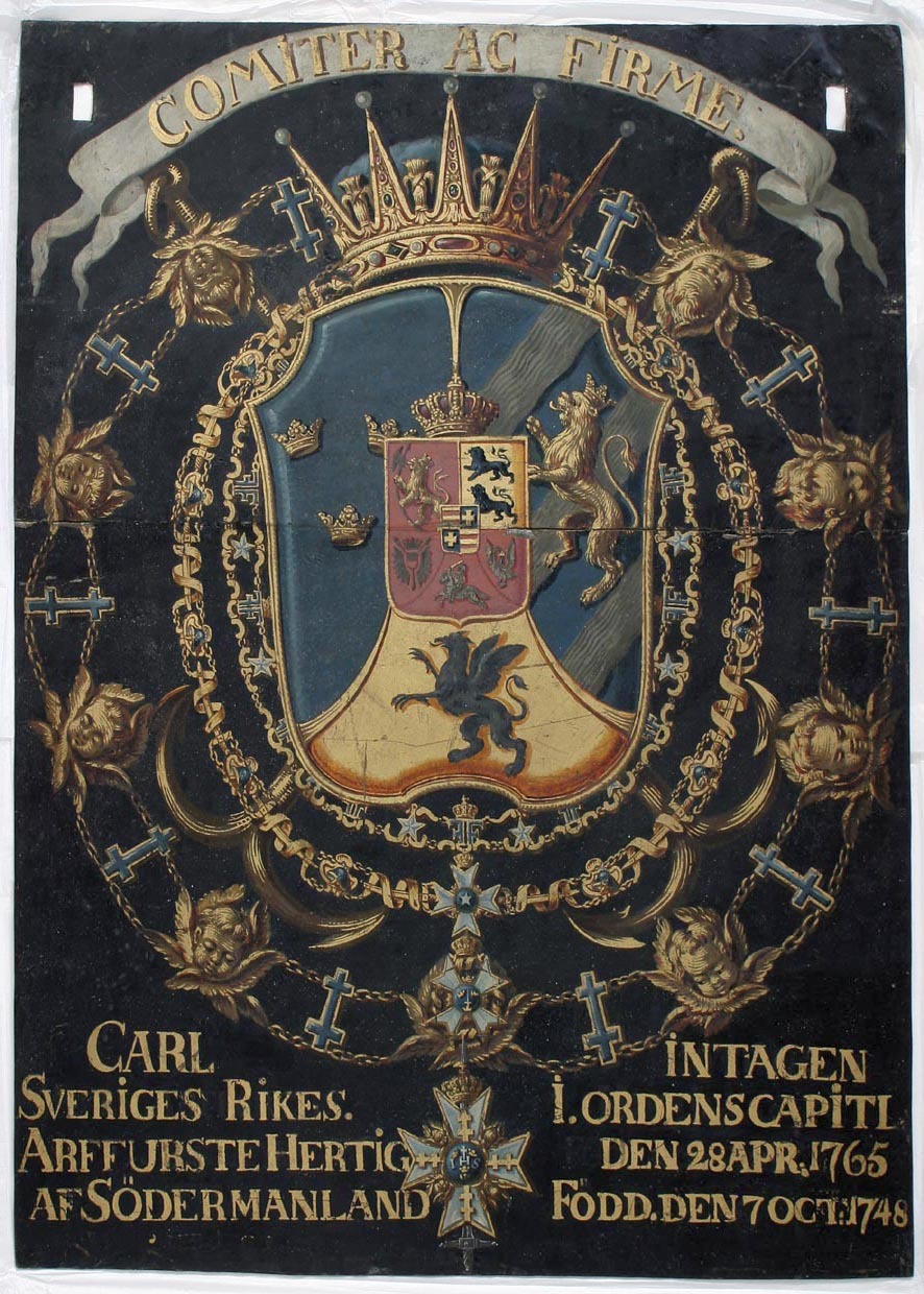 Järnplåt i två delar, h: 400 mm och 600 mm, nitade med 25 mm:s överlappning. Vid övre hörnen två fyrkantiga hål för upphängning. Baksidan målad med grågul färg. Framsidan målad med svart färg, därpå målat vapen krönt av svensk hertigkrona, sköld kluven med mantelsnitt nertill: tre kronor, Folkungalejonet och Södermanlands svarta grip i guldfält. Hjärtsköld Holstein-Gottorp. Bakom skölden två korsade ankare, runt skölden hänger kedjor och ordenstecken för Serafimer-, Svärds- och Nordstjärneorden samt svärd för Riddare med stora korset av Svärdsorden. Upptill vitt texxtband med guldtext: "COMITER AC FIRME", nertill text med guldfärg, till v: "CARL // SVERIGES RIKES // ARFFURSTE HERTIG //AF SÖDERMANLAND", till h: "INTAGEN I. ORDENSCAPITL // DEN 28 APR. 1756 // FÖDD. DEN 7 OCT. 1748".