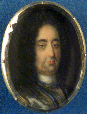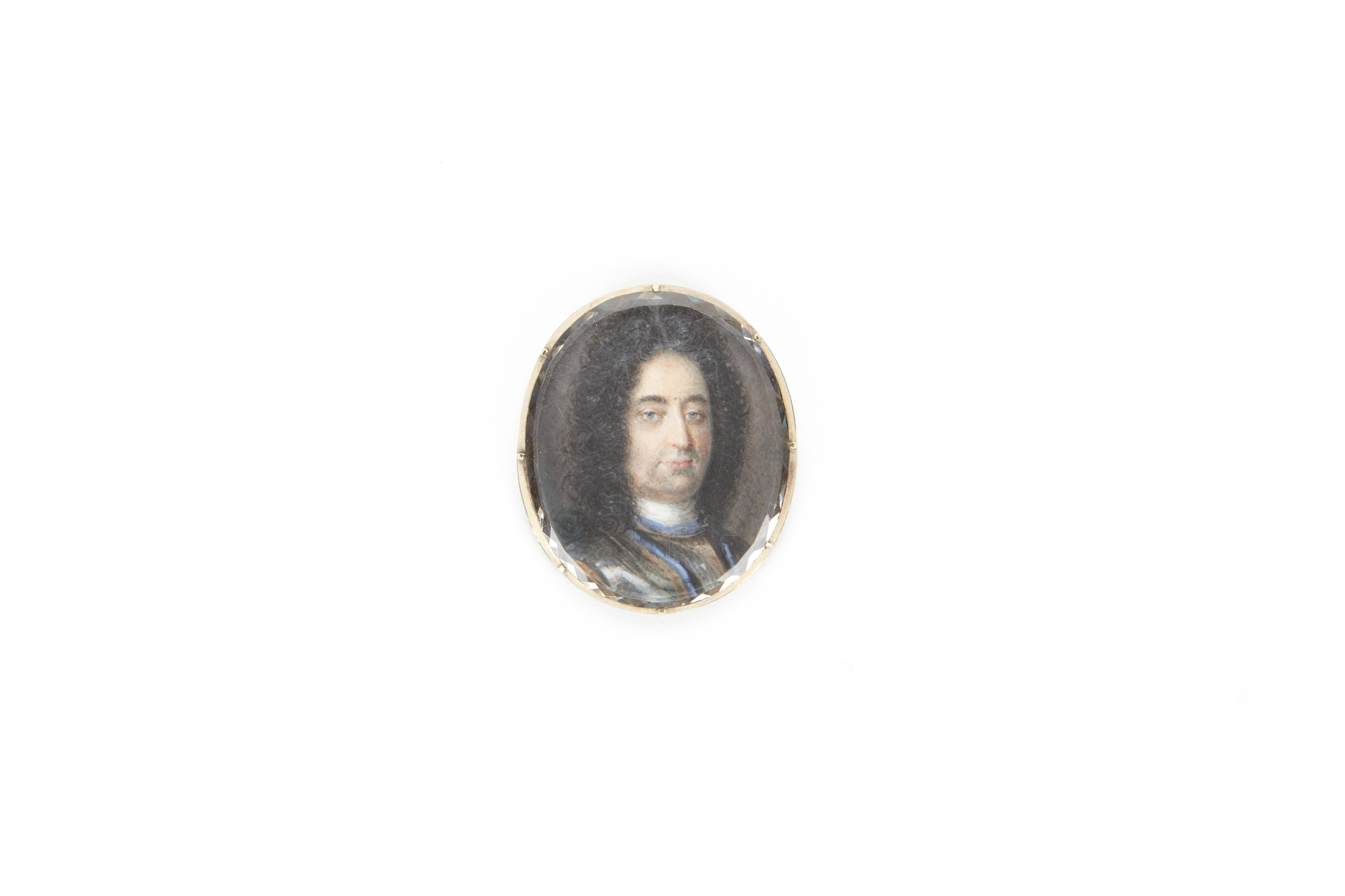 Bröstbild, fas höger. Man i svart allongeperuk, vit lindhalsduk, rustning med bruna och blå kantband. Enkelt monterad i guld. Glas med facettslipad kant. Bakstycket borta. Bildens höjd 29 mm, bredd 25 mm. 1600-talets senare del. Porträttet liknar Johan Leonard Wittenberg.