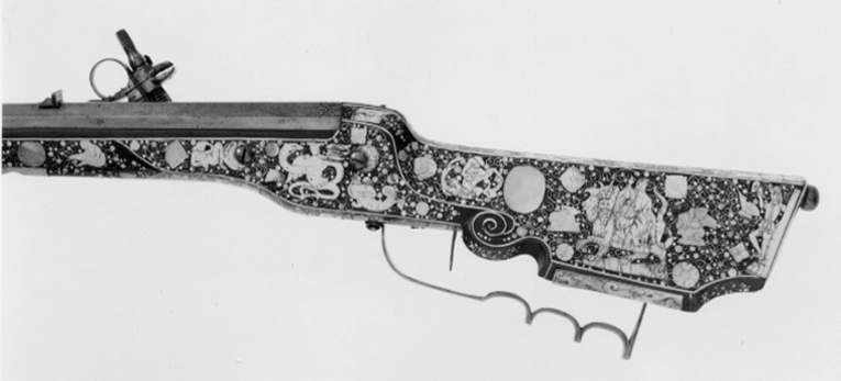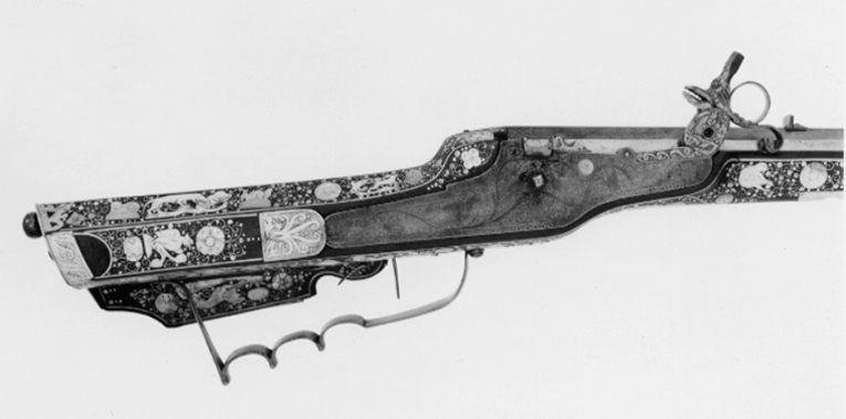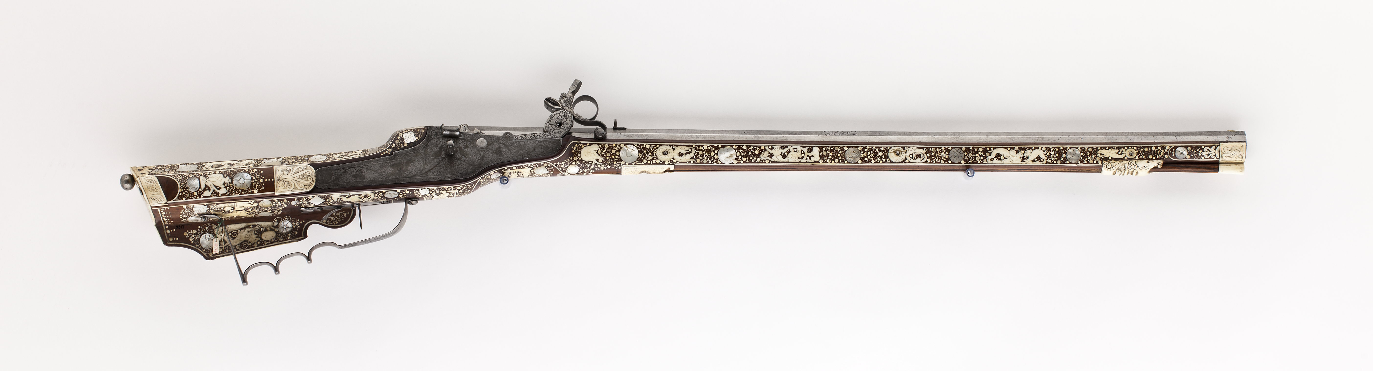 Femsidig, på undersidan rundad, räfflad pipa, tolv räfflor, raka bommar, bombredd 2 mm. Runt mynningen tre koncentriska cirklar. Pipan dekorerad med punsad och graverad dekor i tre fält, bladrankor, fåglar, rankdekor av påslaget silver. Rektangulärt svansskruvblad. Riktmedel: Ståndsikte av stål, spolformigt korn av mässing, båda inlaxade. Fästning: Pipan fäst med krysskruv underifrån (främre varbygelskruven) samt tre pipstift av stål. Hjullås med invändigt hjul och hane i flykt med låsblecket. Plant låsbleck, l: 253 mm, punsad och graverad dekor, längs kanterna punkt- och cirkelbård. Skrafferat mittfält med påslagen rankdekor av silver, i rankorna sitter graverade fåglar. Fyrkantig fängpanna, kort, rak eldskärm, fängpannelock med rörlig arm, tryckknapp i flykt med låsblecket. Hane med fyrsidig kropp, ringformig hals, på huvudet skärm, ringformigt fingergrepp, avslutad med nedåt-bakåtböjd arm. Balusterformig käkskruv med fyrsidig överdel. Graverad dekor, på kroppen banddekor, på halsen en sjöjungfru och ett odjur som biter över slinga, på överkäkens skärm en rovfågel, på fingergreppets spets ett djurhuvud. Fästning: Två låsskruvar med välvda huvuden. Profilerad avtryckare med snälltryck. Brun helstock av trä med tysk kolv med kolvlåda och anslag med vinge, avslutad framtill med volut. Rika inläggningar av ben och pärlemor. Bakplåt av ben med graverad hjort i landskap. Kolvkula av stål. På anslaget: av ben en kvinna, ridande på ett månghövdat odjur (Babyloniska skökan?), samt lutspelare och hornblåsare. Av pärlemor: en oval, tom platta samt blommor, en hjort och en rovfågel som slagit en hare. På kolvens ovansida bl. a. hare och hund, vid svansskruvbladet en graverad signatur, ligatur HK (jfr Hoff sid. 94 fig. 70). På kolvlådelocket en rovfågel, därovanför ett odjur, som biter över midjan på en människofigur. På kolvens undersida en hjort, en hare samt två jägare med byte över axeln. På vingens insida ett lejon. På framstocken harar och hundar mm. Näsband och två rörkor av ben, topprörkan graverad som en fisk. Varbygel av stål med tre fingerlägen. Tillbehör: Laddstock av trä med benskoning.