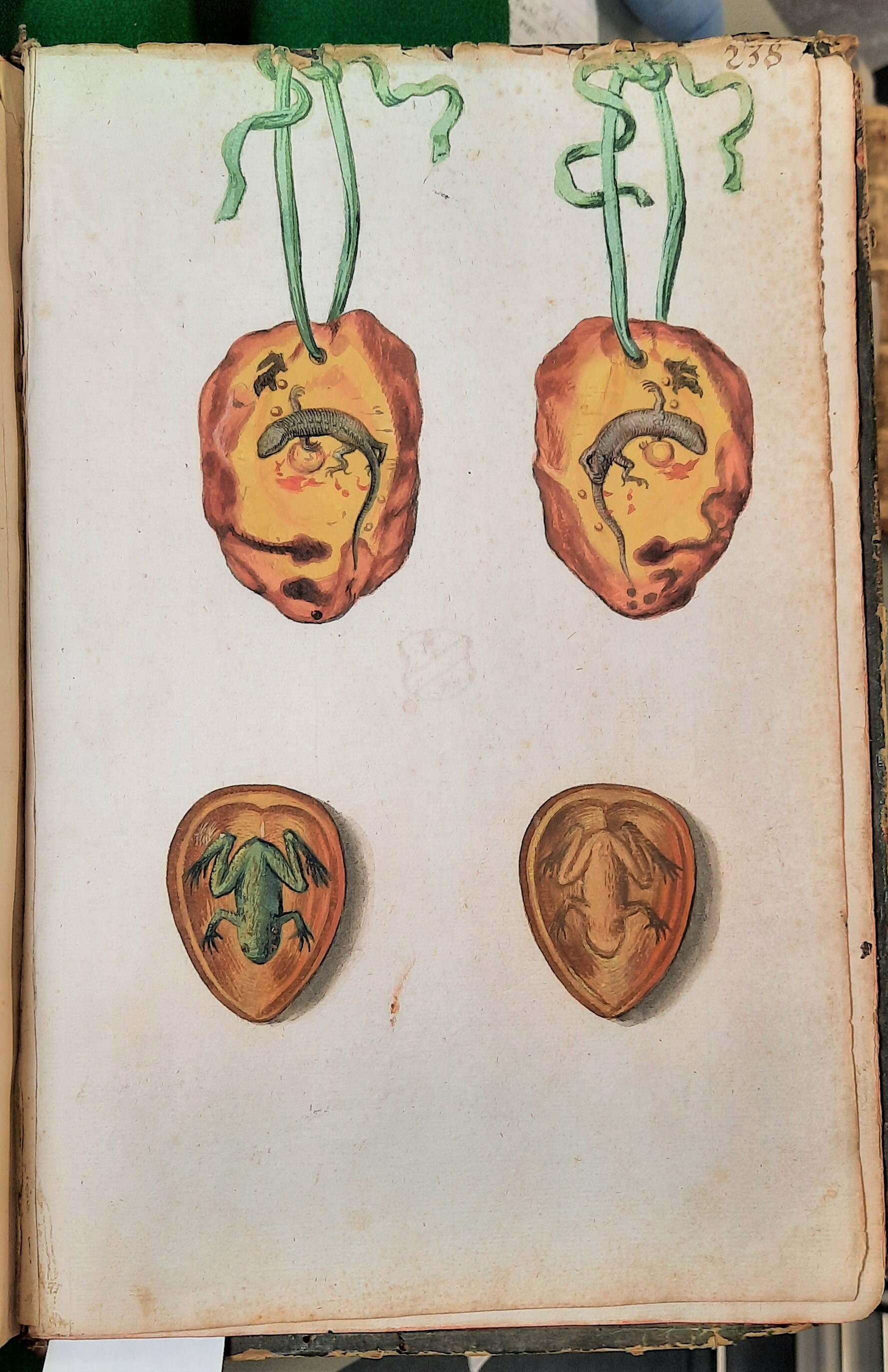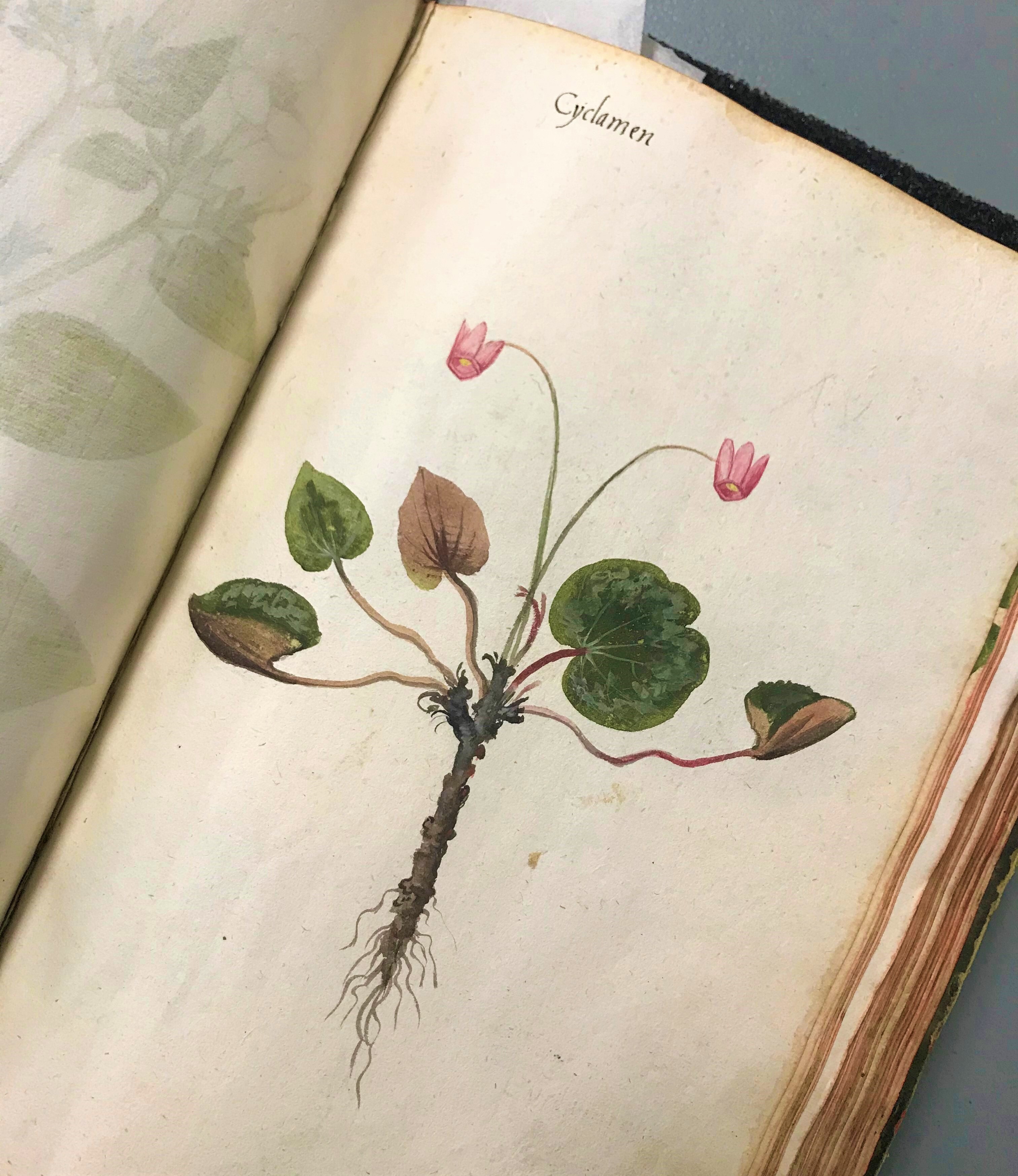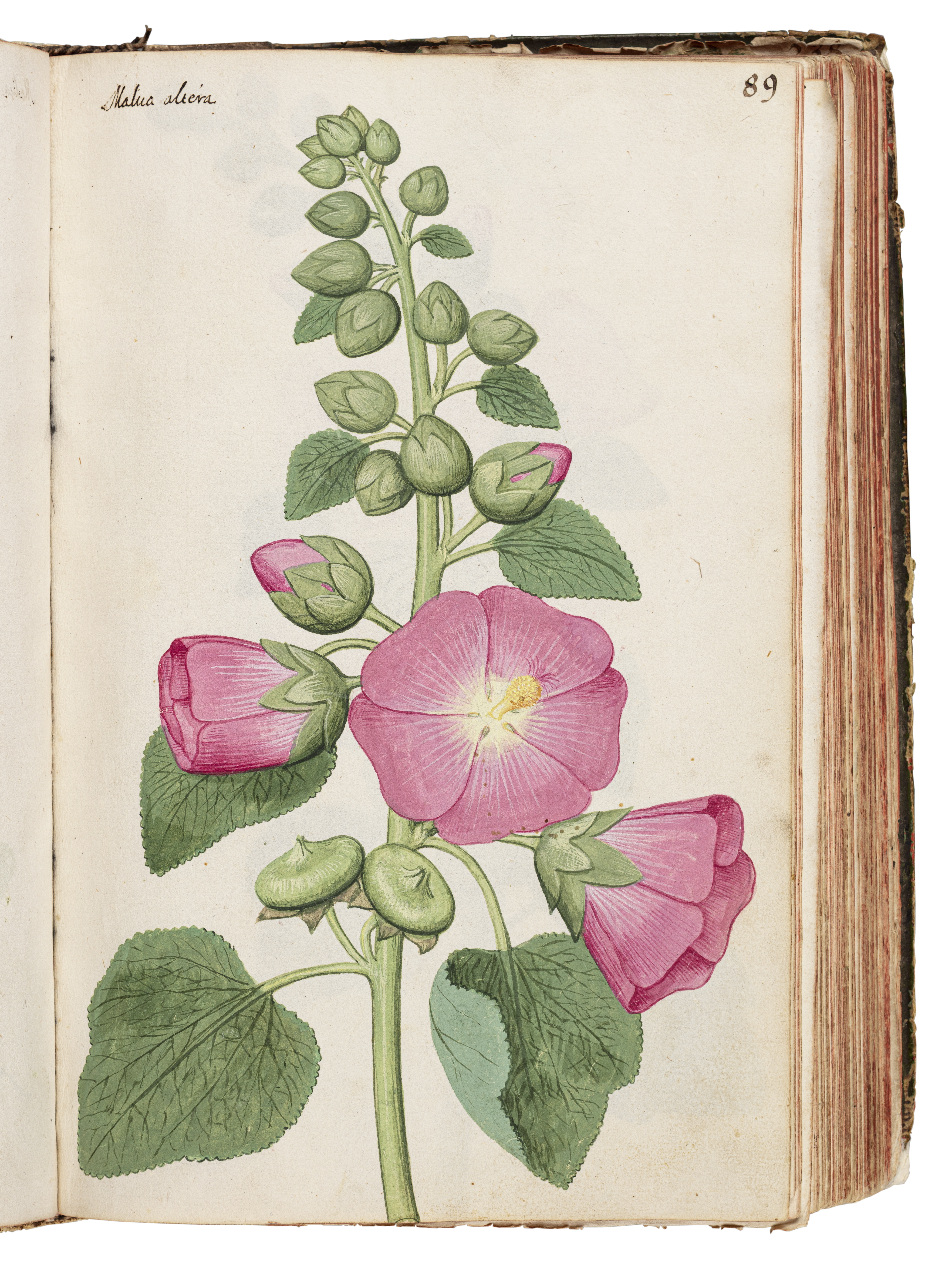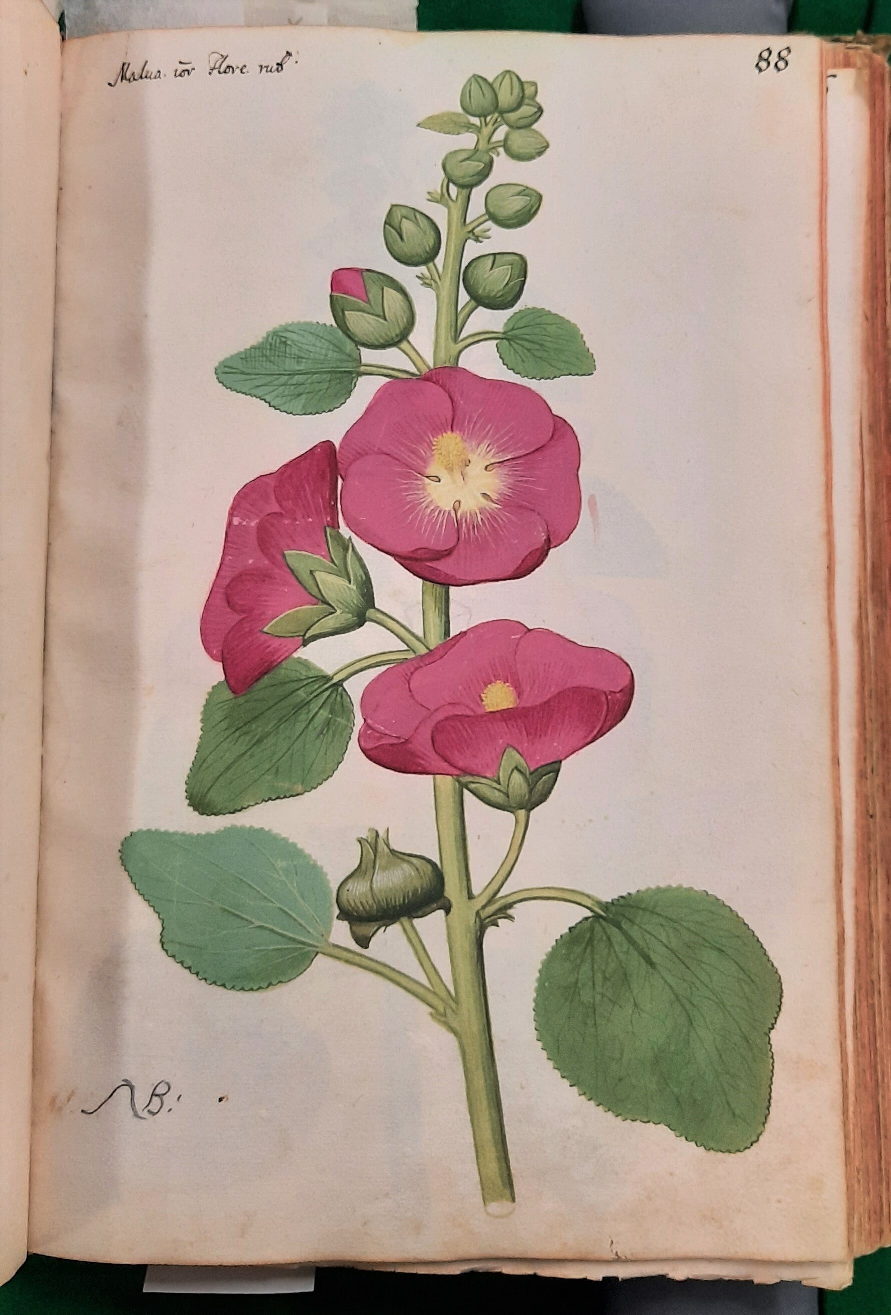 Inbunden samling handmålade bilder av blommande växter. Rygg av svinskinn med blindpressad dekor och fyra dubbla, äkta upphöjda bind och handstickade kapitälband, rödfärgat snitt. Grönmålat överdragspapper på pärmarna, med pärmfyllnad av papp. Innehåller 41 bilder, utförda på bladens ena sida (recto). Innehåller idag 155 av ursprungligen 241 folios (foliering 2-242). Många av bladen är tomma. Ursprungligt antal bilder okänt. Bilderna är utförda på fol. nr. 18, 26, 27, 38, 48, 66, 70, 73, 80, 81, 83, 84, 88, 89, 92, 94, 95, 113, 115, 118, 119, 123v, 124, 127, 130, 139, 140, 148, 155, 156, 157, 168, 174, 177, 178, 180, 182, 186, 188, 197, 238. Fol. nr. 123, 124, 139, 140, 155 delvis ej kolorerade.Fol. nr. 18, 27, 83, 156, 157 är enbart skisser.