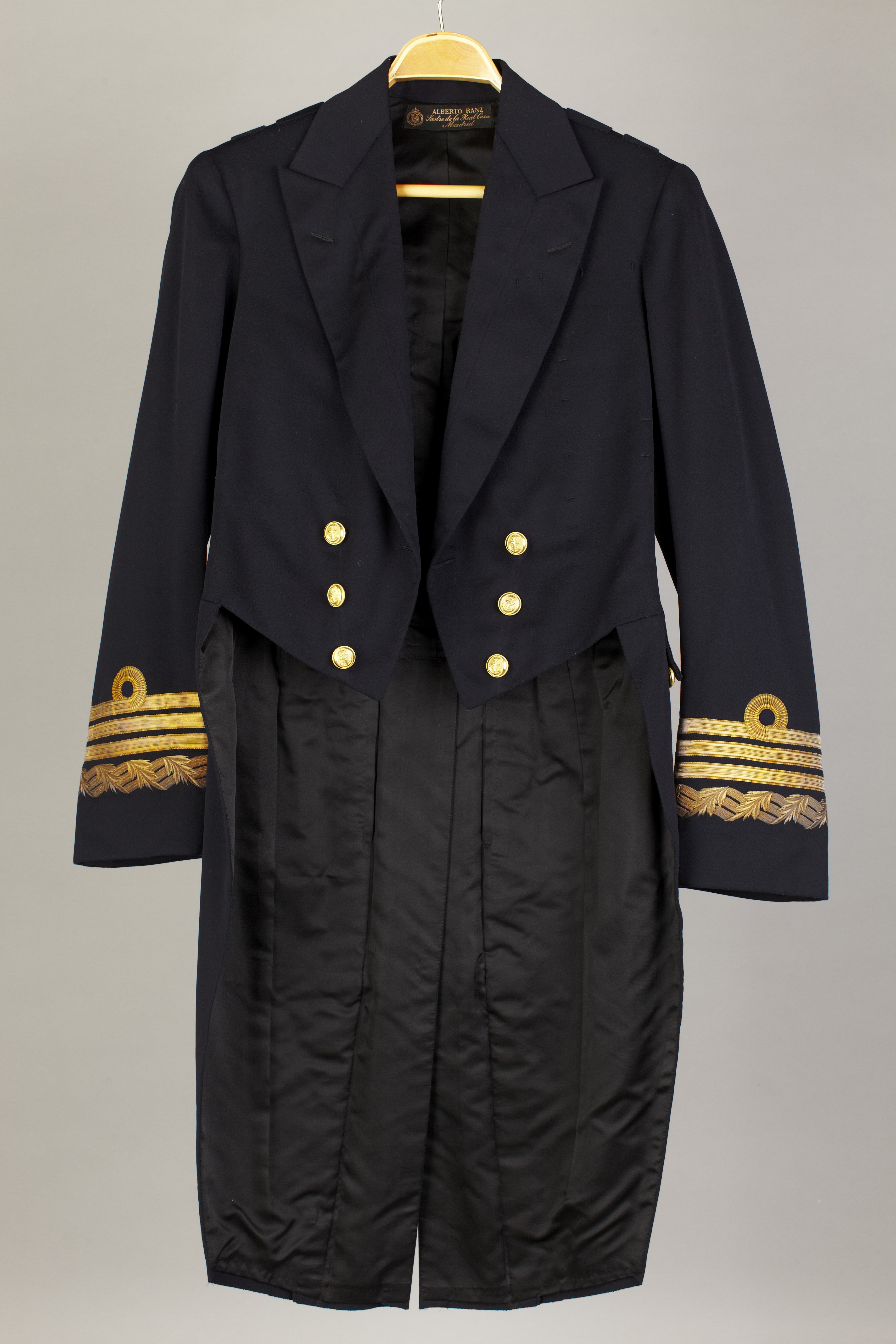 Frack av mörkblått kläde med fällkrage och sex knappar med ankare av förgylldmässing. På insidan stämplat "C.W.J". På slagen ett genombrutet knapphål. Mitt fram två igensydda. På vänster framstycke 12 tränsar för bröstdekorationer. På axlarna två breda tränsar av kläde. På vardera sidan om skörtsprundet ett ficklock. På dessa beläggningssnöre av silke. I livsömmen två knappar samt tre knappar vid vardera ficklocket och en knapp nedtill på vardera skört. Nedtill på ärmarna tre släta guldgaloner i form av blad. Foder av svart siden, i ärmarna vitt siden. Ryggstycket delvis matelasserat. Två innerfickor, den ena med etikett: " A. RANZ // ARENAL II - MADRID // 10 Abril 1927 //S.M. El Rey Gustavo V"Vid kragen firmaetikett: "ALBERTO RANZ // Sastre de la Real Casa // Madrid"