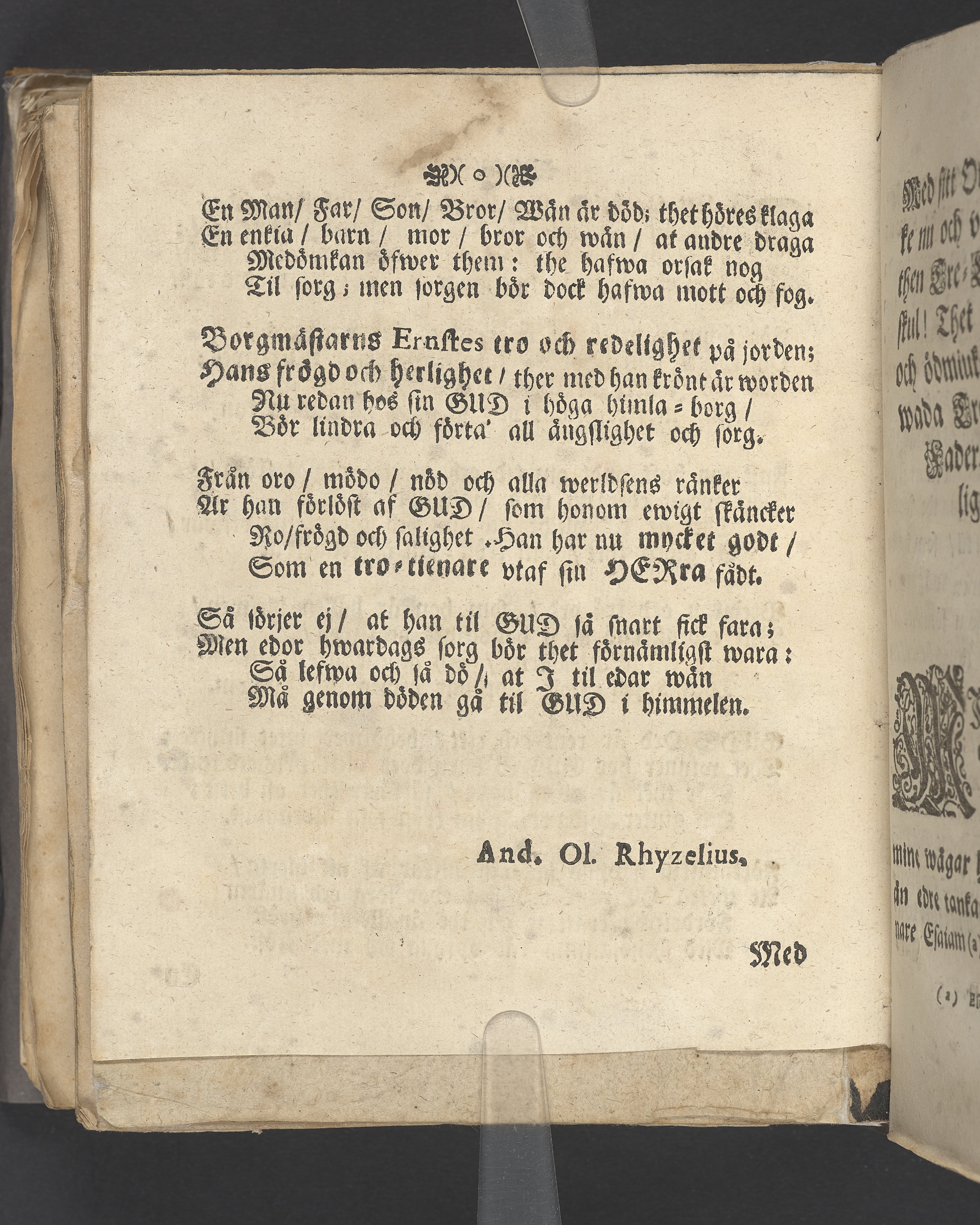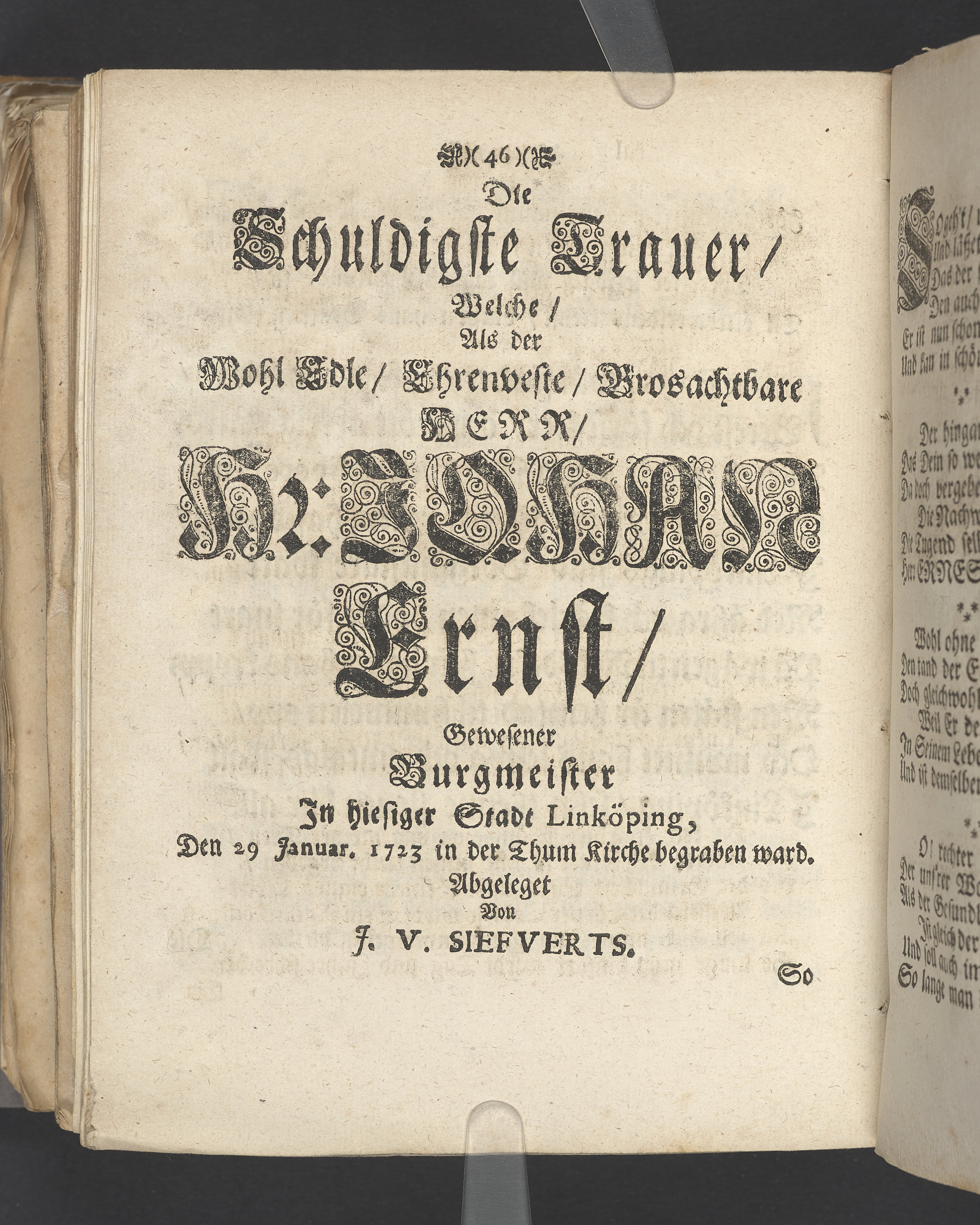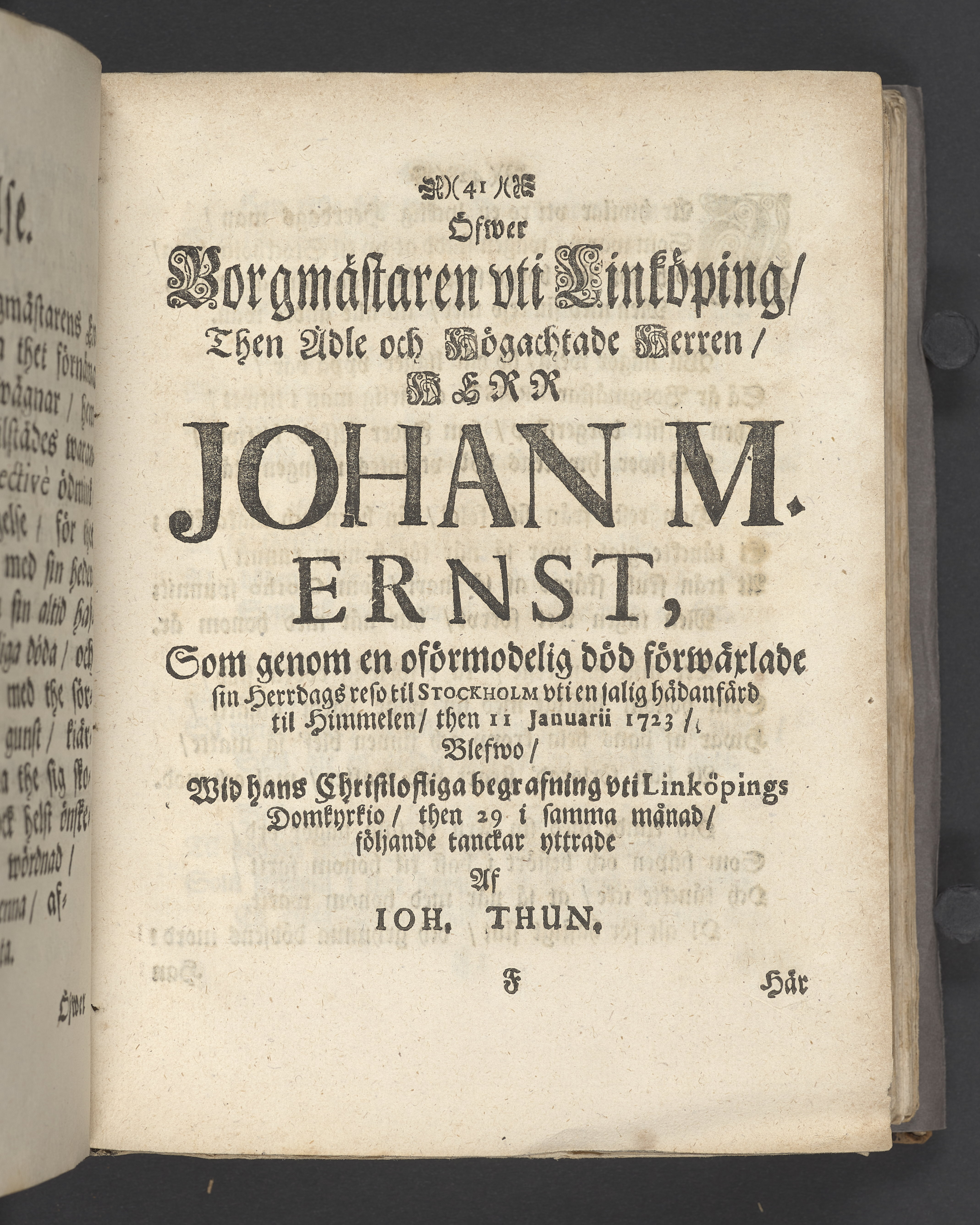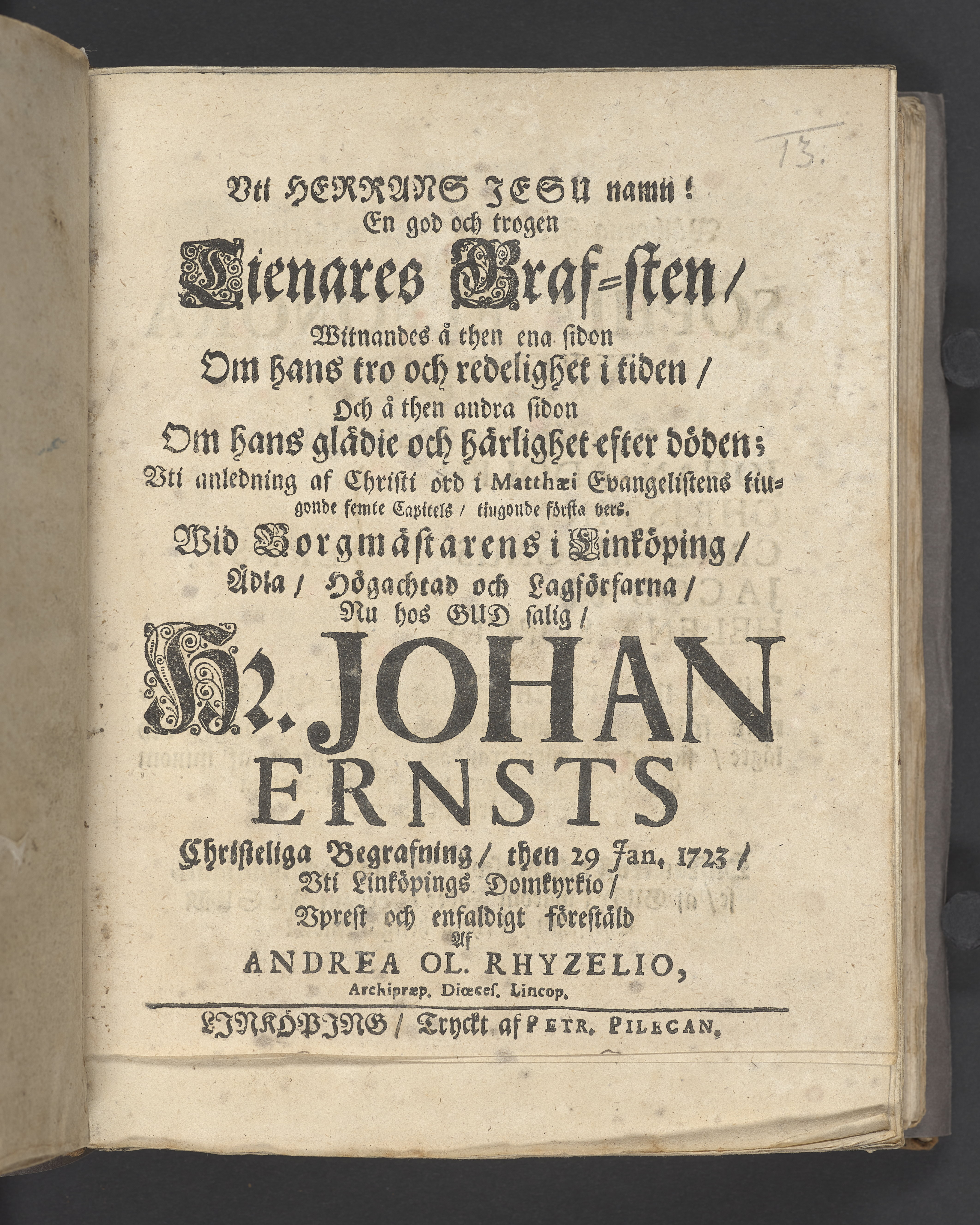 En god och trogen tienares graf-sten, witnandes å then ena sidon om hans tro och redelighet i tiden, och å then andra sidon om hans glädie efter döden; vti anledning af Christi ord i Matthæi evangelistens tiugonde femta capitels, tiugonde första vers. Wid borgmästarens i Linköping ... nu hos Gud salig, hr. Johan Ernsts christeliga begrafning, then 29 jan. 1723, vti Linköpings domkyrkio, vprest och enfaldigt förestäld af Andrea Ol. Rhyzelio ... Linköping, tryckt af Petr. Pilecan.