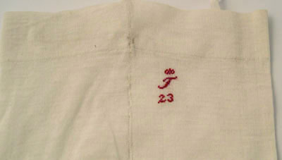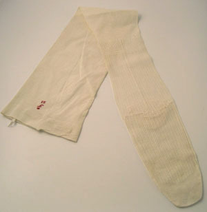 Vit bomullstrumpa med en 23 mm fåll upptill. På fållen är en vitt instickad siffra, 140 samt bokstaven, x. Maskinstickad. Benet är formsytt med en sömm bak ner till hälen. På fotens båda sidor är sömmen antaligen ihoppsydd. Från tån och till övre ankeln är det en randigt ihålig mönsterstickad dekor som avslutas med ett geometriskt mönster. Under fållen är ett rött broderi med bokataven, T med en krona och bokstaven 23 under. Invändigt vid fållen i sömmen bak är ett smalt bomullsband, 3 mm fäst.