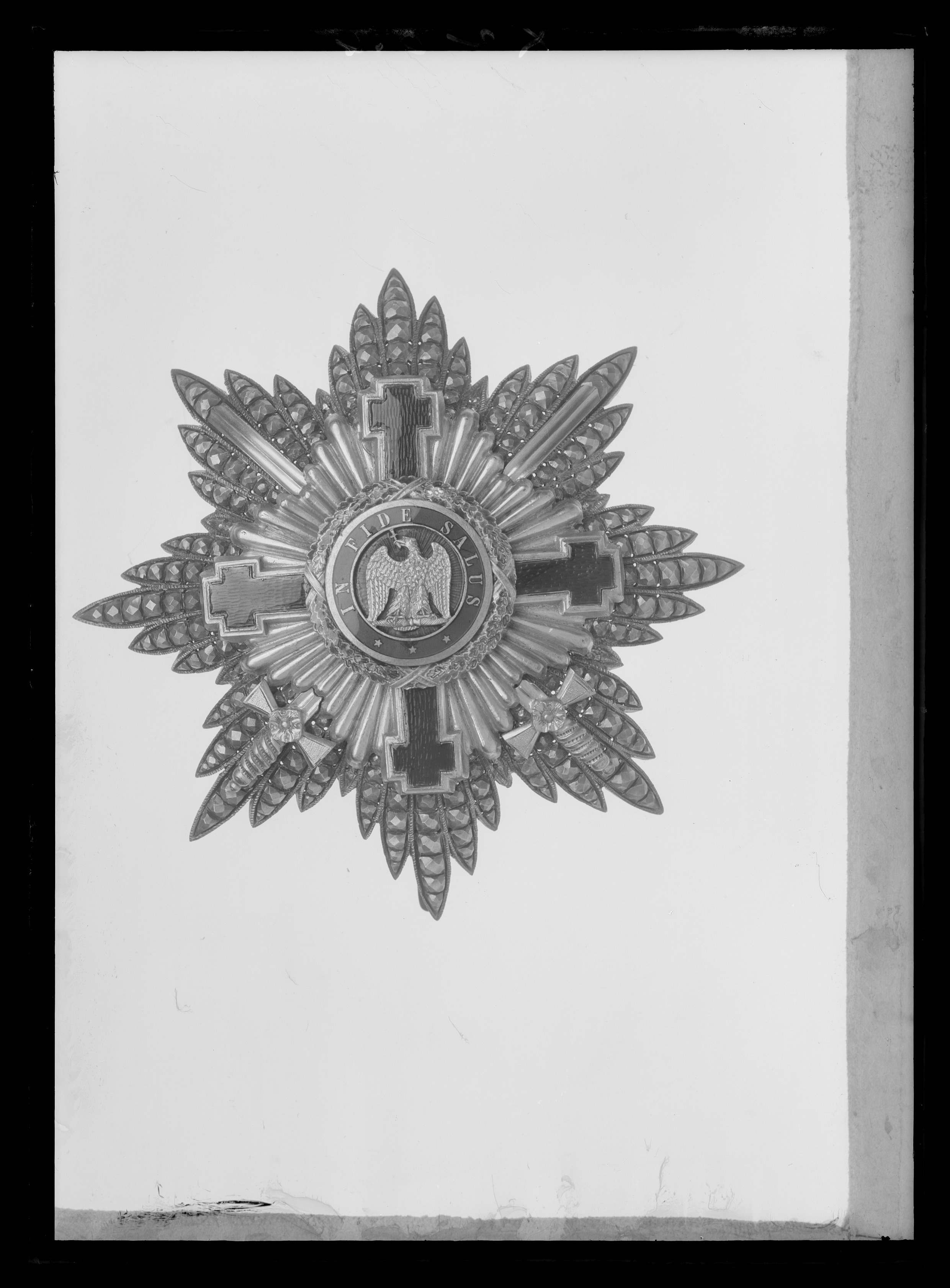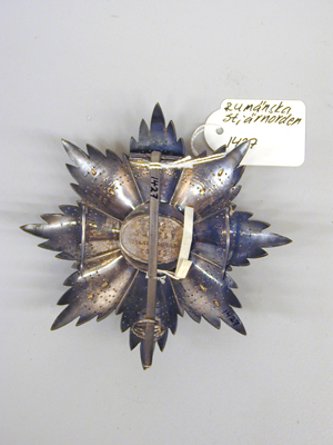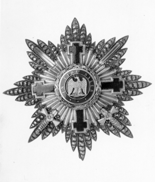 Åttauddig, flinkerad strålstjärna av silver, varje udd består av fem spetsiga blad med fasseterade kulor, mellan uddarna ett kortare blad. På stjärnan fäst ett blåemaljerat korsat kors av förgyllt silver, mellan korsarmarna tio förgyllda, rundade strålar av olika längd, därbakom två korslagda, förgyllda svärd med spetsarna uppåt. Platt, rund medaljong täckt med röd, genomsynlig emalj, därpå fäst den rumänska örnen av förgyllt silver, sittande på åskknippe(?), kors i näbben. Däromkring en blåemaljerad ring med guldtext: "IN FIDE SALUS" samt tre stjärnor, smal guldkant på insidan, bredare på utsidan. Däromkring en grönemaljerad eklövskrans, omlindad med korsade band vid korsarmarna. På medaljongens baksida fäst ett firmamärke i form av oval silverplåt med text: "N,o 46 //KRETLY // PALAIS-ROYAL // PARIS" mot punsad bakgrund. Vertikalt placerad säkerhetsnål samt två hakar.