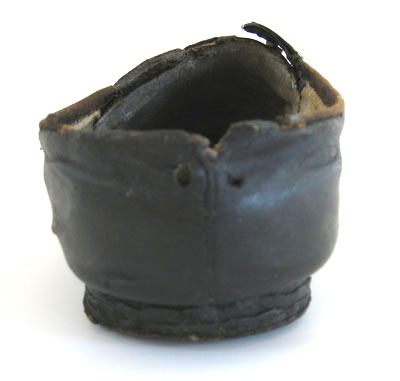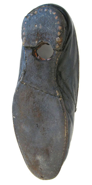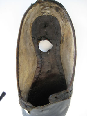 Skon är skuren i ovanläder och bakkappa med slejfar. Hälen är spannat. Skon har en rundad tå och är kantad med vit getskin. Plösen är bortsliten. Sulans undersida är sydd med en grov tråd och har en skarv. Klacken är 45 mm hög och gjort av fyra lagar läder.