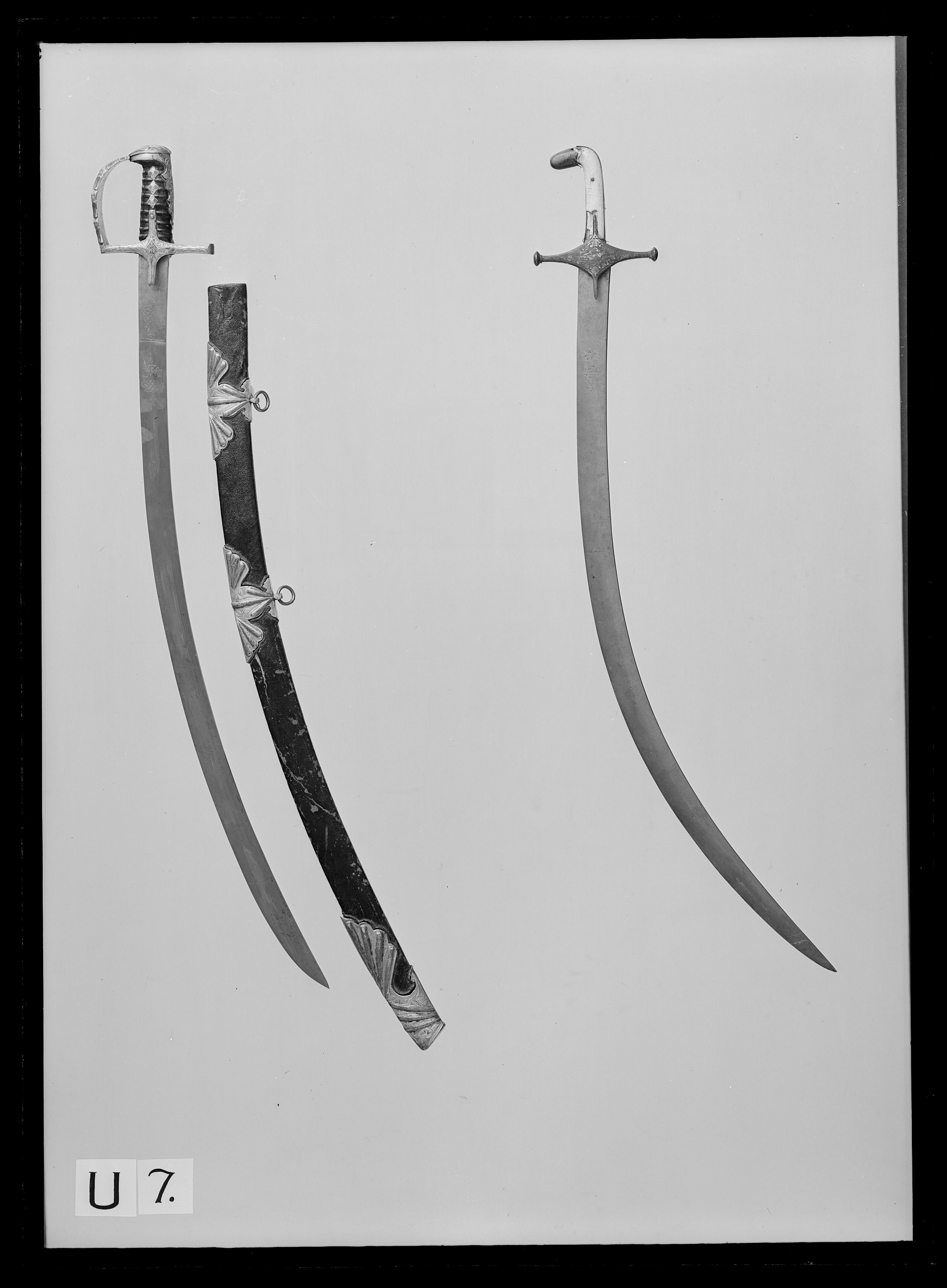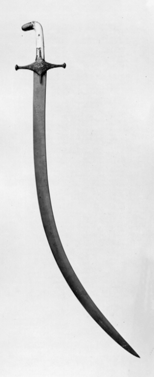Fäste med framåtböjd överdel. Raka parerstänger av stål avslutade med knoppar i ett medstyrskenor allt ornerat med påslaget guld delvis utplånat. Kappa av stål med flikig nederkant. Framtill och baktill skena av silver med ranka av påslaget stål. Kaveln klädd med fastnitade plattor av vitt ben. Klinga av damaskerat stål 36 mm bred, böjd, eneggad. Signerad i två fält "Bandeye shaheVelayat Esmaii)" Sha Esmails tjänare. Kalb Ali (1) 112 eh = 1700, i påslaget guld.
