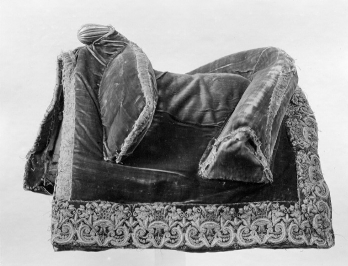 Sadel av purpursammet med rektangulära kappor, fodrade med brunt skinn och kantade med svart skinn. Sitsen kantad med guldgaloner, på den och på bommarnas insidor stickningar med guldtråd. Tvådelad frambom, 450 mm bred, 50 mm hög. Bakbom 540 mm bred, 100 mm hög, med stödbommar kantade med guldgaloner. Rundad, räfflad, framtill utdragen sadelknapp av förgylld mässing. Framför frambommen på ena sidan nio, på andra åtta tännlikor av förgylld mässing, bakom bakbommen 20 stycken likadana. Bom överklädd med väv. Fyra stroppar av läder (tre vita, en brun) för sadelgjord. Två byglar för stigläder, två söljor för förbygeln.