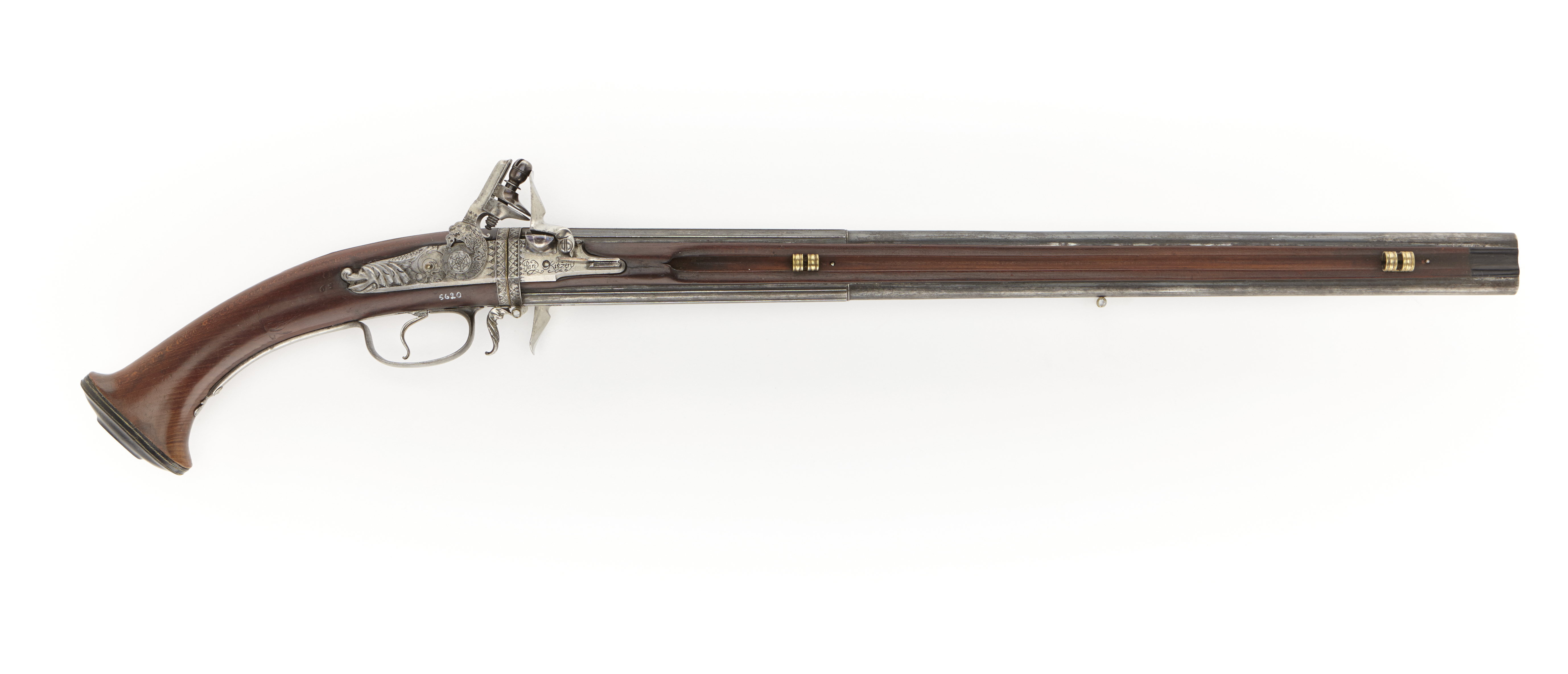 Runda pipor av blånerat stål. Över kammardelen åttkantiga med siktplan och sidoåsar. Den ena pipan över den andra, men ej förenade. På siktplanen inslaget "I.K" över dubbelörn (Stöckel nr 573, 574). Flintlås. Låsblecket avdelat framför hanen, främre delen med fängpanna och batteri, är fastskruvad vid framstocken. Låsbleckets bakre kant utformad som delfinhuvud. Hane med lös överkäke, plommonformig hanskruv. Hela hanen med graverad dekor. Under fängpannan signerat " a Maestricht ". På pipans vänstra sida motsvarande låsbleck med fängpanna och batteri, signerat " Jan Kitzen ". Hel stock av rödbrunt trä. Oval kolvkappa av ebenholtz med förhöjt centrumparti. Runt kolvkappan inlagt dubbel mässingstråd. Framstocken med på över och undersidan ränna för piporna. Näsband av ebenholtz. På högra sidan två profilerade mässingsrörkor för laddstocken. Varbygel av fransk typ. Framför varbygeln delfinformig tapp, vid vars bakåtskjutande piporna kan vridas. Utan tillbehör. Märkt: 65 bakom låsblecket, stanstyp 5376.