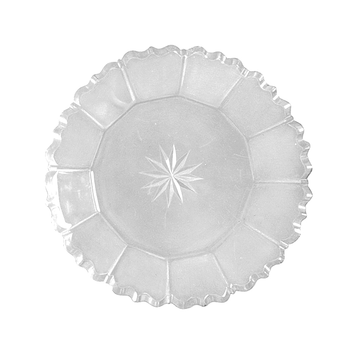 ASSIETTER, tre stycken Runda, med snett utstående tolvsidig kant och plan botten, varje sida med konturerad ytterände, på bottnens undersida en tolvuddig stjärna av radiellt ställda skär. Mått: H: 2; D: 11,3 cm.