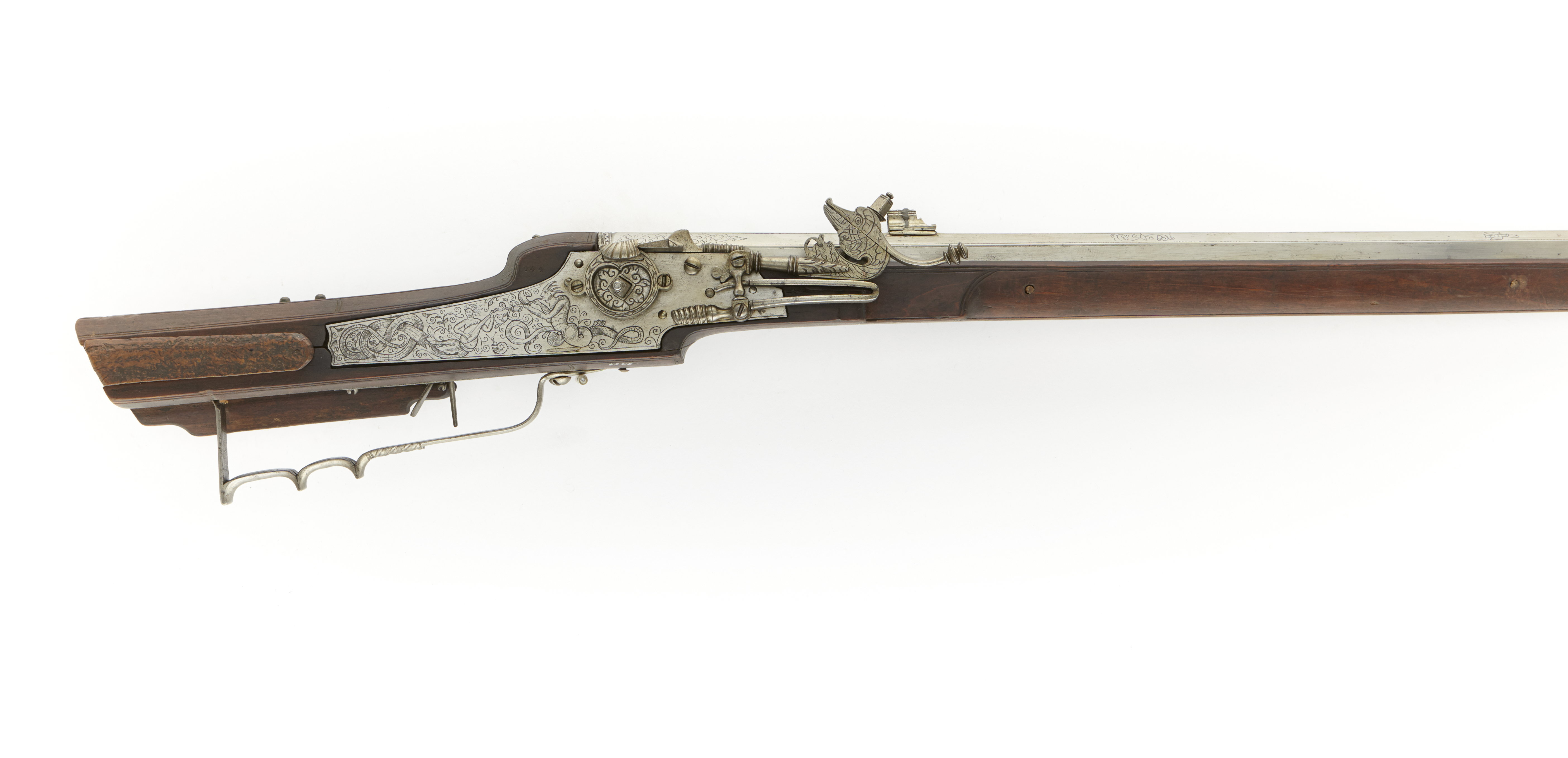 Åttkantig pipa av stål, åtta räfflor. Framför siktet är stämplat: "HH"(Stöckel nr 2885, Heirich Höpken, Bremen, ca 1615 - 1620). Det finns graverad dekor i form av bladrankor. Svansskruvbladet har en graverad bandfläta. Kulissikte av stål och stolpkorn av silver. Tre piphäften. Hjullås. Låsbleck, bakåt av smalnande genom ett fall. Graverad dekor i form av havsväsen spelande luta och horn. Hjulet är fastskruvat med en hjärtformig ring kl. 9 och kl. 3. Låg, vertikal krutskärm. Hane utformad likt ett odjurshuvud. Lös överkäke med fingergrepp avslutat i en profilerad knapp. Vertikalhjulstudel. Hel stock av brunt trä, tysk kolvtyp. Sluten laddstocksränna. Kolvlådelocket är av masurliknande trä. På kolvryggen finns två små mässingsknappar. Två låsskruvar med runda benbrickor. Pipstift. Näsband och rörka av ben. Varbygel med två och ett halvt fingerläge. Avtryckare med snälltryck. Tillbehör: Laddstock med gängat stålrör. Blånor. Märkt: 444 ovanför låsblecket, stanstyp 5376. Enligt 1710 års inventarium p. 58, rum III: "94-444-1 Reflebyssa blanck H.H. på pijpan låsen rijtat -8-".