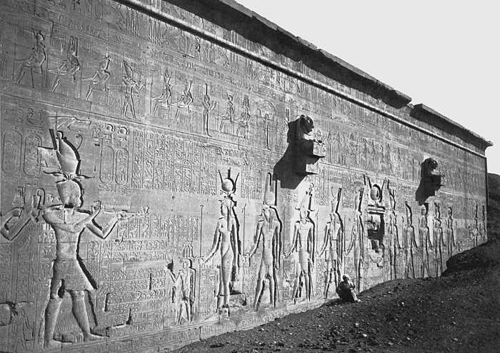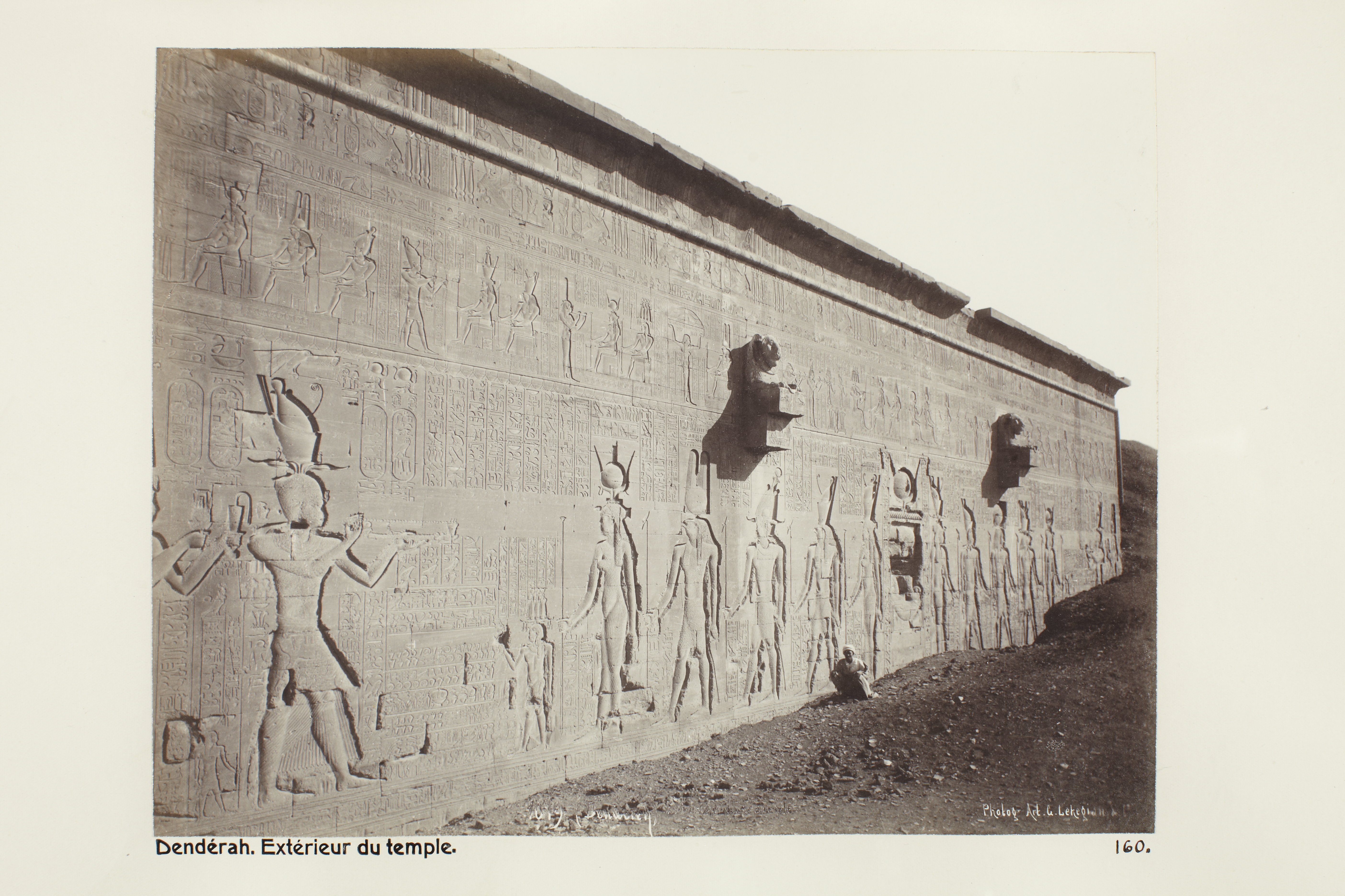 Dendera, Egypten. Templets exteriör. Text på fotografiet: Dendérah. Extériur du temple Fotografierna LXVI:M.01.- 201. kommer från resan till Egypten och Sudan som Wilhelmina och Walther von Hallwyl gjorde vintern 1900-1901. De lämnade Sverige den 5 november 1900 och fortsatte från Egypten till Palestina den 28 mars 1901. Med på resan var döttrarna Ellen med maken Henric de Maré och Irma med maken Wilhelm von Geijer. Wilhelminas sällskapsdam, fröken Ida Uhse reste också med. Under en del av resan anslöt sig ledamoten av Internationella domstolen i Kairo, assessorn Otto Conrad Waldemar Cedercrantz med makan Anna Elisabeth. Vid resan uppför Nilen hade Walther von Hallwyl hyrt ångfartyget Columbia med besättning. Båtresan startade i Kairo 27 december 1900, gick ända till Wadi Halfa varifrån man reste vidare med tåg till Khartum och tillbaka till Wadi Halfa. Båten vände åter i riktning mot Kairo, men det verkar som att sällskapet tog tåg sista biten, från Luxor. Henric och Ellen de Maré samt fru Cedercrantz lämnade båten redan då de passerade Luxor första gången. Resten av sällskapet återvände till Kairo den 1 mars. Fotografierna LXVI:M.01.-120. togs av resenärerna själva, de största av Ellen de Maré, de mellersta av Wilhelmina von Hallwyl och de minsta av Wilhelm von Geijer. Resten köptes av professionella fotografer i Kairo, de flesta från Studio Photogr. Artistique G. Lekegian & Cie. Alla uppgifter kommer från Ida Uhses reseanteckningar. Inköpt hos studio Photogr. Artistique G. Lekegian & Co.