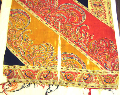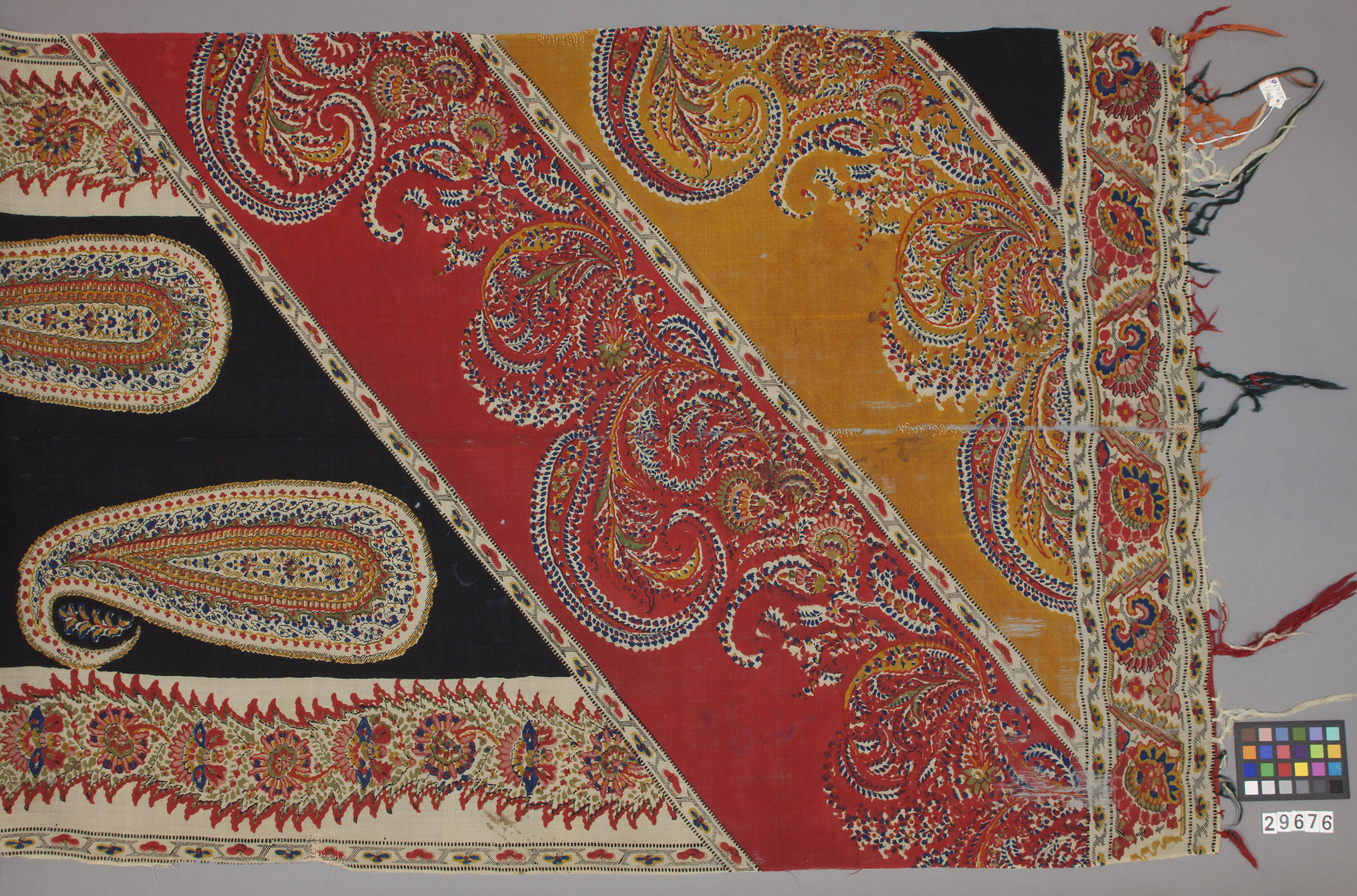 Sjal med svart mittfält, dekor i färgerna beige, rött, blått, grönt, svart och gult. Kashmirsjal som tillhört drottning Lovisa av Sverige. Gåva av fröken Svea Björeby (f. 1897). Har tillhört givarinnans mormor, finkokerskan vid Stockholms slott Klara Mathilda Nilsson (1842-1924), som fått den i gåva av en hovdam.