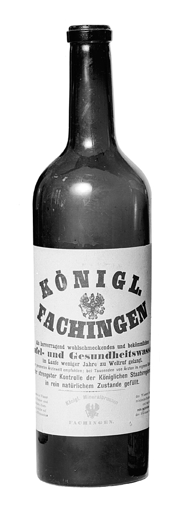 KÖNIGL. FACHINGEN, TAFEL-UND GESUNDHEITSWASSER, tolv helbuteljer Av mörkgrönt glas. Cylindriska, med kupigt indragen skuldra och smal cylindrisk hals med stärkring; bottnen skålig. Etikett ljusgul, på denna text och Preussens vapenbild i mörkblått, nedtill i rött: "Königl. Mineralbrunnen Fachingen". Höjd: 30 cm.; diameter: 8 cm.