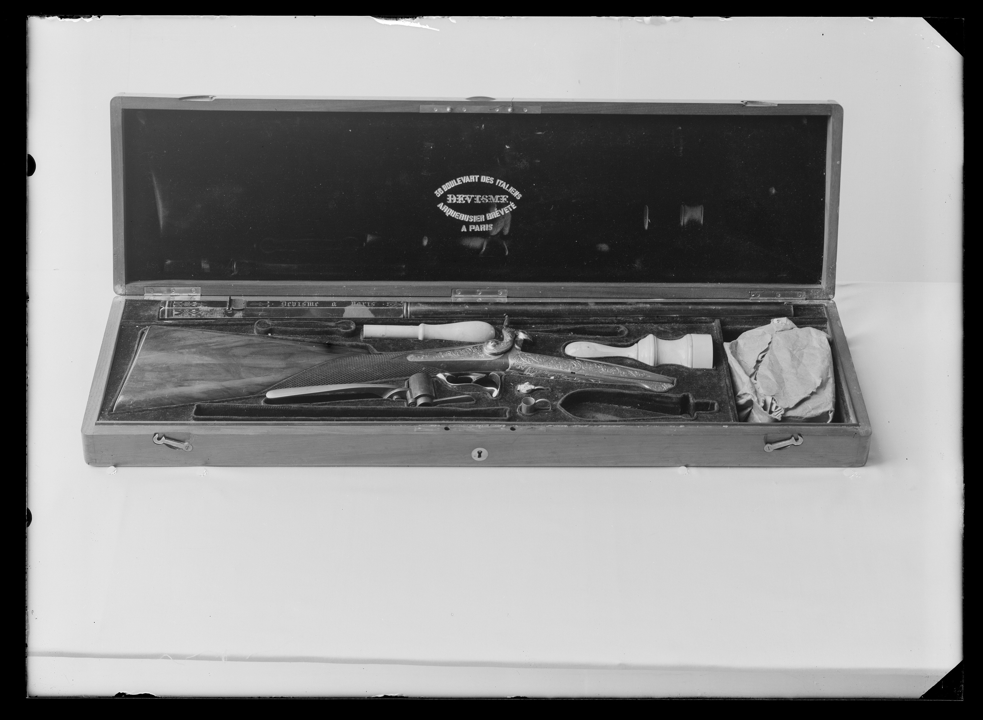 Rund. blånerad, räfflad pipa med åttsidigt kammarstycke, 10 räfflor, vid övergången en svarvad ring. På kammarens ovansida inläggningar av silver, vid pipbasen ett tvärgående brett band, därframför liksom framför siktet och vid den kantiga delens framände smala band-rankor, framför siktet dessutom signatur av silver, frakturstil: "Devisme a Paris". På den stora pipklackens platta stämplar, två ovala stämplar med D V krönt av sluten krona, Stöckel nr 242, därframför till v: "CANON DE PARIS", till h: "FAIT PAR DEVISME", på pipans kantiga del mellan stora och lilla pipklacken stämplat: "N:o 1725 // AN 1859", framför lilla pipklacken: "1859 // N (spegelvänt) // 438". Riktmedel: Inlaxat klaffsikte av stål, en fast och en uppfällbar klaff, stolpkorn av stål. Pipan fäst med vridregel vid förstocken. Baskyl av utvändigt förnicklat stål med yttäckande rankdekor, delvis i relief mot streckad bakgrund, långt baskylblad längs kolvhalsen till näsan, pipplatta med åt h. vridbar slutnyckel, förstock fäst med gångjärn och åt v. vridbar låsnyckel för pipan. På pipplattan stämplat: till v: "N:o 1725", till h: "AN 1859". Hanlås av utvändigt förnicklat stål med bakåtliggande slagfjäder. Välvt låsbleck med rankdekor som på baskylen, vid överkanten på bakänden graverad signatur i frakturstil: "Devisme a Paris". S-formig, något rundad hane med s-formigt slaghuvud med nätskuret tumgrepp. Länk nöt-slagfjäder, vid låsbleckets framände stämplat: "N:o 1725 AN 1859". En låsskruv. Svagt böjd avtryckare. Kolv av valnöt med nätskuren kolvhals. Beslag av utvändigt förnicklat stål med rankdekor som på baskylen, bakplåt med lång flik på kolvryggen, dekor endast på fliken. Rund låsskruvbricka med två runda utskott, bladdekor. Avtryckarbleck, framtill fäst i baskylen med skruv, baktill utdragen längs hela kolvhalsen, rankdekor samt band med nr: 1725. Varbygel med kluvna stolpar, s-formigt svängd bygel med volut vid framstolpen, rankdekor.