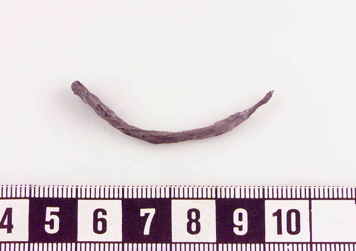 Rundad ten med tillbakaböjd ände. Avbruten i den andra änden. Skadat ytskikt.