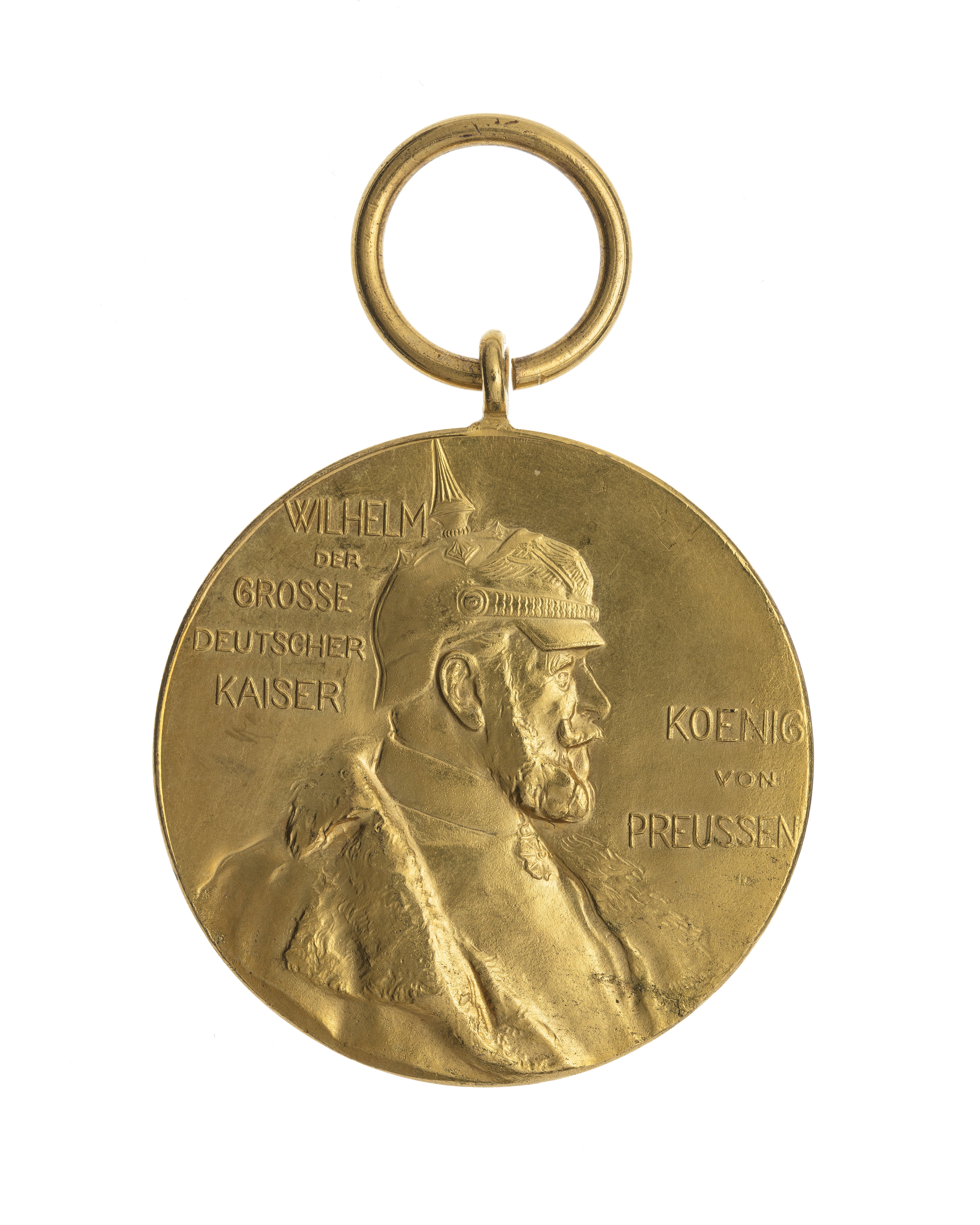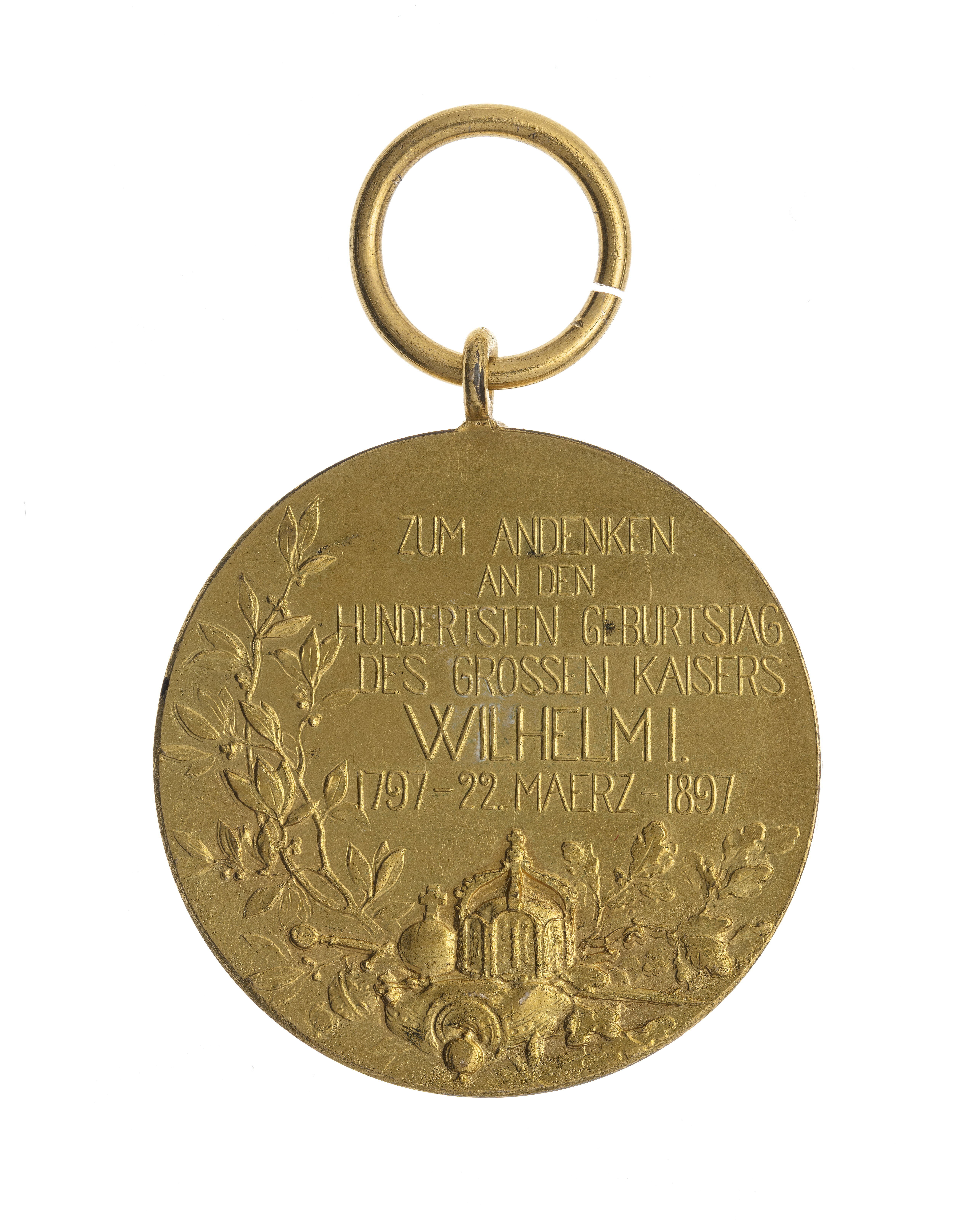 Medalj av förgylld brons, tillverkad hos firma L. Osterman, Berlin. Åtsida: Wilhelm I, bröstbild, profil h, skägg och mustascher, pickelhuva, uniform med ordenstecken, pälsbrämad kappa. Relieftext upptill till v: " WILHELM // DER GROSSE // DEUTSCHE KAISER ", till h: "KOENIG // VON // PREUSSEN ". Frånsida: lager- och ekkvist längs kanten från kl. 4 till kl. 11, därframför på ett hyende den tyska kejsarkronan, svärd, äpple och spira. Därovanför relieftext: " ZUM ANDENKEN // AN DEN HUNDERSTEN GEBURTSTAG // DES GROSSEN KAISERS // WILHELM I. // 1797-22. MAERZ-1897 ". Upptill en fast, tvärställd ring och däri fäst bandring.