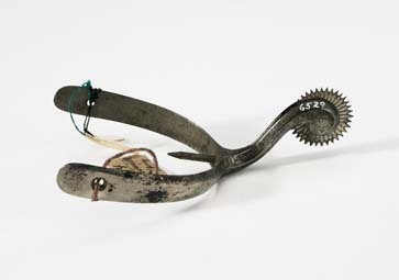 L: 106 mm, b: 64 mm, vikt: 35 g Sporre av förnicklat stål. U-formade byglar, baktill fasade, framtill plana med hål i ändarna. Baktill på insidan 18 mm lång spets att stickas in i klacken. Uppåtböjd, svagt u-formad, sexkantig hals med fintandad klinga.