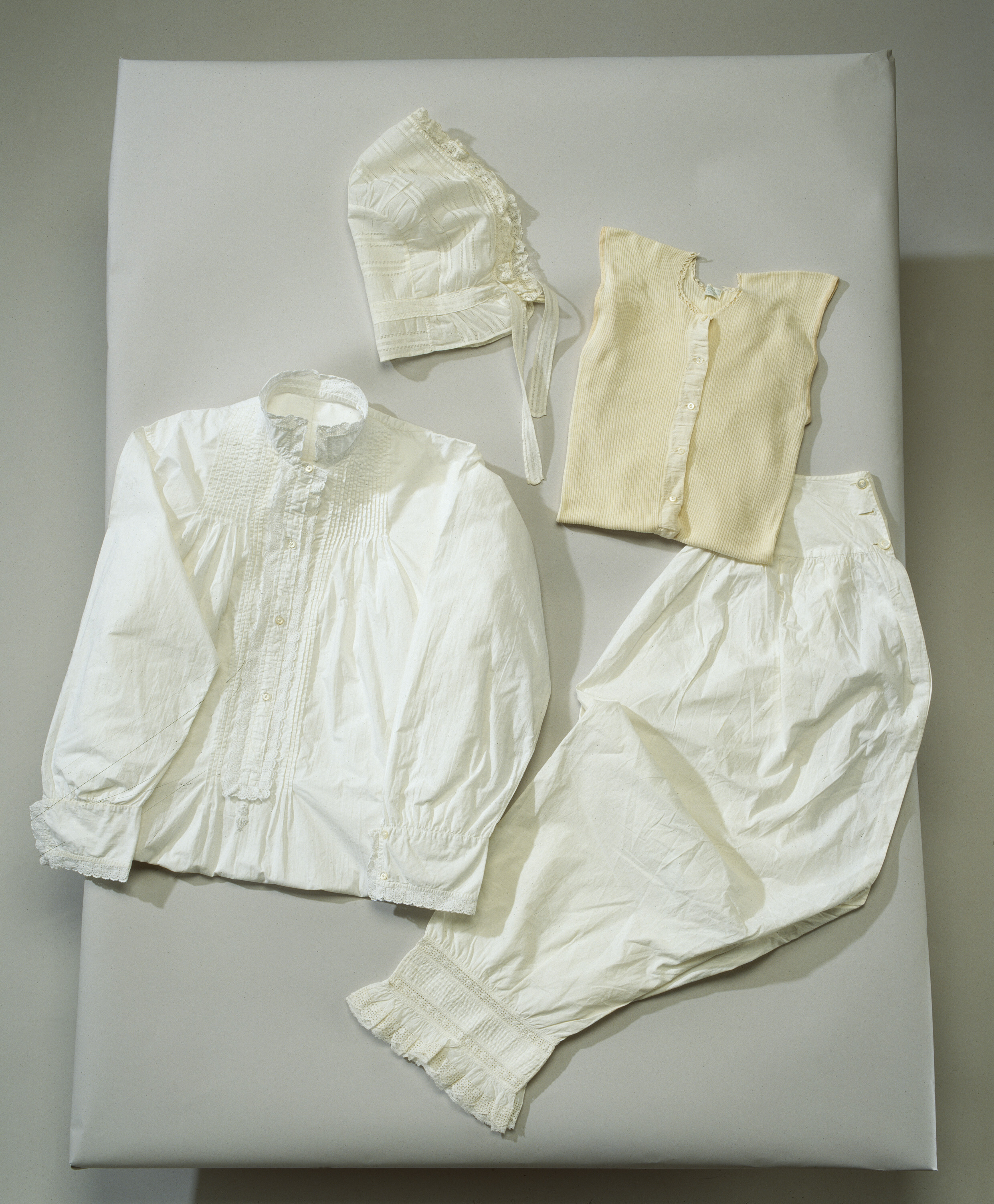 Långt nattlinne i vit fin bomulllärft skuret med kilar i sidorna. Nattlinnet har långa ärmar, ståkrage och knappslå fram. Den är 41,5 cm lång, knäpps med fyra pärlemoknappar och kantad med maskinvävd brodyr. Under knappslån är broderat Victorias monogram under kunglig krona. Ärmarna har manschetter som knäpps med två pärlemorknappar, 8 mm i diameter. Manschetterna är dekorerade med en två cm bred maskinvävd brodyr, likaså är kragen.