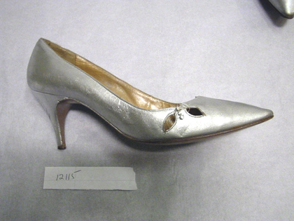 Sko av silverfärgat skinn (kalv?), med spetsig tå och söm mitt bak. Ovanlädret och bakkappan förenas med en innersöm på högra sidan. På tåpartiets högra sida finns två bladlika , genombrutna utskärningar. Mellan dessa är fäst ett strassmycke i form av tre infattade, slipade glasbitar. Klacken är insvängd, hög och smal samt har en brun stiftslapp fäst med en spik i vitmetall. Foder och innersula av ljusbrunt skinn (kalv?). På innersulans hälparti finns en oval guldstämpel med text inuti: "Bally // NORWICH" samt under: "made in England". På innersulans hålfot finns en guldstämpel: "MADE SPECIALLY FOR // A/B nordiska Kompaniet // STOCKHOLM". På skons högra innersida finns stämplat: "X54505/1 /...oläsligt.../ C ENG". Sulan är gjord av brunt läder med ett ristat rutmönster under tåpartiet. På sulan finns en stämpel under tåpartiet med oläslig text i en oval. Under hålfoten på sulan finns en stämpel i form av en liggande halvcirkel med text: "A // IMPORT // 5½ // C".