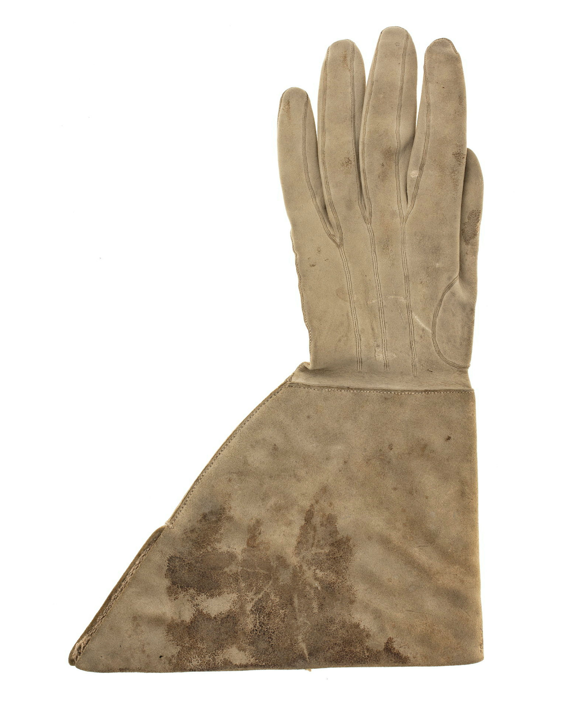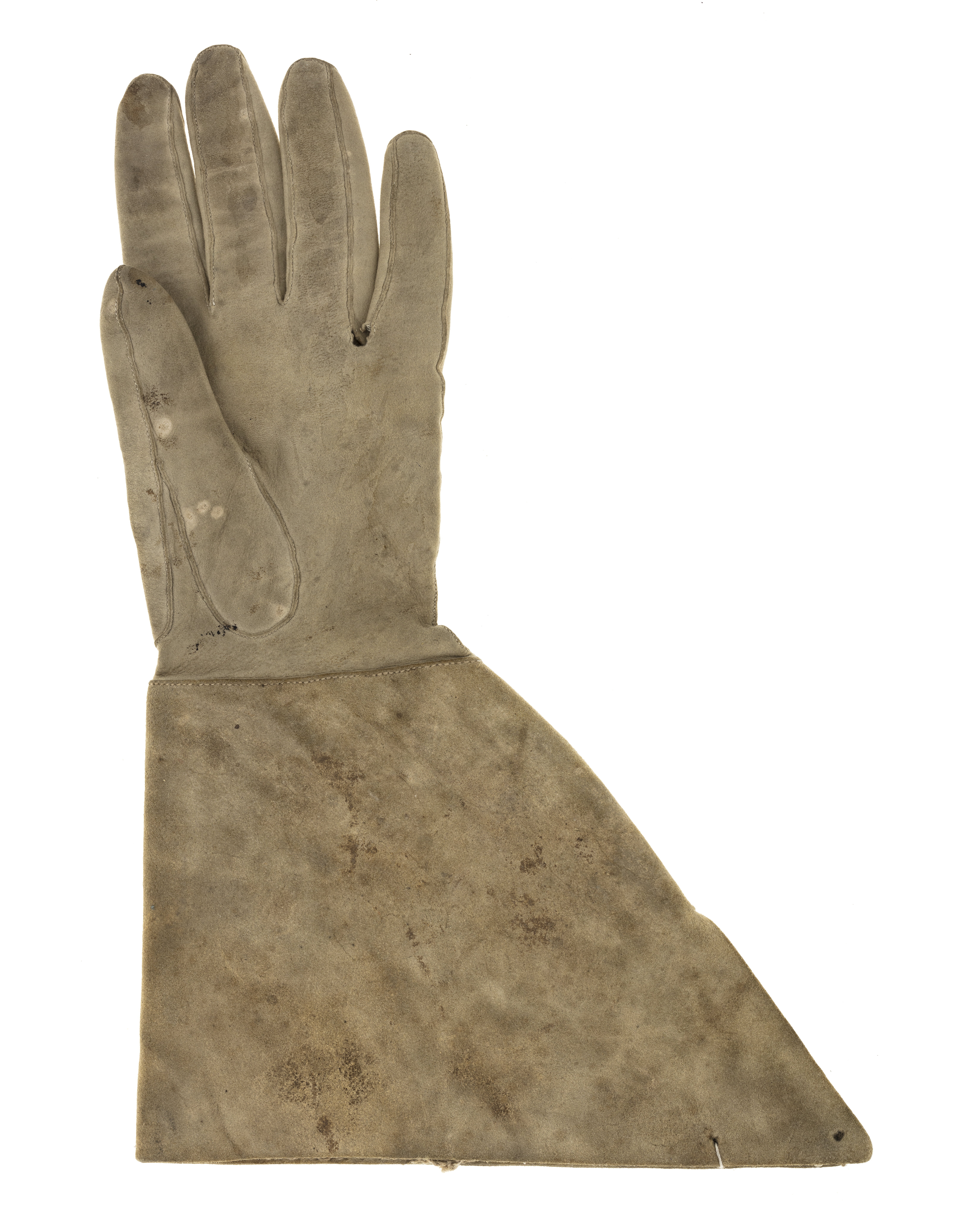 Kragen är sydd av ett 5 mm tjockt älgskinn och handen av ett tunnare hjort- eller renskinn. Kragen har på insidan ett 100 mm långt sprund. Handen har på ovansidan tre dubbla rader dekoratiossöm. Kragen har i överkant och runt sprundet förstärkts med ett 27 mm brett, randigt linneband i naturfärg och grått. Vid sprundets överkant finns ett 9 mm brett och 130 mm långt band. Par med höger kraghandske inv 31180Handskarna är samhörande med kappa inv. 31178, uniformsrock inv.31175, väst inv. 31176, byxor inv. 31177, gehäng inv. 31179, halsduk inv.19922, stövlar inv. 31182-83, hatt inv. 31184, skjorta inv. 20875, strumpor inv. 20961-62, stövlingar inv. 20963-64.
