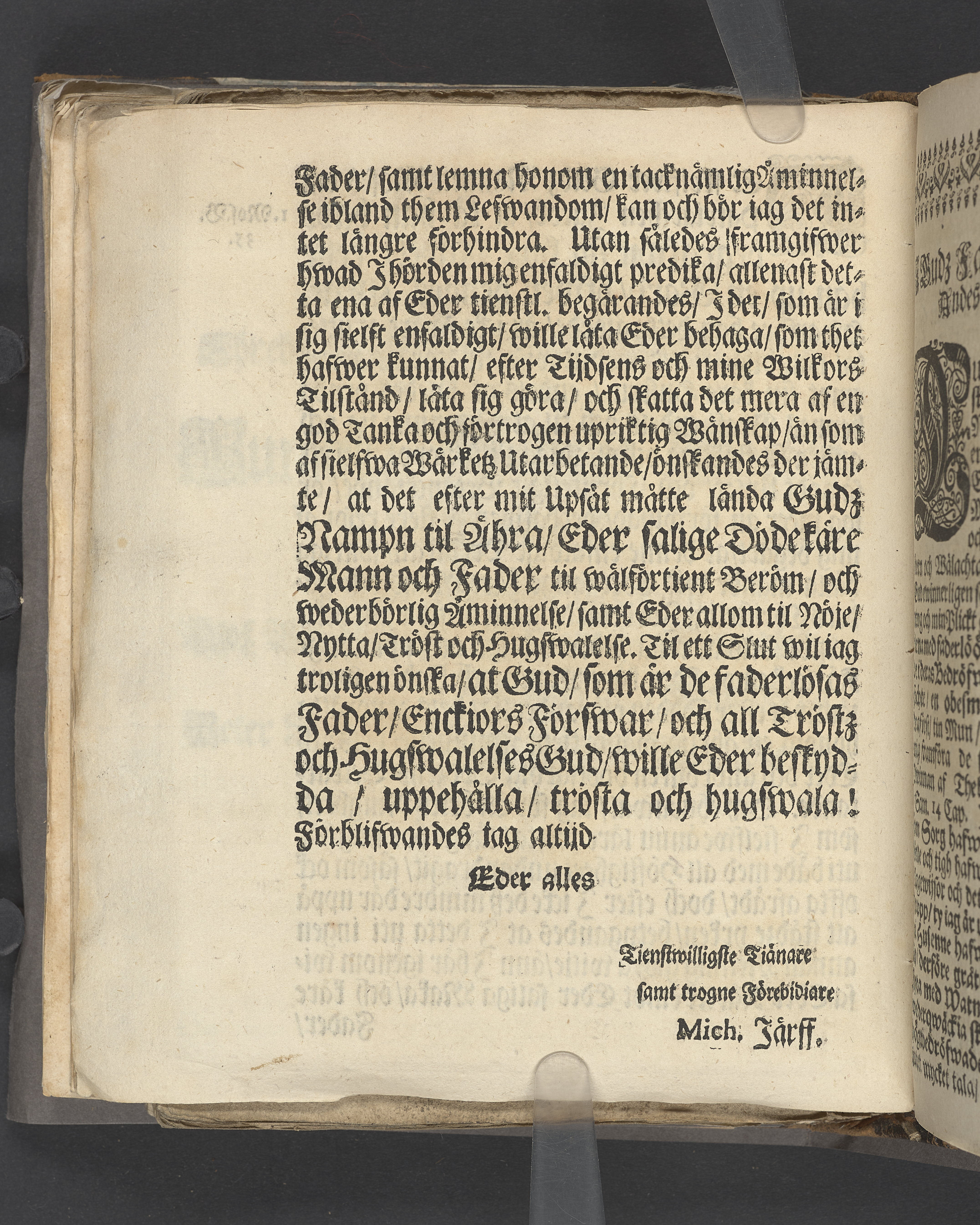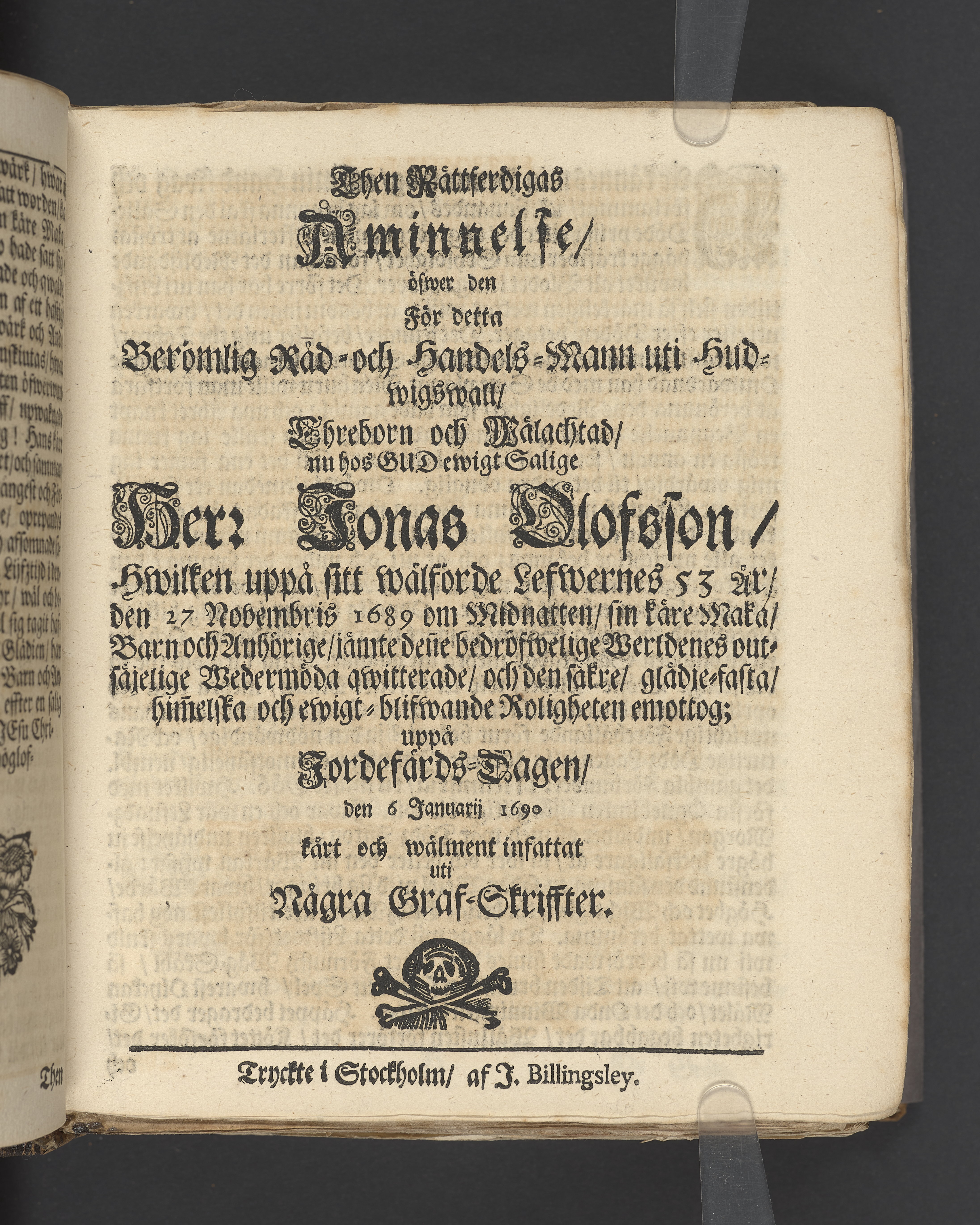 Gudz barns kännetäckn och härlige förmåner, uti en christelig lijk-prediikan, öfwer ... Herr Jonas Olofsson berömlig råd- och handelsmann uti Hudwikzwall ... uti Hudwijkzwallz kyrckia den 6 januarii 1690, förestälte Michaël Järff ... Stockholm, tryckt aff Johann Billingsley, 1692.