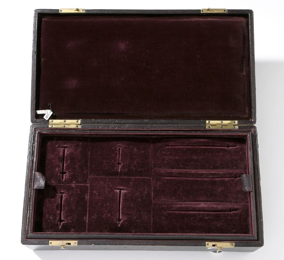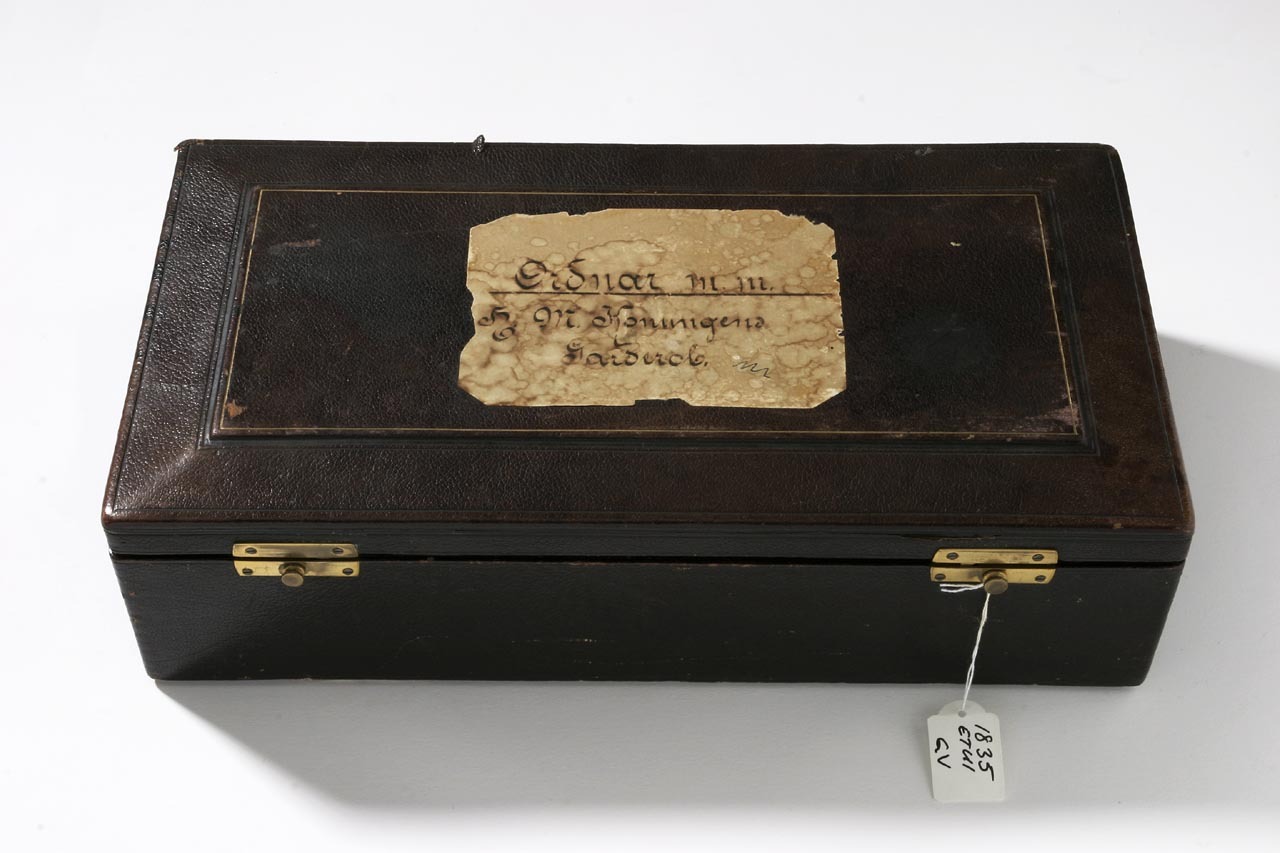 Rektangulärt skrin av trä med ca 20 mm högt lock. Utvändigt klätt med rödbrunt skinn, på undersidan karminröd, mönsterpressad väv. På locket svagt upphöjd rektangel med kantlinje i guldpressning, fastklistrad gulnad och fuktskadad pappersetikett, kanterna skadade, påskrift med bläck: "Ordnar m.m. // H.M.Konungens // Garderob". Två gångjärn av mässing, två lås av mässing med fjäderbelastad skjutregel. Invändigt klätt med karminröd sammet, urlyftbar insats av trä med kanter klädda med rödbrunt skinn, klädd invändigt och på undersidan med samma sammet, invändigt inredning med urtag för fyra kraschaner samt tre medaljspännen.