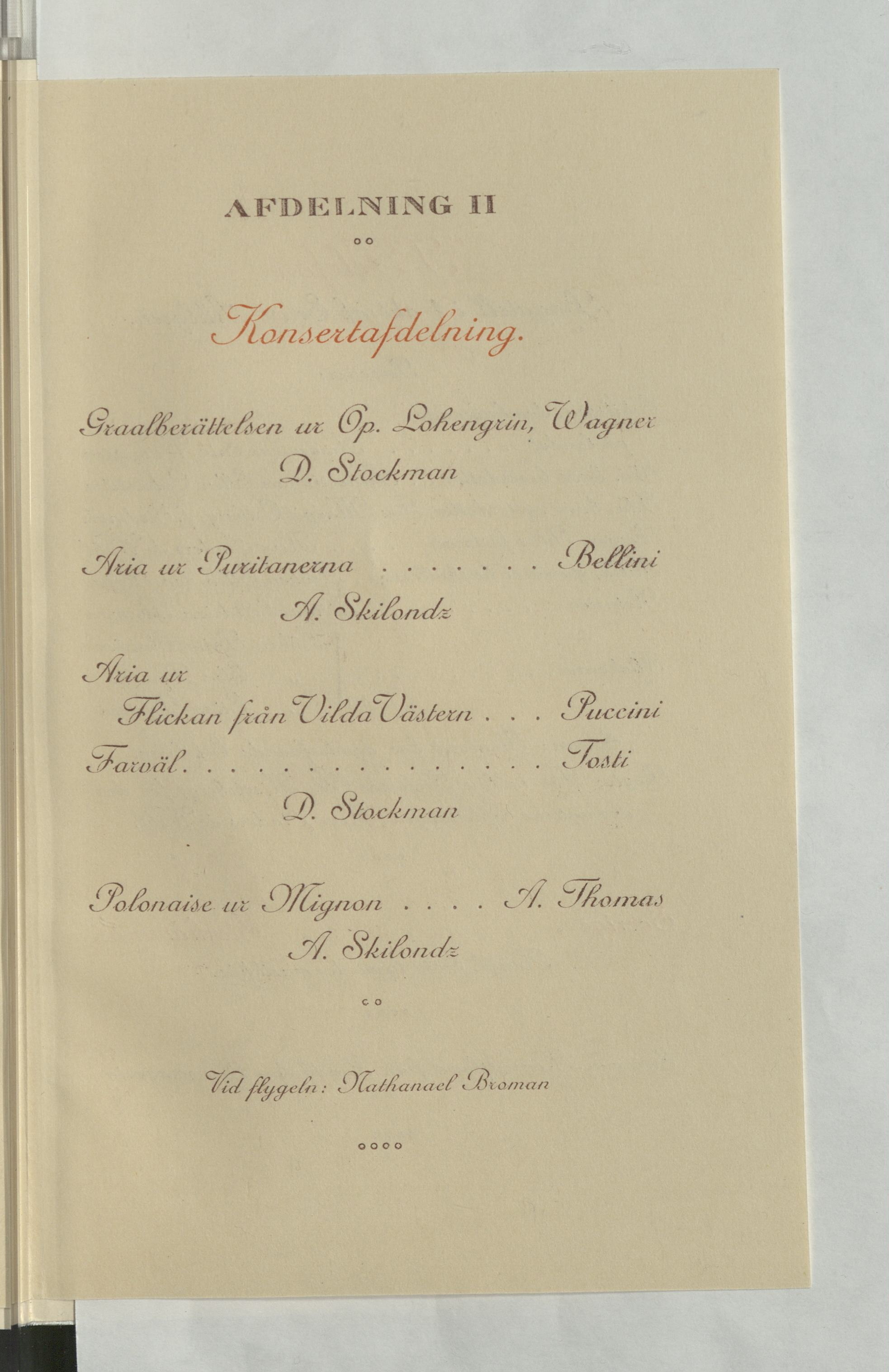 Utdrag ur katalogverket: "Fol. Program 2 st. till föreställningen å Kungl. Teatern. 20 Februari 1917. Sthlm, Jacob Bagges Söners A. -B. Omslag, 4 s. 2 ex."
