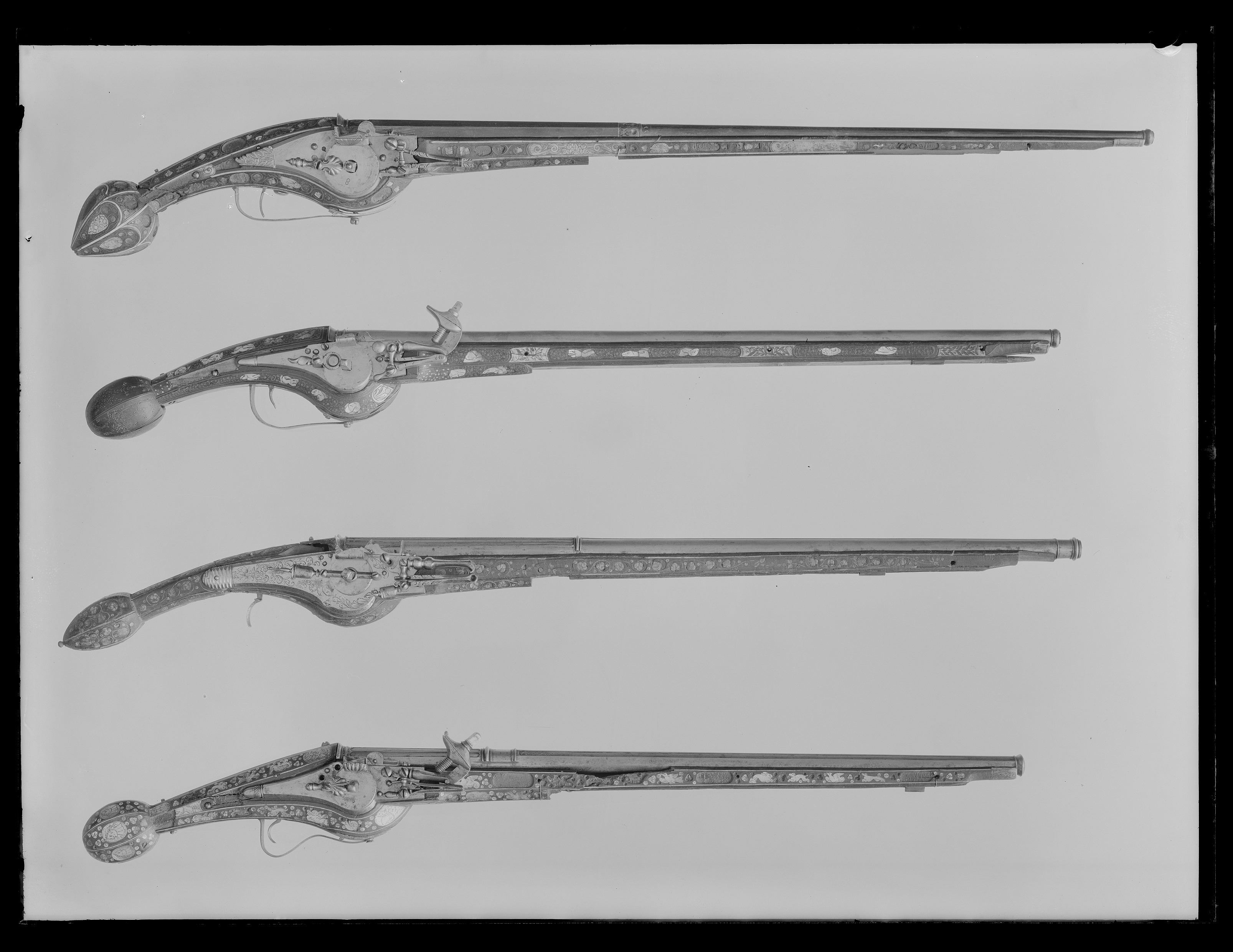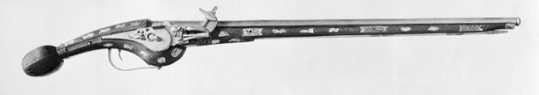 Rund, slätborrad pipa av stål med svarvad ring vid mynningen och hög, svarvad pipbas. Svansskruvblad till kolvkulan, infilad siktskåra vid pipbasen. Fästning: Tre häften. Pipan fäst med en (urspr. två) krysskruv, den främre saknas, dessutom ett pipstift av trä och ett av stål. Hjullås av fransk typ med plant låsbleck med fasade kanter välvd bakspets. Utvändigt hjul fäst med studel kl. 9, ringformig studelplatta och profilerat löv. Fängpanna med rundad undersida, streckdekor, låg, rak krutskärm. Fängpannelock med rörlig arm, fingergrepp med tvärt avskuren framände. Tryckknapp med välvt huvud. Hane med balusterformig kropp. Fyrsidig hals med svängd framkant, lös underkäke, käkskruv med fyrsidigt huvud. Hanfjäder med två skålade fasningar på mitten, streckdekor på ändarna, timglasformig studel, droppformigt fjäderlöv. Hjulaxeln lagrad i sidblecket, slagfjädern fäst med stift genom kolven. Fästning: Två låsskruvar. C-formig avtryckare till h. om underbeslaget. Helstock av trä, nedsvängd vid hjulet. Svagt böjd kolv med oval, sexsidig kolvkula. Dekor med kantlister av mässing, på kolvkulan mässingrankor och centrumplatta av pärlemor. På resten av stocken mässingsrankor med blad av mässing, pärlemorpunkter samt plattor av pärlemor med bladdekor samt på några änglahuvudenoch fåglar. Pipstiftbrickor av ben med bladrankor, två pipstiftplattor för slagfjäderns fäststift saknas. Rörka av mässingsplåt (ej ursprunglig), näsband av ben. Tillbehör: Laddstock av trä (ej ursprunglig), l: 527 mm.