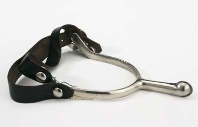 Sporre av stål. U-formade släta skänklar, i ändarna nedböjda och försedda med två knapparpå hals på vardera sidan för remmarna. Rak, rundstavig hals med förtjockad, något nedböjdände. Slät, rund klinga. Rund sölja av stål. Remmar se nr 29582.