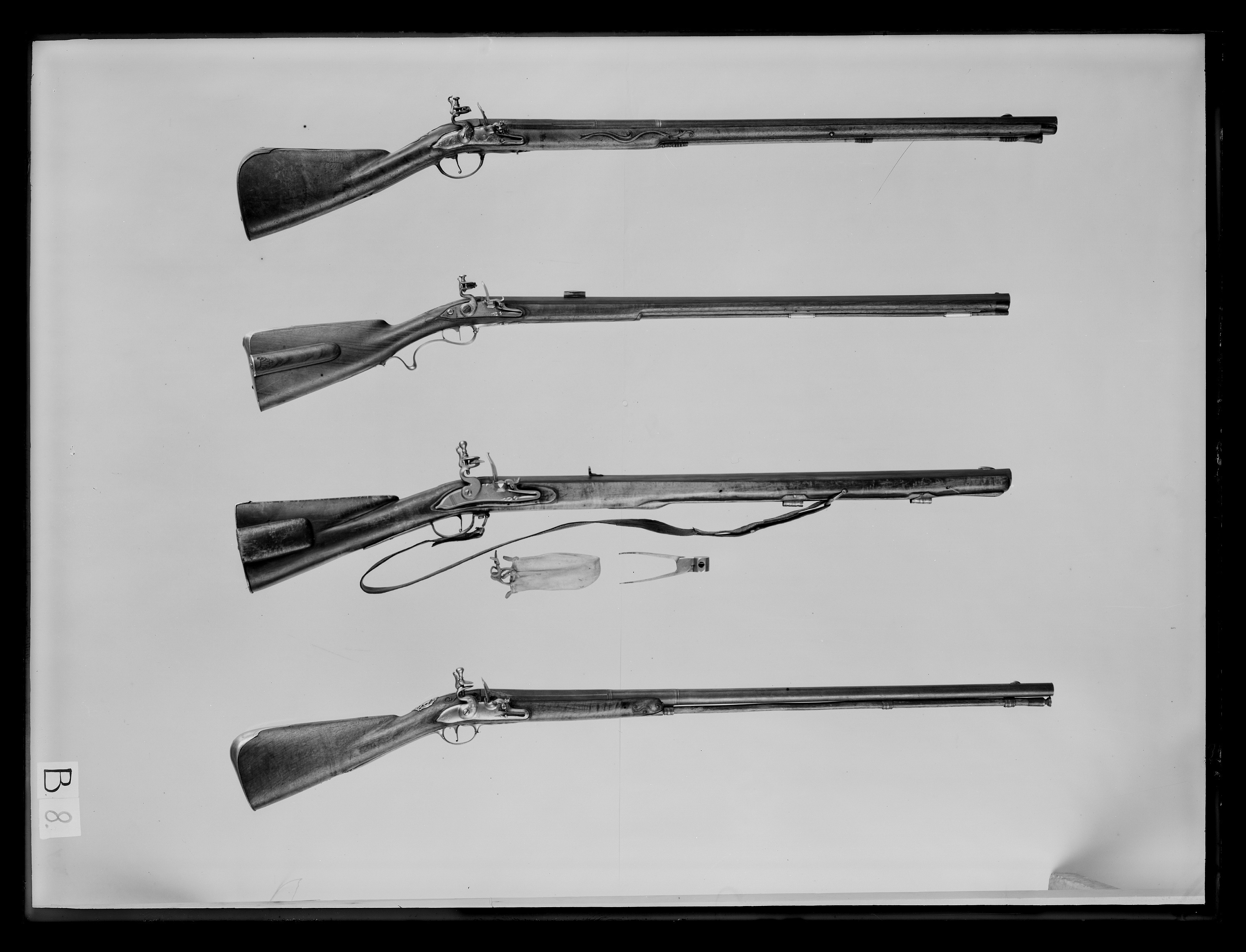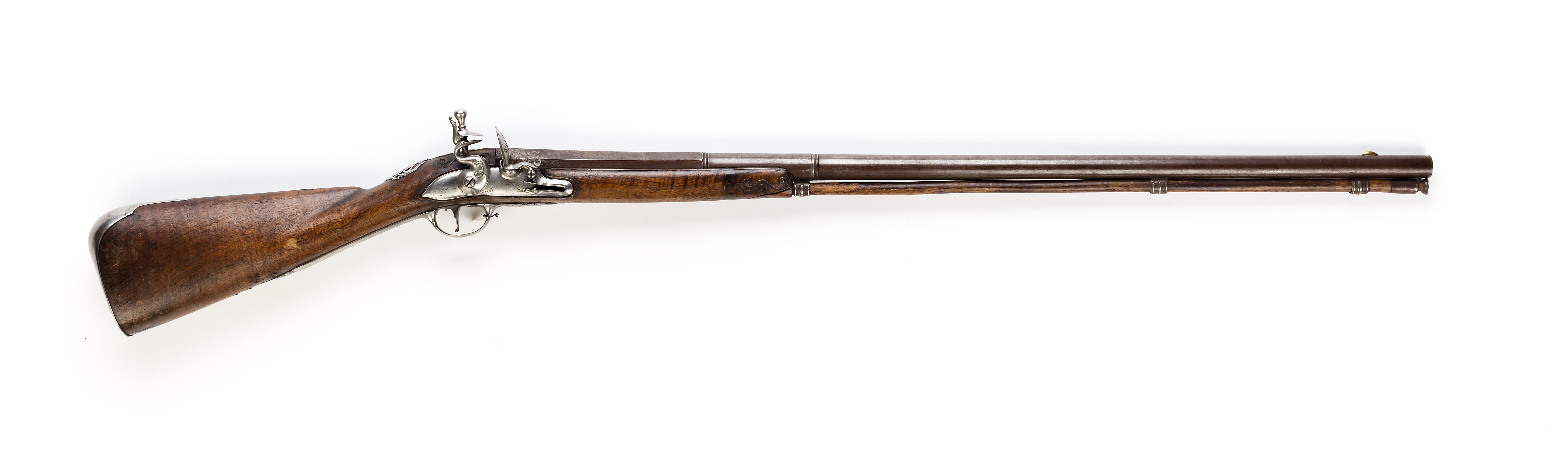 Rund, slätborrad, på ovansidan brunerad pipa, vid övergången samt 100 mm därframför svarvade ringar. Vid pipbasen på sidofaserna graverade pärlstavar. Tvärt avskuret svansskruvblad. På kammarens undersida en djup, Y-formig stämpel (hjärta?) jfr Stöckel nr 5119). Riktmedel: På svansskruvbladet samt kammaren en 150 mm lång skålad siktränna omgiven av graverade kantlinjer, i framänden en graverad blomma. Spolformigt korn av mässing på oval platta. Fästning: På pipans undersida fastlött tre profilerade rörkor. Pipan fäst med kryssskruv samt bakre låsskruven genom svansskruvplattan. Flintlås med välvt låsbleck, smal kantlist, graverad blomma på bakspetsen samt framför hanen. S-formig, välvd hane med drakhuvud och bladranka i stålsnitt på halsen. Lös överkäke, käkskruv med päronformigt huvud. Rundad fängpanna med skålad fals, sicksackbård på överkanten. Spetsigt eldstål med välvd rygg, bladranka i stålsnitt, fot med kommaformig häl, balusterformigt fjäderlöv. Fästning: Två låsskruvar. Avtryckare med upprullad ände. Halvstock av valnöt med kraftig kolv, snidade rankor vid svansskruvblad, varbygel samt vid framstockens ände. Beslag av stål, bakplåt med baktill bred, framtill smal flik på kolvryggen, den smala delen med skålning, kantlist på den bakre delen. Vid tån graverat: No 26. Tumplåt med oval krönt av krona med tre blad- och två kulspetsar, sköldhållare två hundar, bakkroppen övergående i rankverk Sidbleck i form av genombrutet s-fomigt svängt rankverk med bredare mittdel, därpå sittande en mansfigur i stålsnitt. Konturerat avtryckarbleck, varbygel med rombisk bygel, smala kantlister, graverad blomdekor, välvd främre arm utdragen på båda sidor om stolpen, konturerad med avslutning i form av treflikigt blad. Lång, slät, välvd bakre arm med ändblad, graverad blomma. Tillbehör: laddstock av trä, längd 917 mm, i framänden stålskoning, l: 37 mm med pokalformig ände.