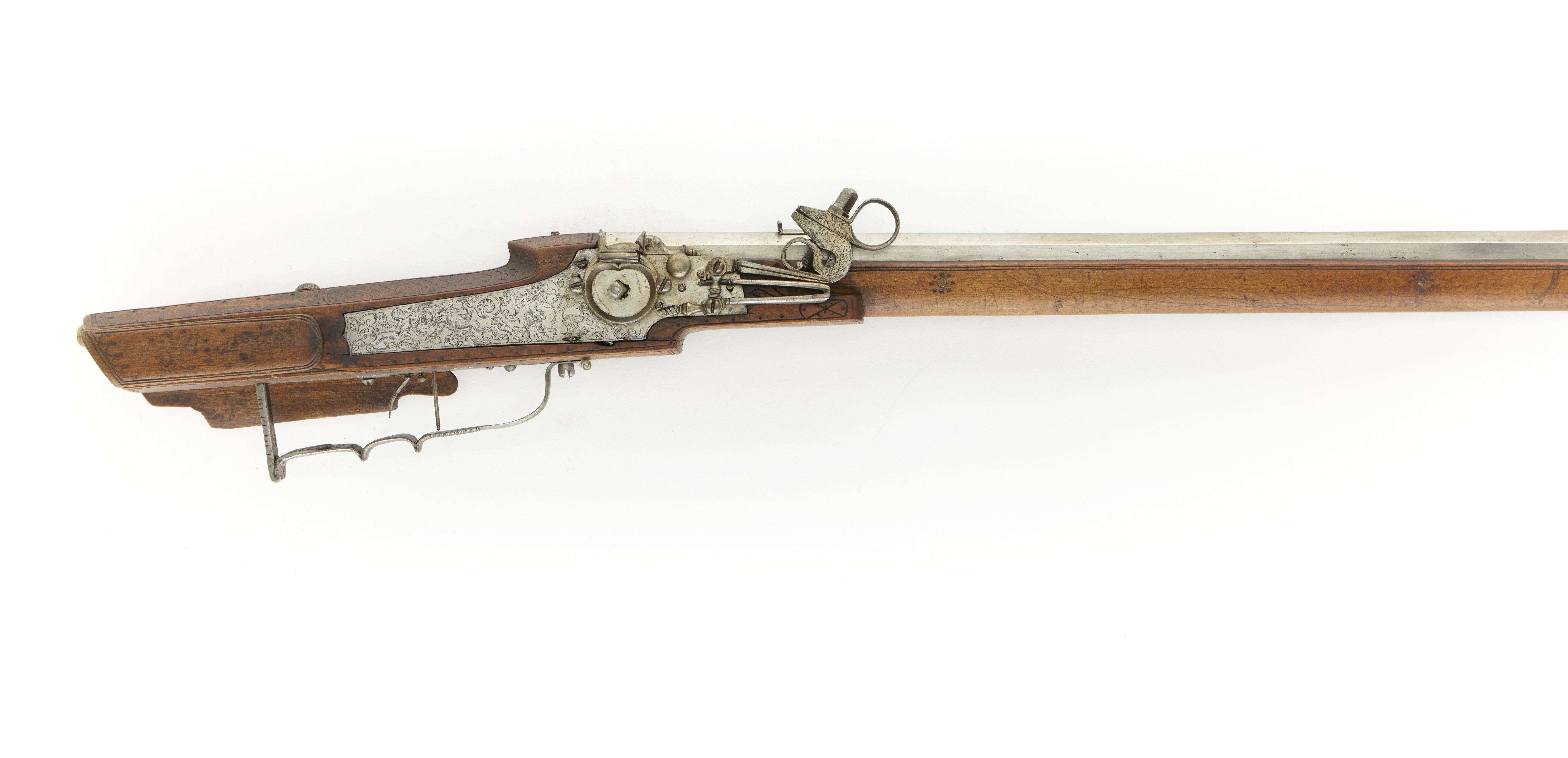 Åttkantig pipa av stål med ståndsikte av stål, stolpkorn av koppar. Över kammaren inslaget "B G"? och på kammaren sidor inslaget treflikigt blad, tre gånger. Tre häften. Hjullås med plant låsbleck av stål med etsad dekor med en jaktscen och växtslingor. Hjulet fastskruvat med ring kl. 3 och kl. 9. Fängpannelocket har etsad dekor. Rund tryckknapp. Hane med lös överkäke med ringformat fingergrepp. Etsad hanhals i s - form. Brun helstock av trä med kolv av tysk typ, med kolvlåda med lock av trä. Stödkula av ben. Dekor av punsade stjärnor på kolven och runt pipstiften. Förgylld stålspik på kolvryggen. Kolvens mittparti har punsad fjälldekor. Täckt laddstocksränna. Rörka av mässing, näsband av mässing. Varbygel av stål med 2 fingerlägen. Avtryckare med snällare. Tillbehör: saknas. Märkt: 427 ovanför låsblecket, stanstyp 5376. 6 på anslaget med blyerts. 1710 års inventarium p. 16 rum II: "91 - 427 - 1 Reflebyssa blanck, rijstat lååss på gl. Mod. - 8 -".