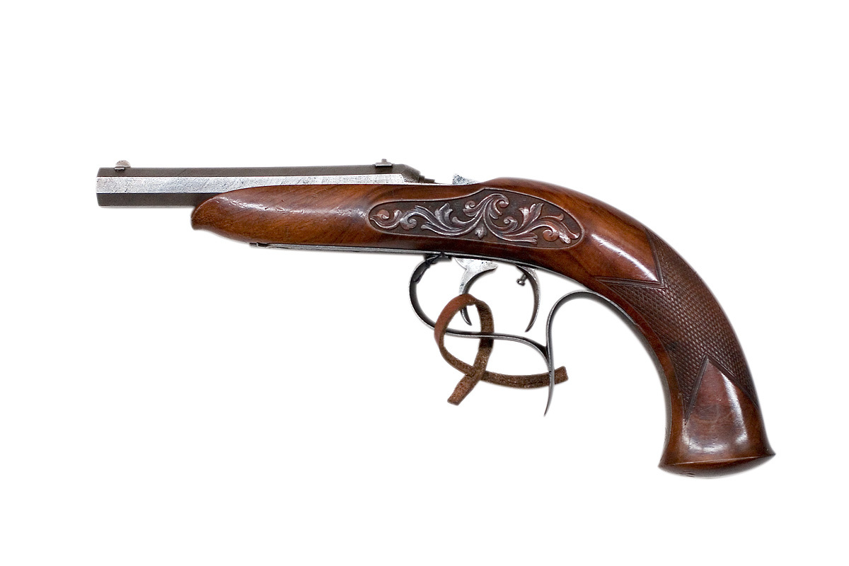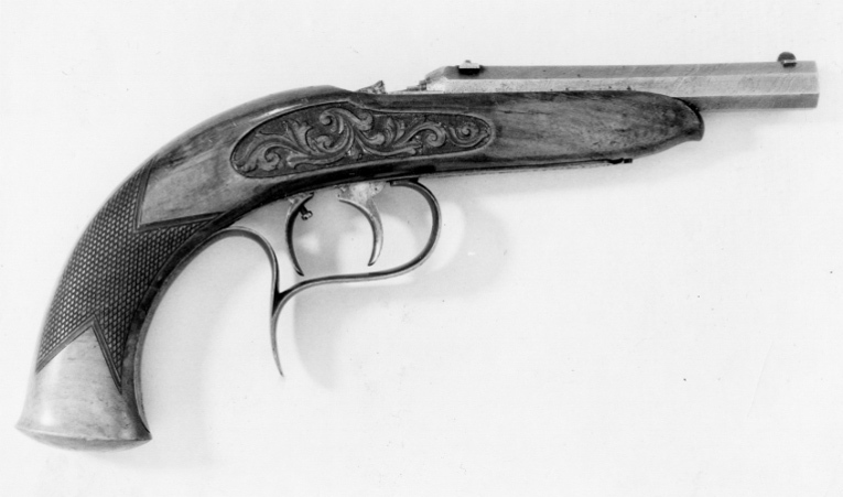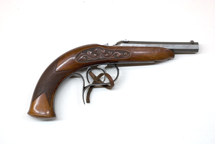 Finräfflad, åttsidig pipa av damaskerat stål. Nippeln är fäst i pipans bakre del. Ingen signering på undersidan. Riktmedel: Blånerat sikte av stål, stolpkorn av stål. Slaglås placerat invändigt i stocken, nedsänkt slagarm. En spännare och avtryckare. Stock av valnöt med böjd kolv, på båda sidor om kammaren snidad bladdekor mot punsad botten.Varbygel av stål med rak, bakre del, graverad rankdekor på bygel och främre arm. Tillbehör: Läderrem med slitsar i vardera änden fäst i varbygeln, l: 132 mm.