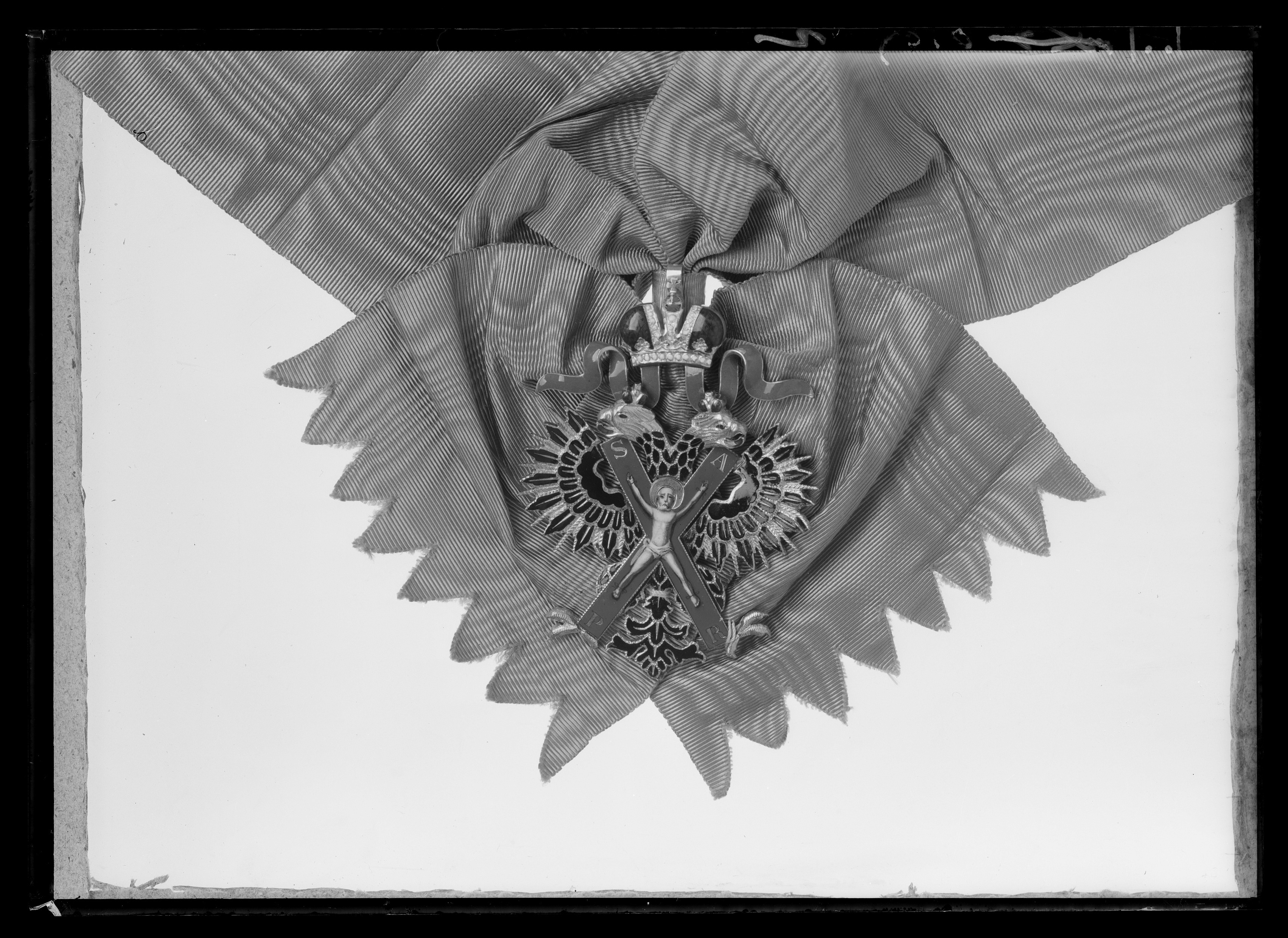 Svartemaljerad, med rödemaljerade kejsarkronor krönt dubbelörn av guld. På bröstet ett på framsidan blåemaljerat malteserkors av guld, på korsmitten en polykrom emaljmålning av S:t Andreas med gloria av guld, naturliga färger, vitt höftskynke. På korsändarna i guld: "S A P R" (Sanctus Andreas Patronus Russiae). På örnens rygg ett vitemaljerat band med svart rysk text: ZA VERU I VERNOST (för tro och trohet). På baksidan av örnens huvuden två ringar, däri fäst med ovala länkarfladdrande, blåemaljerade band, nedhängande från den ryska kejsarkronan av guld samt röd, vit och ljusblå emalj. På kronans baksida en bandbygel av guld. På bygeln stämplat: den ryska dubbelörnen, otydlig stämpel med två ankare och spira (S:t Petersburg), WK, 56. På övre korsarmarnas baksidorstämplat: dubbelörnen och WK.